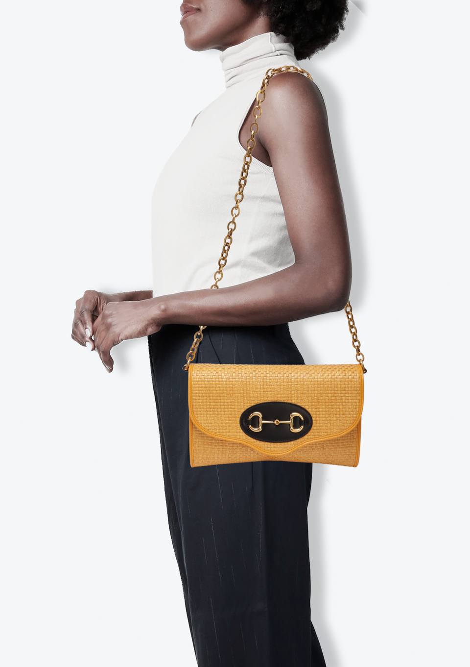 Descrição do Material: Ráfia amarela com detalhes em couro calfskin amarelo e preto