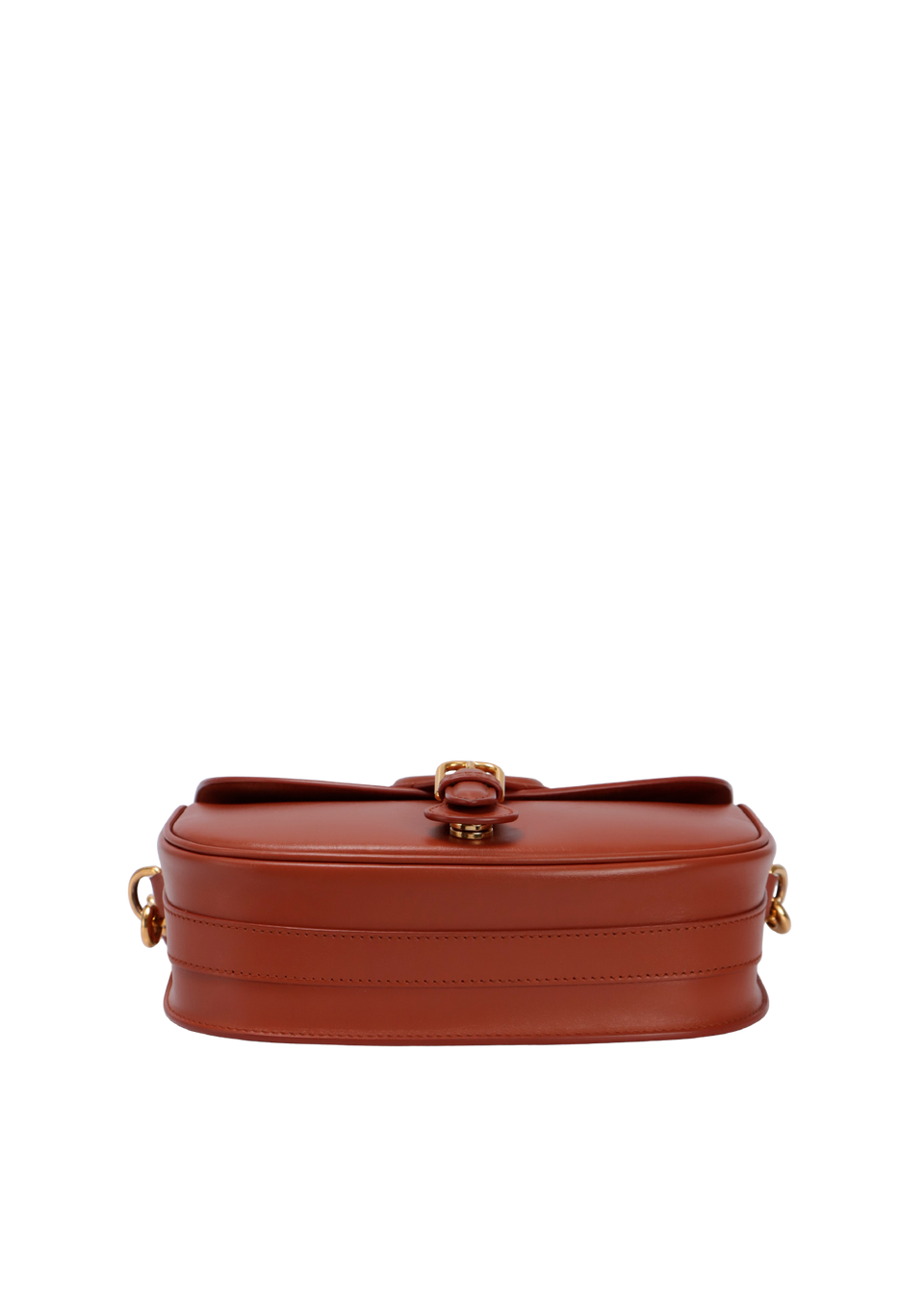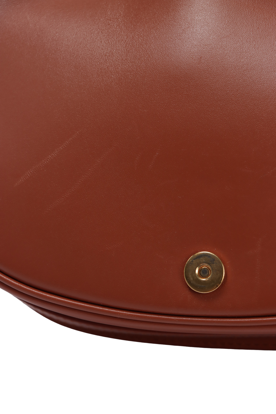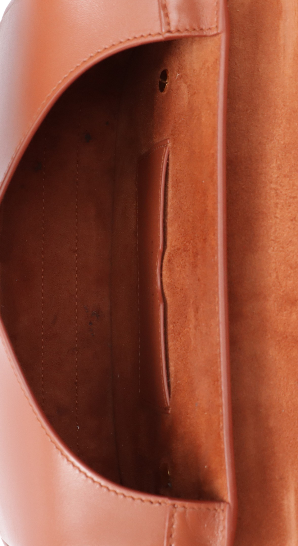 Bom, com aparência de usado. Apresenta leves marcas de uso pelo couro, principalmente na parte inferior central frontal e na parte superior da aba, pequenas marcas de uso nas ferragens dos detalhes frontais e nos detalhes da alça, leves deformidades pela estrutura na parte inferior da alça do lado esquerdo e na parte central frontal da bolsa, pequenas fissuras e manchas de uso nas selagens, especialmente no acabamento lateral direito e pequenas manchas escurecidas e marcas de uso pela camurça interna.
