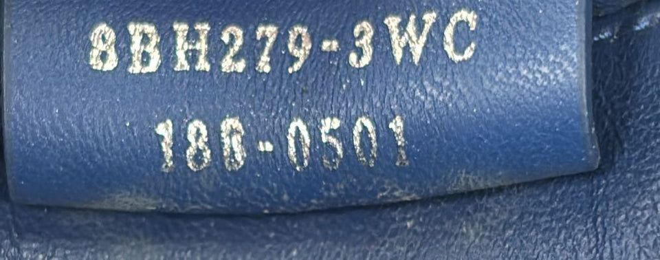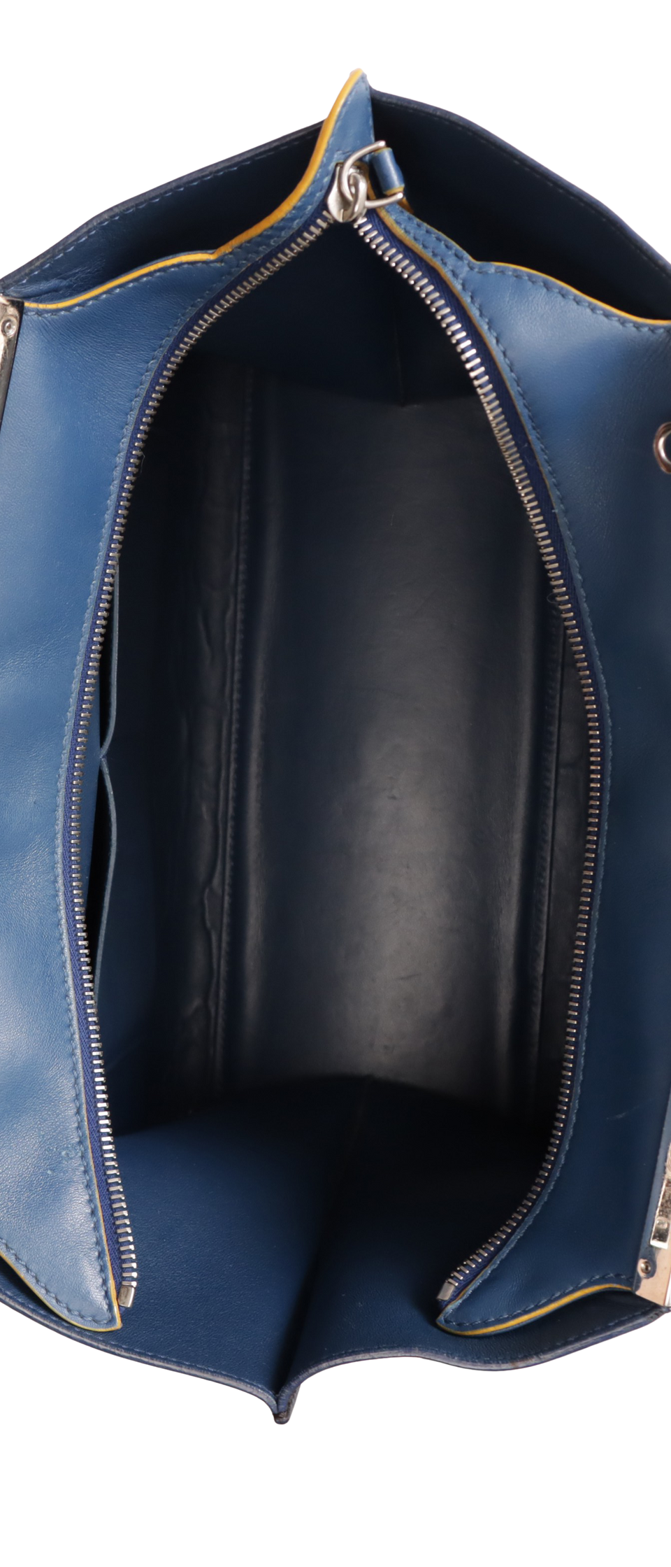Bom, com aparência de usado. Apresenta leves marcas de uso pelo couro, especialmente na parte frontal próximas à tag de couro, pequenos desgastes pelo couro no acabamento superior do fechamento, leve deformaçāo nas estruturas laterais e na parte interna, principalmente do lado esquerdo, pequenas fissuras e aberturas nas selagens superiores e da tira da tag de couro, leves marcas de uso pelas ferragens e personalizaçāo de iniciais em hot stamping na tag de couro.