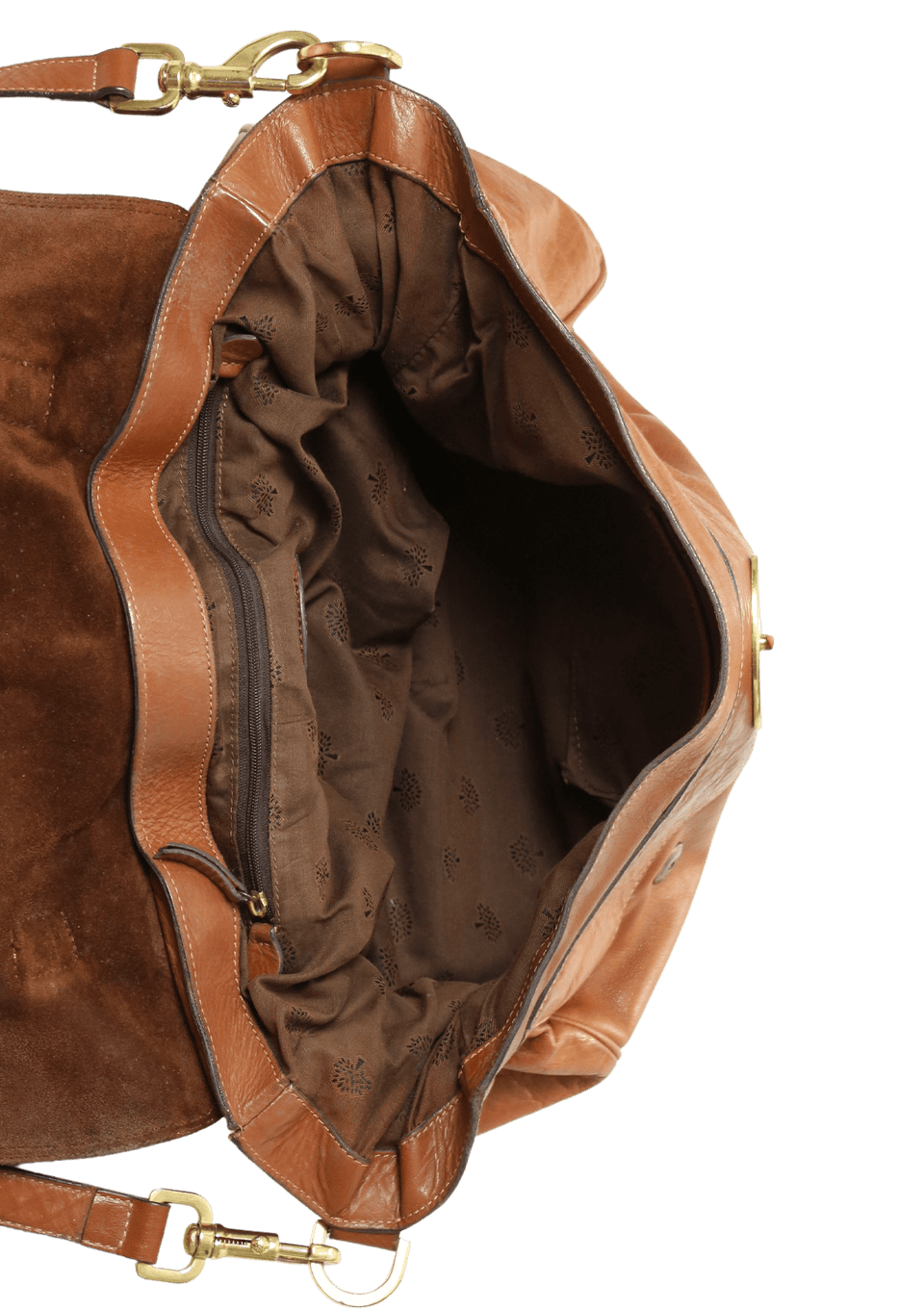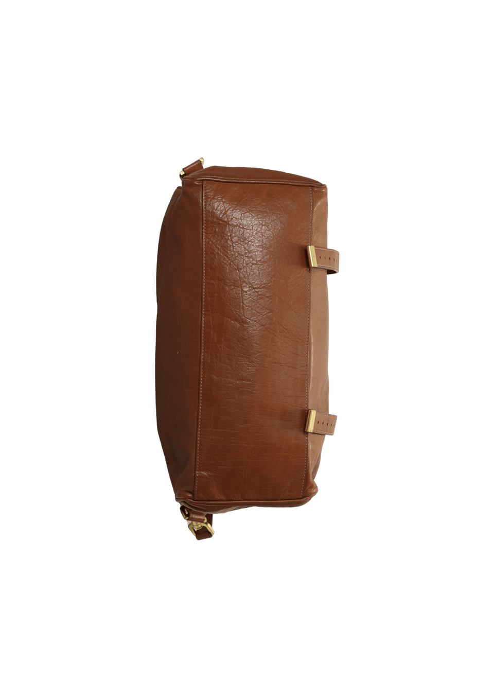 Condição: Bom, com aparência de usado. Couro externo desgastado e com marcas de uso, manchas esbranquiçadas na parte externa, desgaste dos quatro cantos base, desgaste nos acabamentos, ferragem oxidada e com riscos.