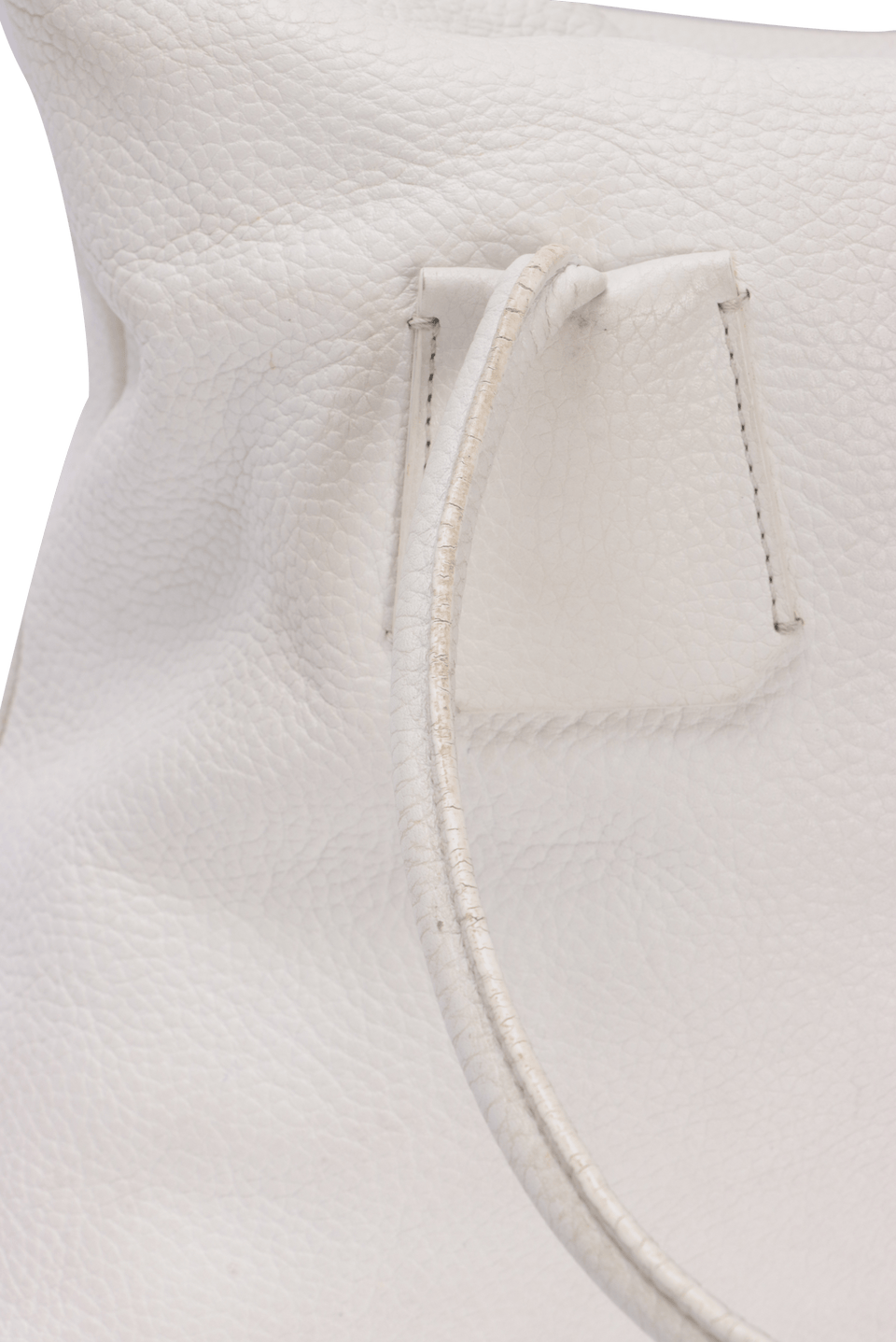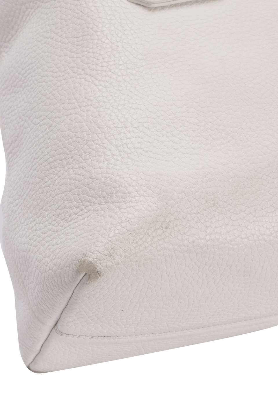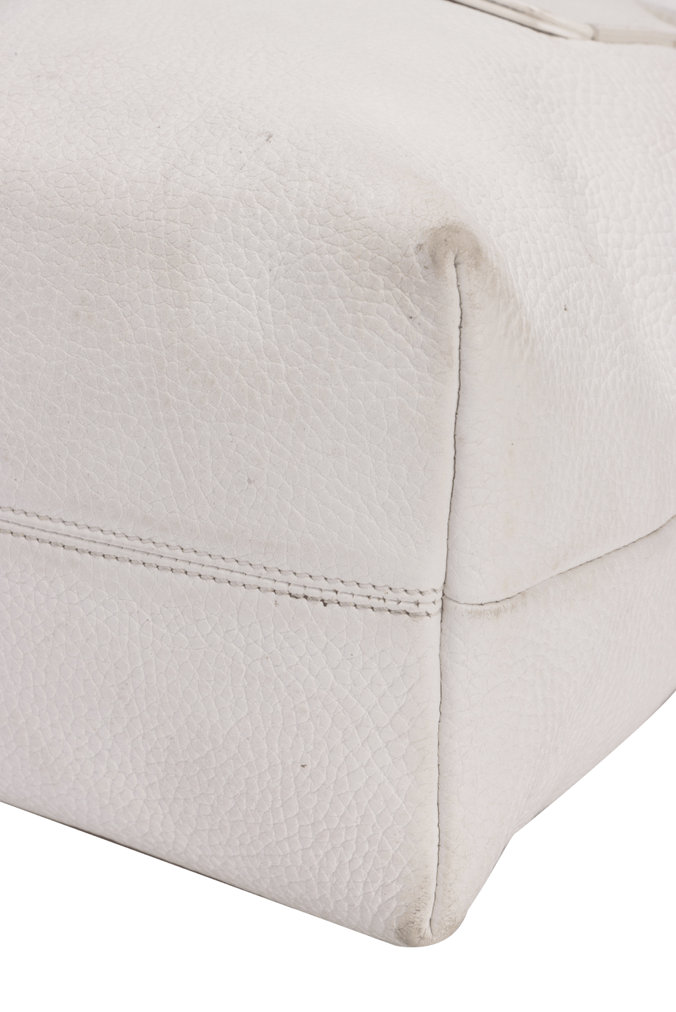 Condição: Regular. Apresenta severos desgastes, marcas de uso, manchas escurecidas e aspecto encardido pelo couro, especialmente na parte frontal superior e nas partes internas das alças, severas fissuras e aberturas nas selagens, principalmente nos acabamentos laterais superiores e nos acabamentos internos das alças, notável perda das estruturas originais das alças e da bolsa, consideráveis desgastes nos cantos da base, notáveis marcas de uso, descolorações e oxidações nas ferragens, especialmente na logo e no cursor interno e consideráveis desgastes e manchas no forro, principalmente na parte frontal.