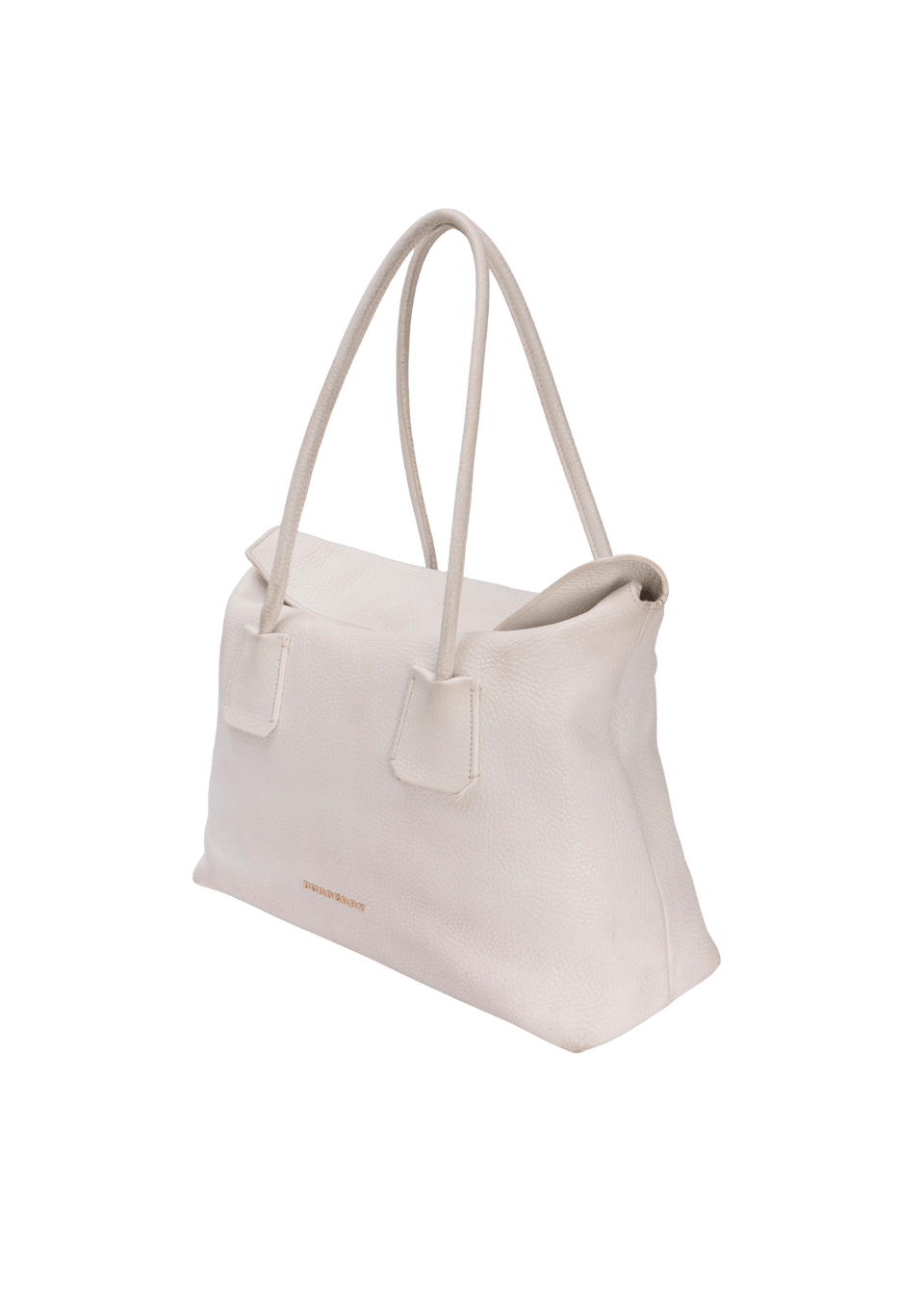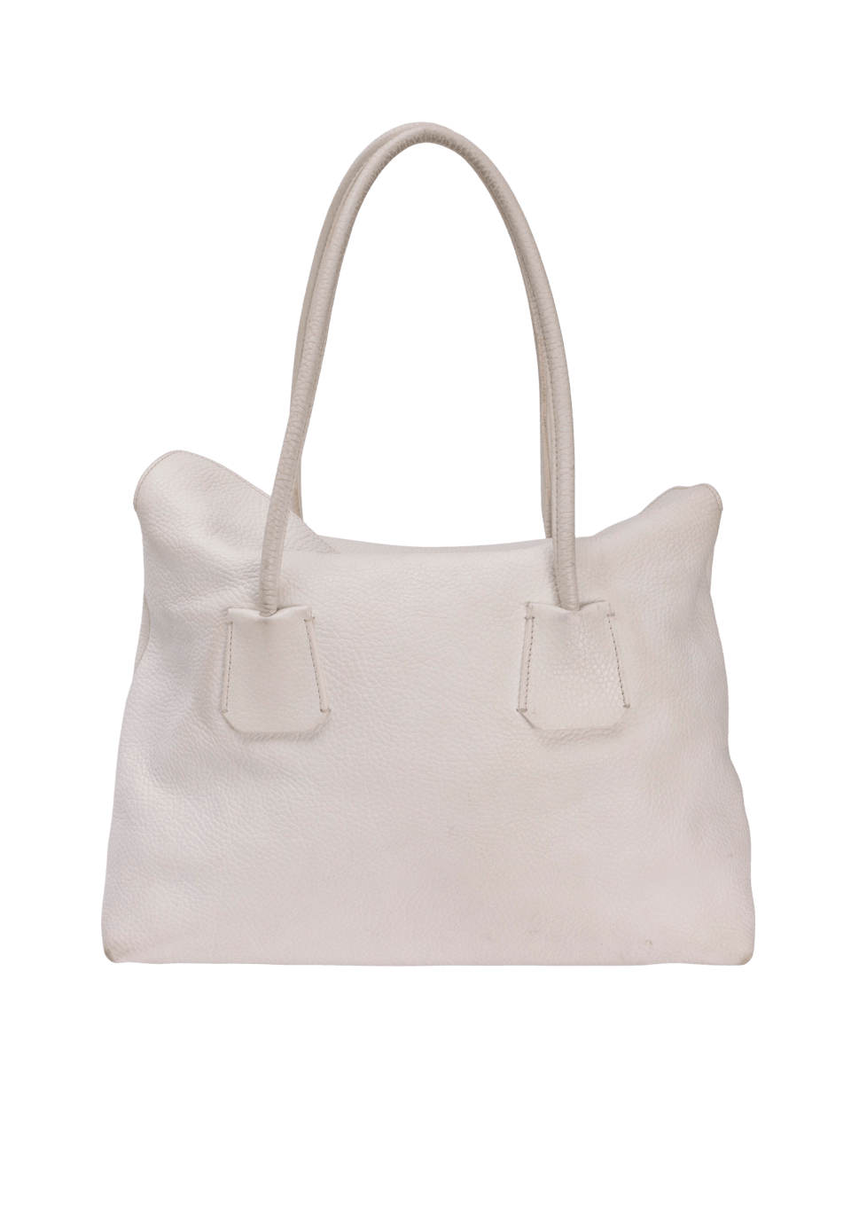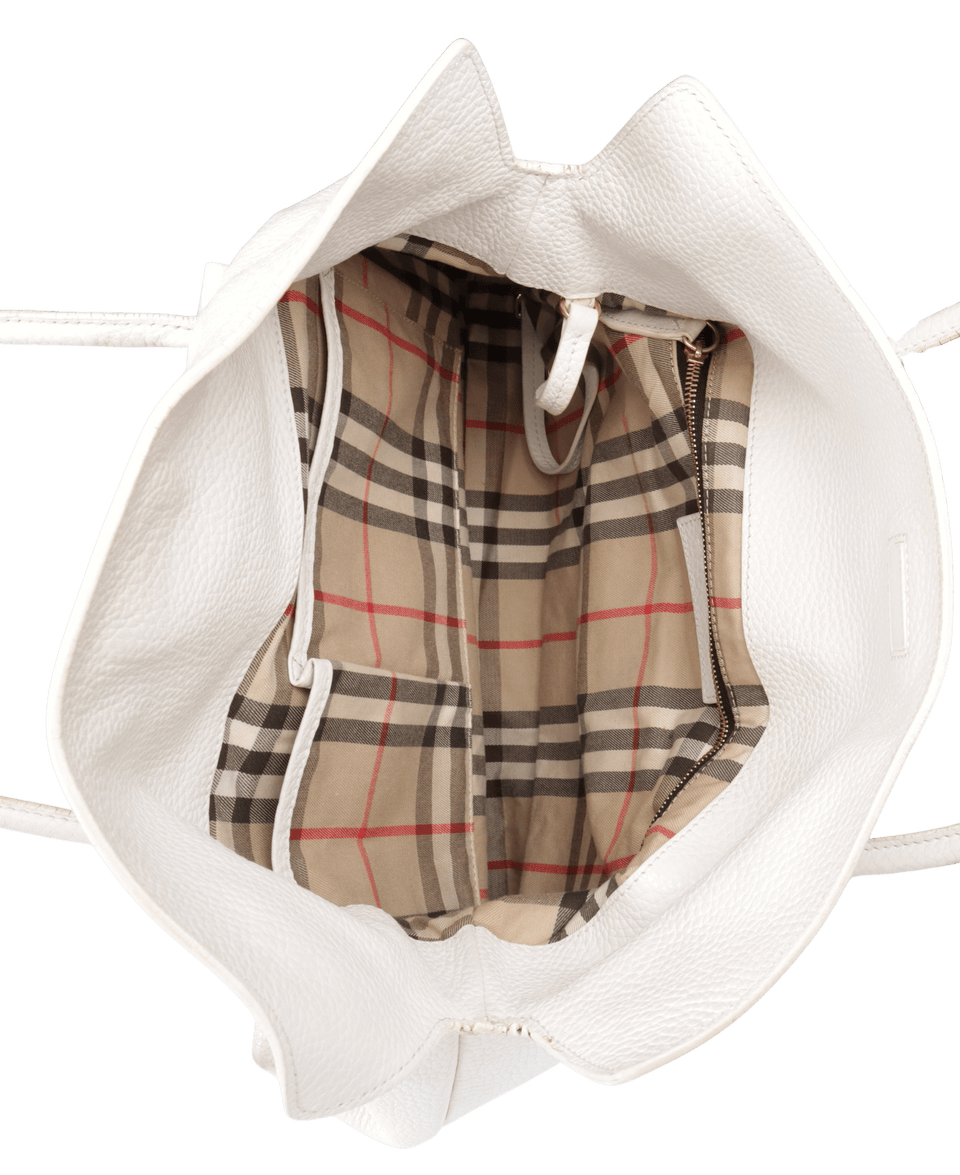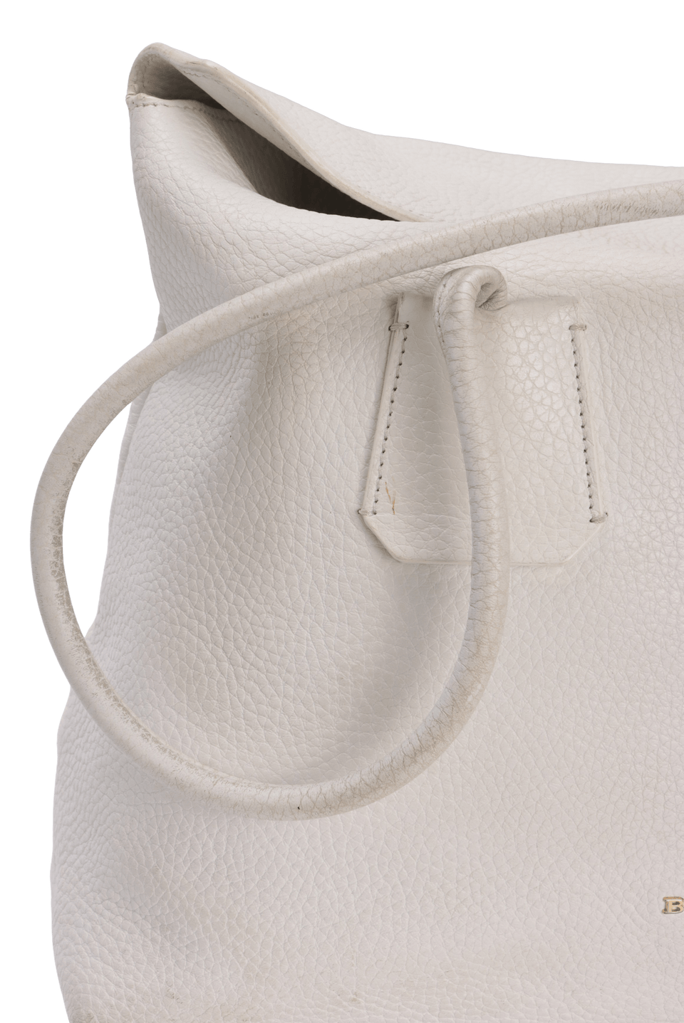 Condição: Regular. Apresenta severos desgastes, marcas de uso, manchas escurecidas e aspecto encardido pelo couro, especialmente na parte frontal superior e nas partes internas das alças, severas fissuras e aberturas nas selagens, principalmente nos acabamentos laterais superiores e nos acabamentos internos das alças, notável perda das estruturas originais das alças e da bolsa, consideráveis desgastes nos cantos da base, notáveis marcas de uso, descolorações e oxidações nas ferragens, especialmente na logo e no cursor interno e consideráveis desgastes e manchas no forro, principalmente na parte frontal.