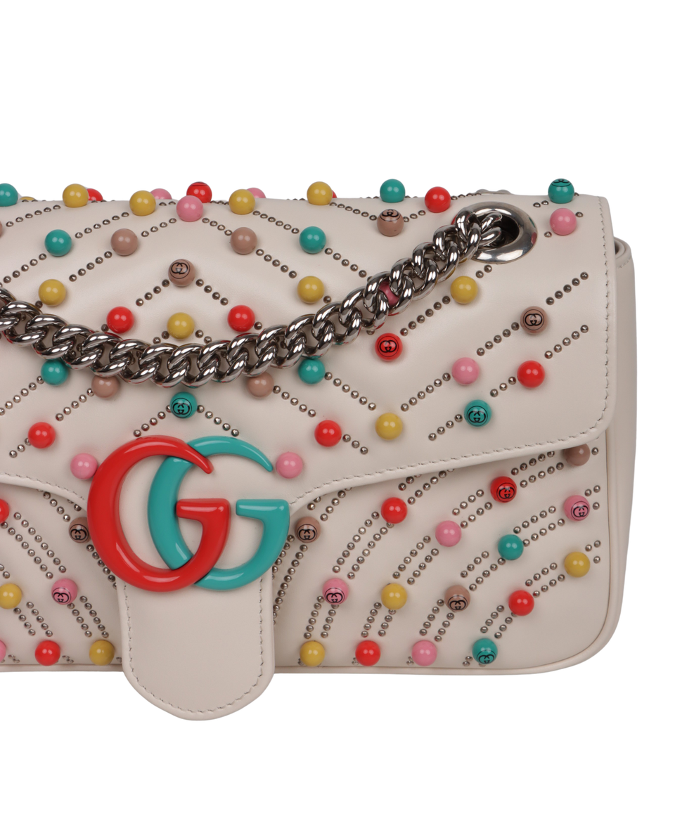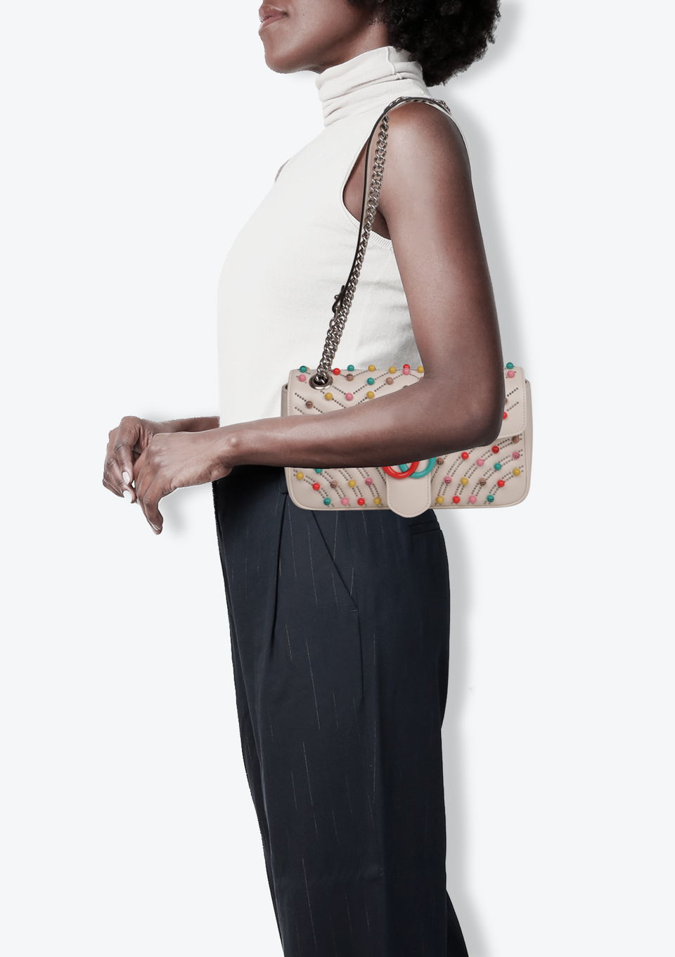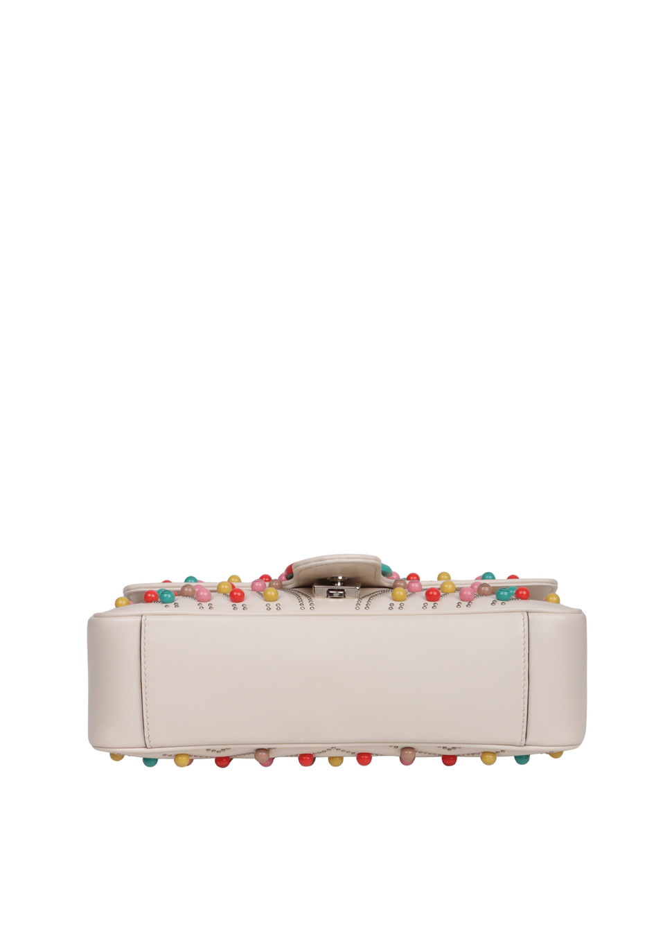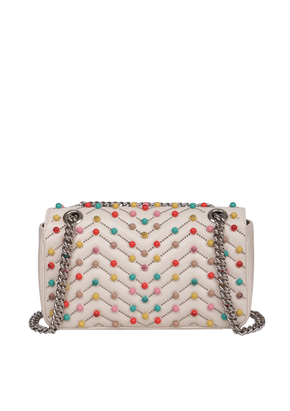 Descrição do Material: Couro calfskin off white com acabamento matelassê chevron e contas coloridas aplicadas