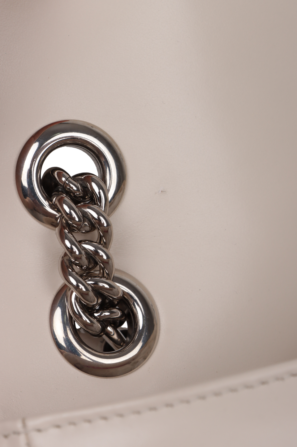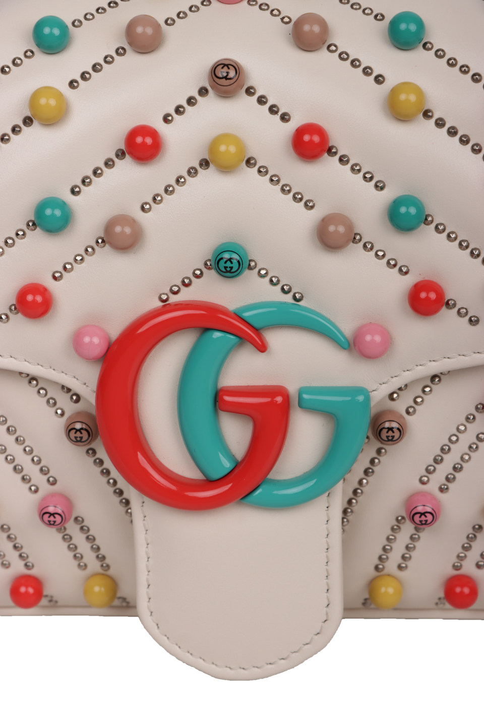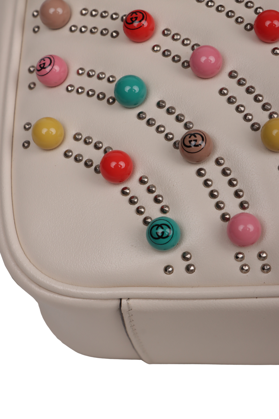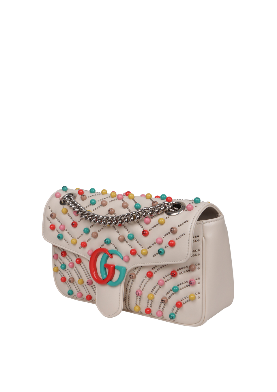 Descrição do Material: Couro calfskin off white com acabamento matelassê chevron e contas coloridas aplicadas