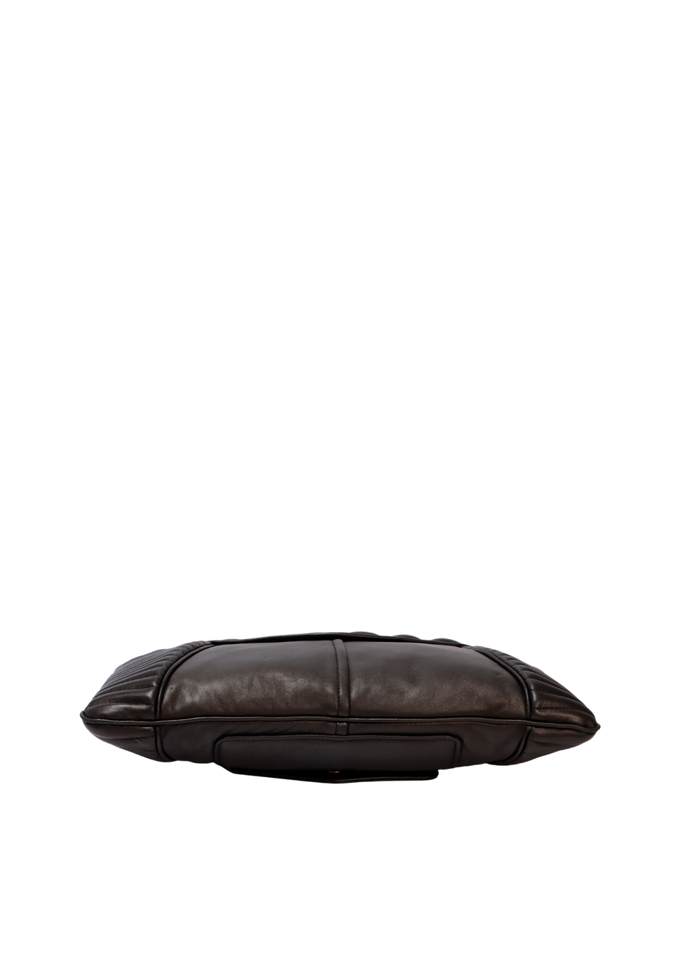Bom, com aparência de usado. Apresenta leves marcas de uso pelo couro, especialmente na parte frontal inferior do lado esquerdo, pequenos desgastes pelos cantos da base, leves marcas de uso e descolorações pelas ferragens e pequenas manchas esbranquiçadas pela parte interna.