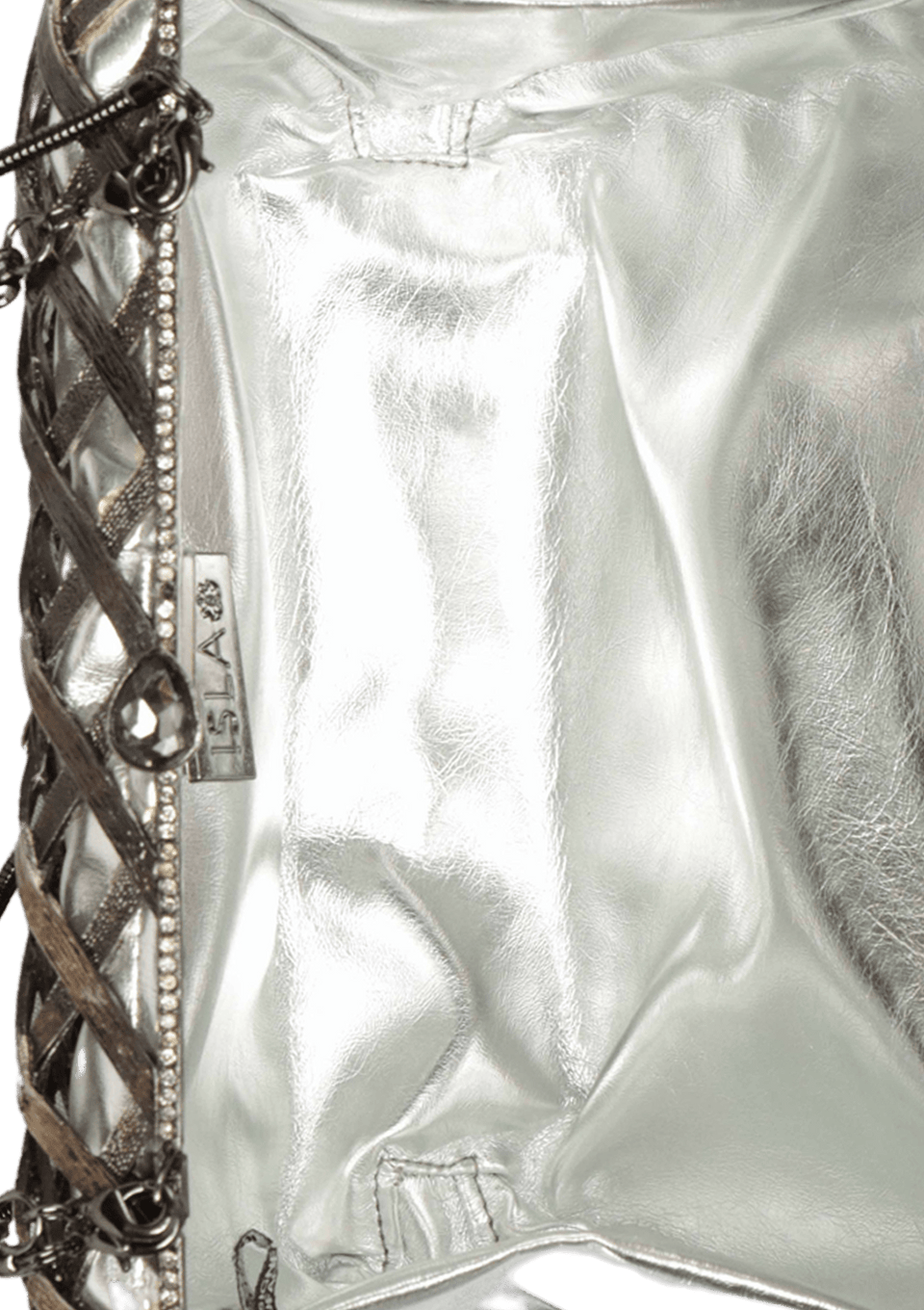 - Couro prateado e aplicação de cristais na cor chumbo, preto e verde;