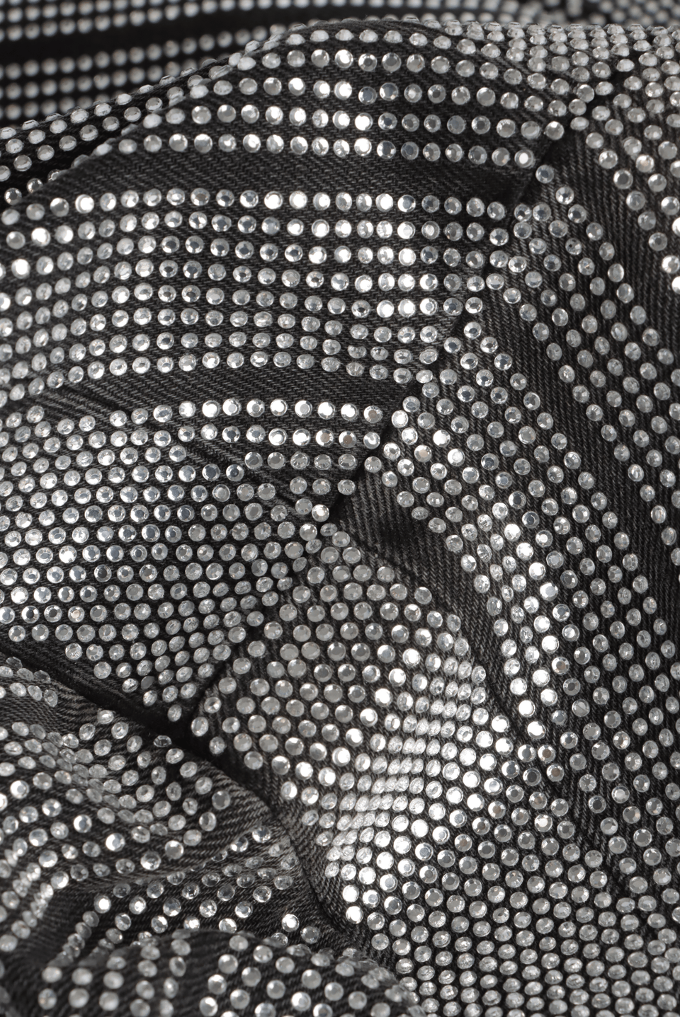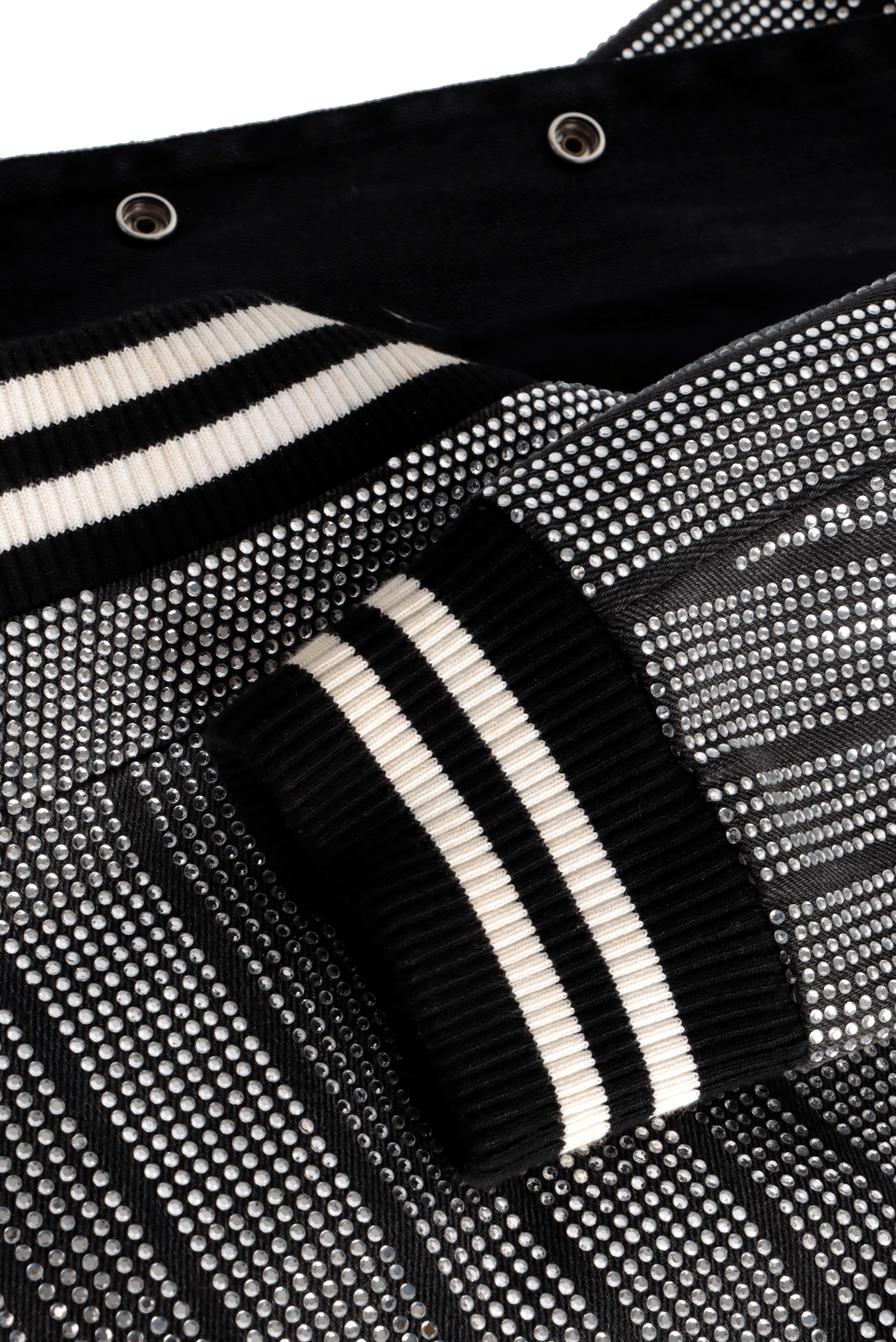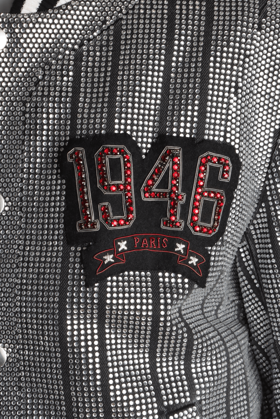 Descrição do Material: Denim cinza com detalhes em elástico preto e branco e aplicações de cristais transparentes e patch preto e vermelho