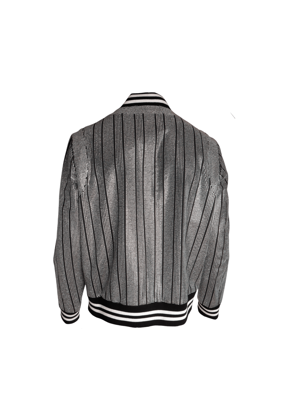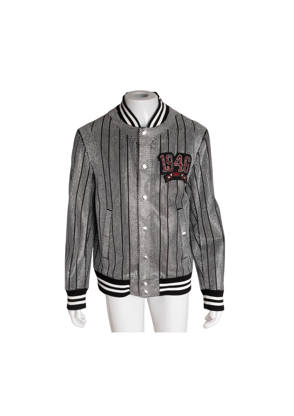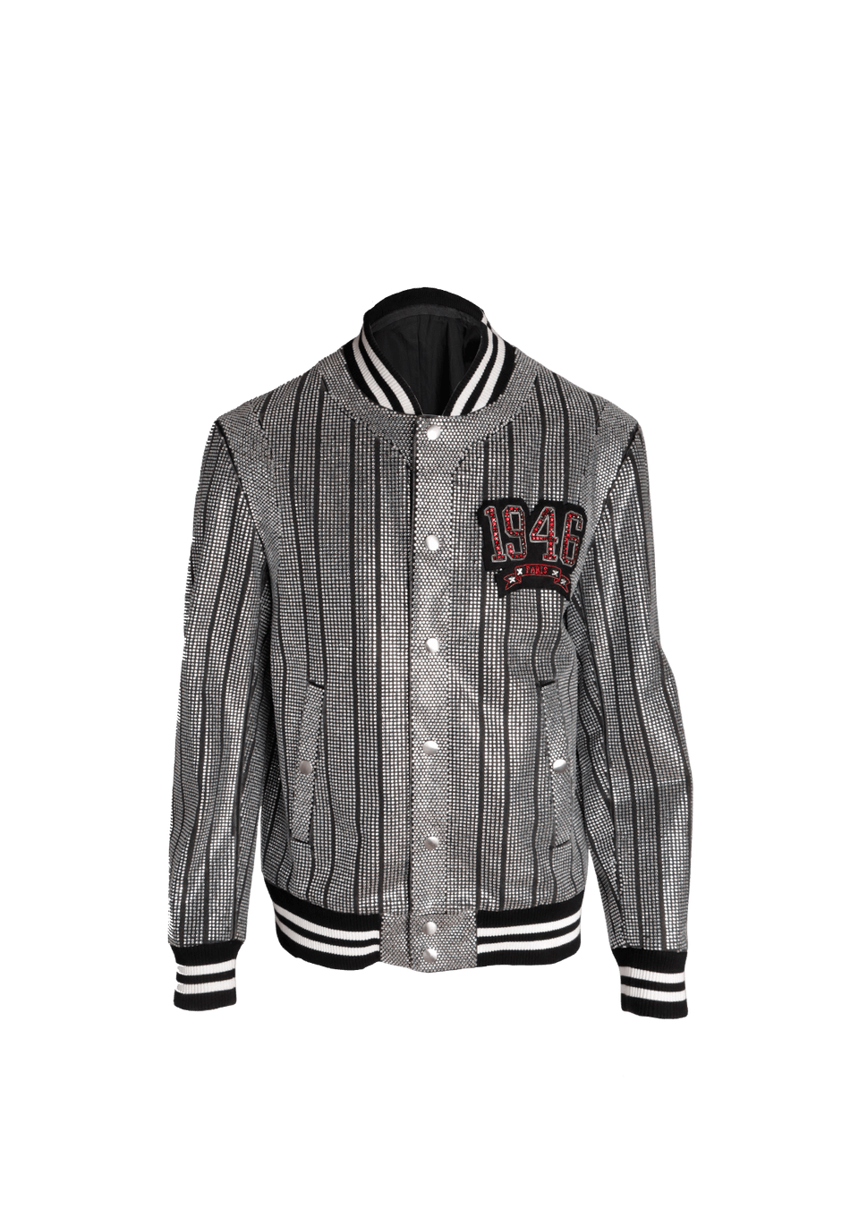 Descrição do Material: Denim cinza com detalhes em elástico preto e branco e aplicações de cristais transparentes e patch preto e vermelho