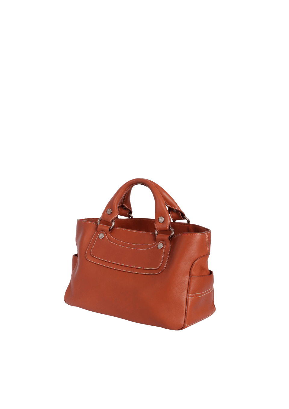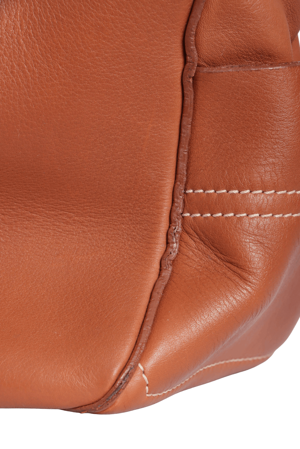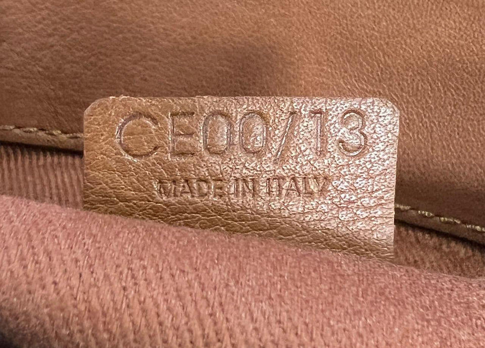 Condição: Regular. Apresenta consideráveis fissuras e desgastes pelos acabamentos, especialmente nos cantos da base, laterais e das alças, severa deformaçāo na parte inferior da peça, notáveis manchas de oxidaçāo pelas ferragens, consideráveis manchas escurecidas pelo couro nas extremidades e centro das alças, notável ressecamento do couro, consideráveis manchas esbranquiçadas pelo forro e notável odor de item armazenado.