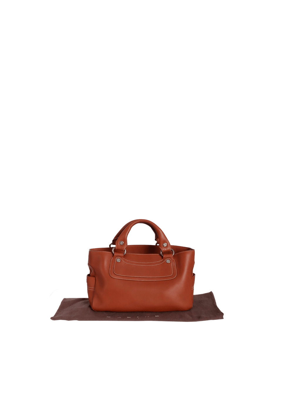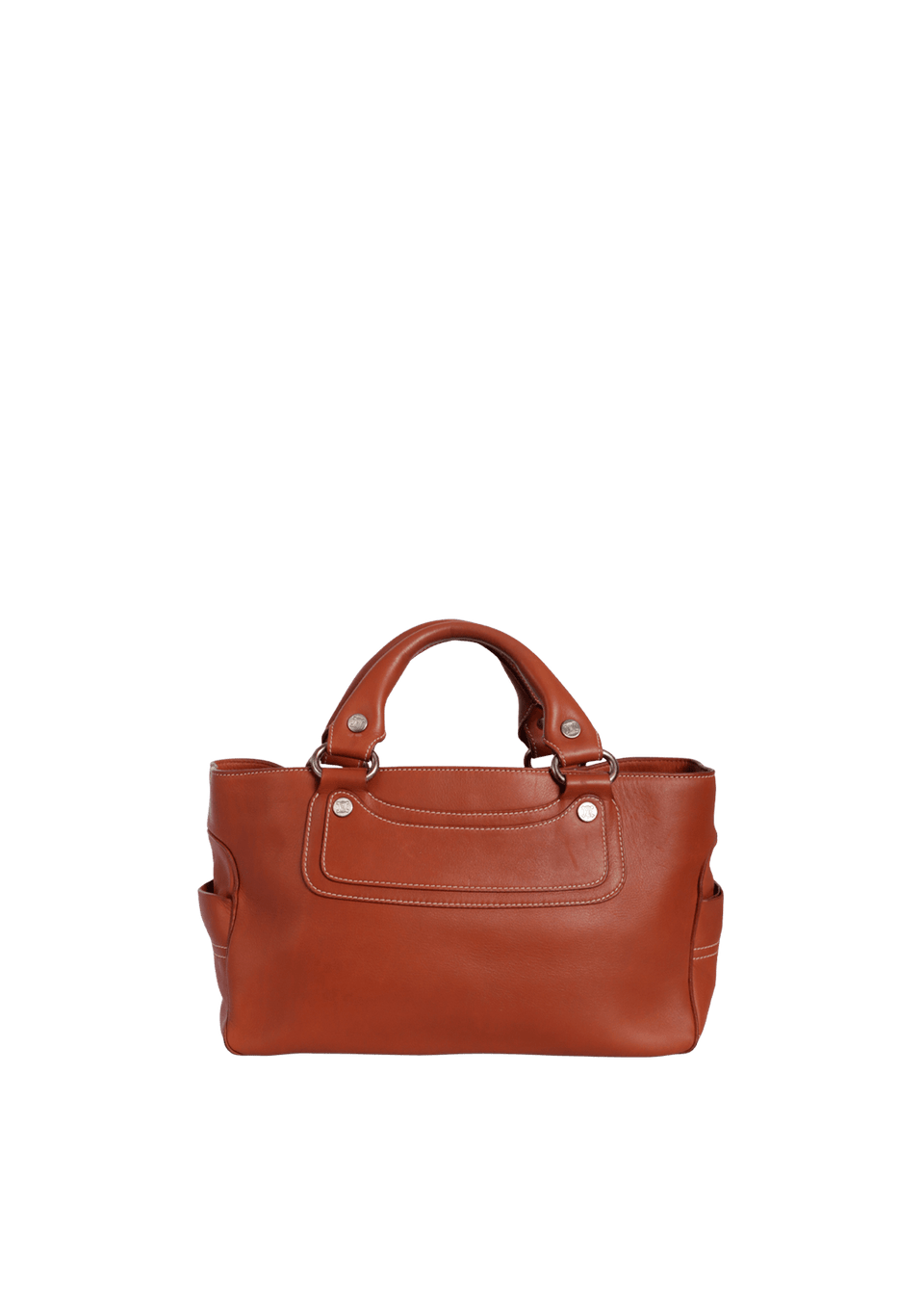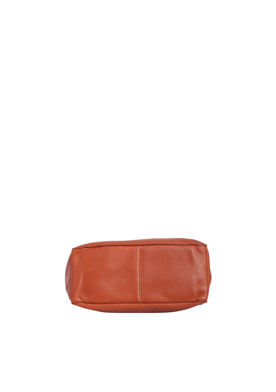 Condição: Regular. Apresenta consideráveis fissuras e desgastes pelos acabamentos, especialmente nos cantos da base, laterais e das alças, severa deformaçāo na parte inferior da peça, notáveis manchas de oxidaçāo pelas ferragens, consideráveis manchas escurecidas pelo couro nas extremidades e centro das alças, notável ressecamento do couro, consideráveis manchas esbranquiçadas pelo forro e notável odor de item armazenado.