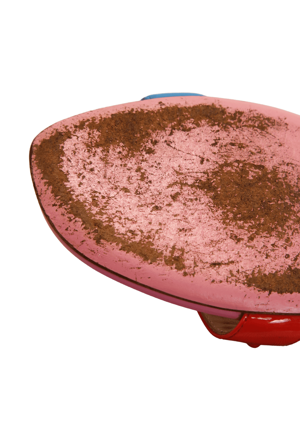 - Couro e verniz, nas cores rosa, azul, branco e laranja.