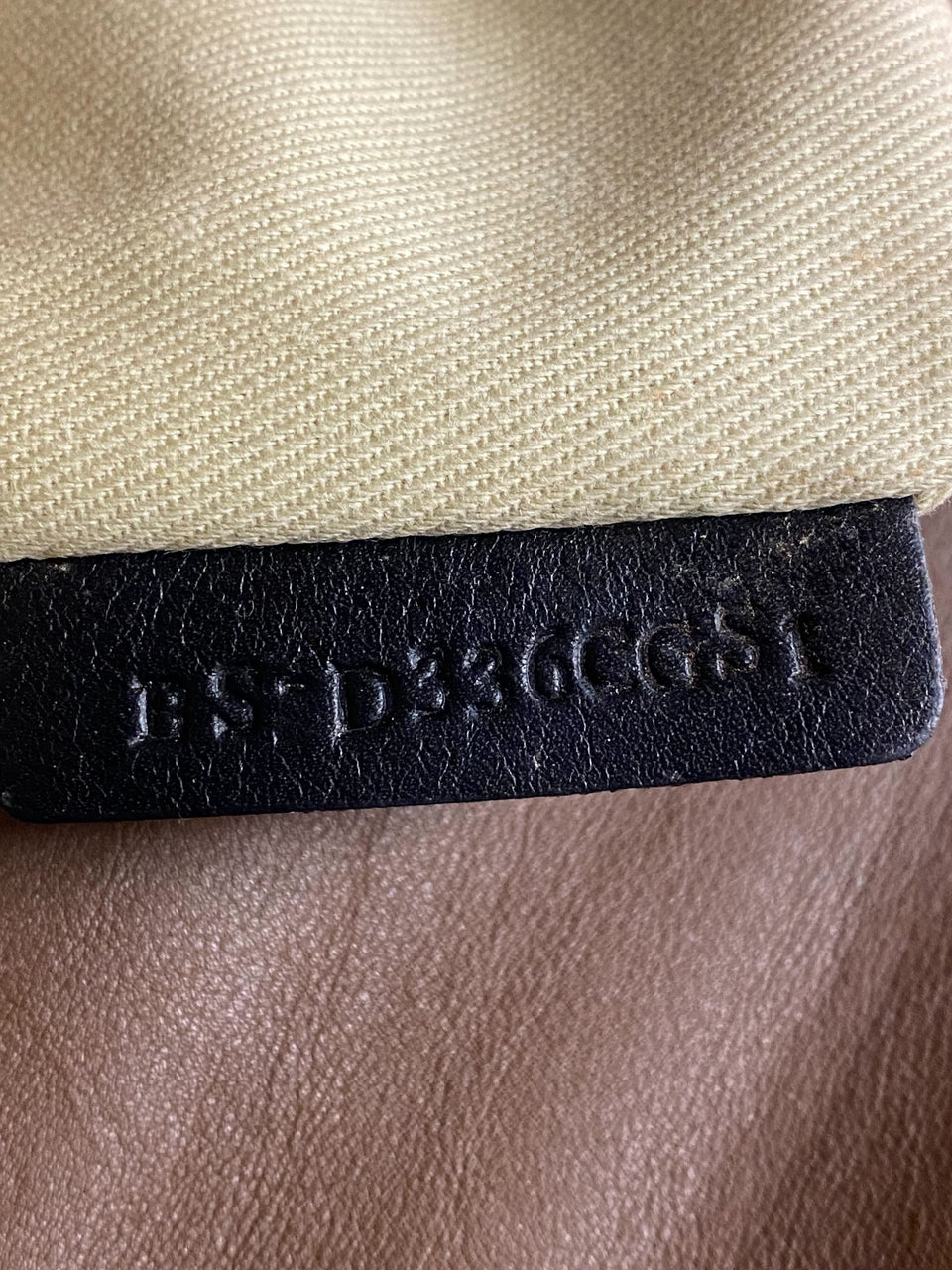 Condição: Regular. Apresenta severos desgastes no pony hair, especialmente dos cantos inferiores e na parte posterior, notáveis fissuras nas selagens, consideráveis desgastes no couro da parte interna da aba, notáveis desgastes nas ferragens, considerável deformação na estrutura, principalmente nas laterais e notáveis marcas de uso no forro, especialmente manchas esbranquiçadas e escurecidas.