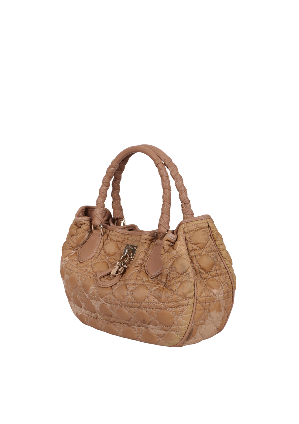 Regular. Apresenta severas manchas de uso e desgastes pelo tecido, especialmente do lado direito frontal, parte central da base, lateral superior direita e parte superior de trás, notáveis deformidades pela estrutura, principalmente na parte superior do lado direito frontal e nas partes inferiores das laterais, consideráveis descolorações, oxidações e marcas de uso nas ferragens das alças, no detalhe central frontal e no botão magnético, severos desgastes nos detalhes em couro, especialmente na parte superior, cantos da base, partes centrais das alças e nos acabamentos superiores da frente e de trás, notáveis fissuras nas selagens das partes inferiores das alças e nos acabamentos superiores da frente e de trás e consideráveis manchas de uso pelo forro.