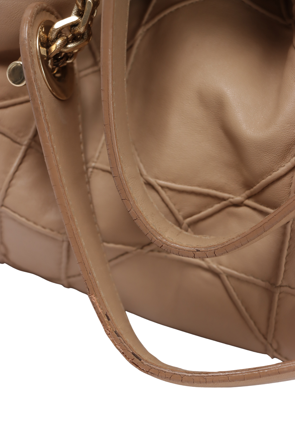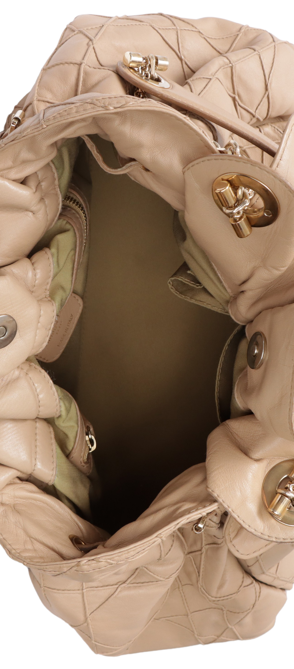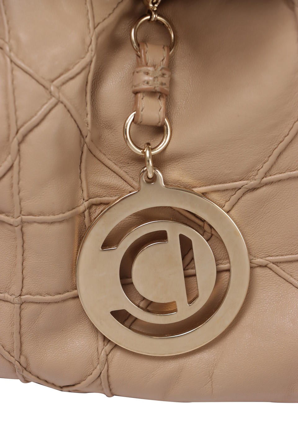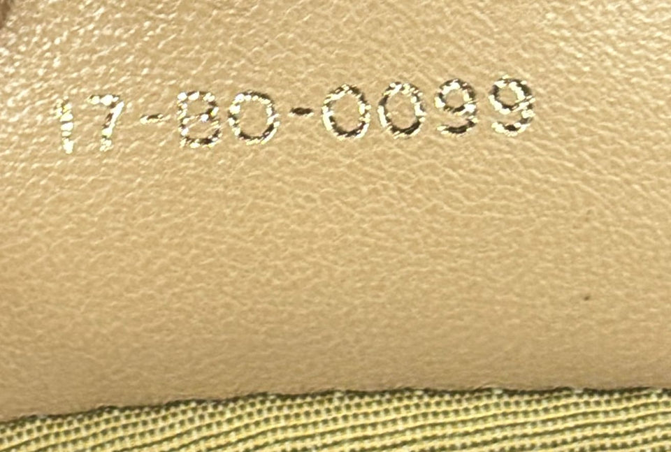 Bom, com aparência de usado. Apresenta leves manchas escurecidas, marcas de uso e desgastes pelo couro, principalmente nos cantos da base, parte inferior frontal, base e lado direito de trás, pequenas marcas de uso, oxidações e descolorações nas ferragens, especialmente nos detalhes superiores, das alças e no charm frontal, pequenas fissuras nas selagens das tiras de couro das alças, leves deformidades pela estrutura das tiras de couro das alças e leves manchas de uso pelo forro.