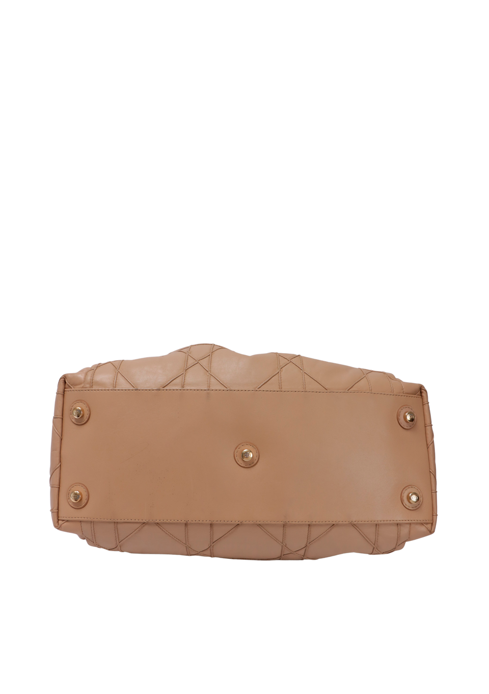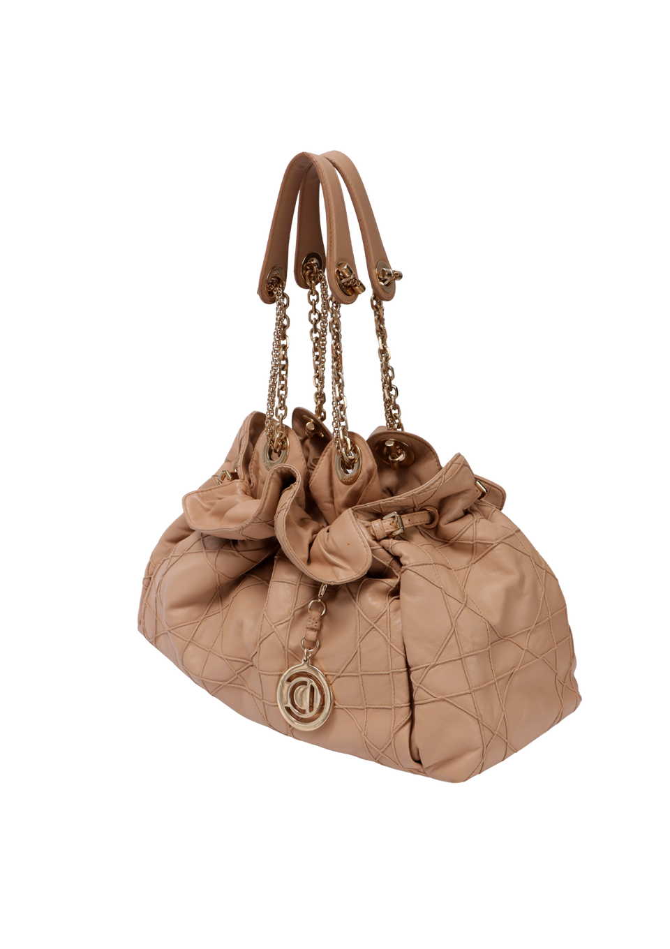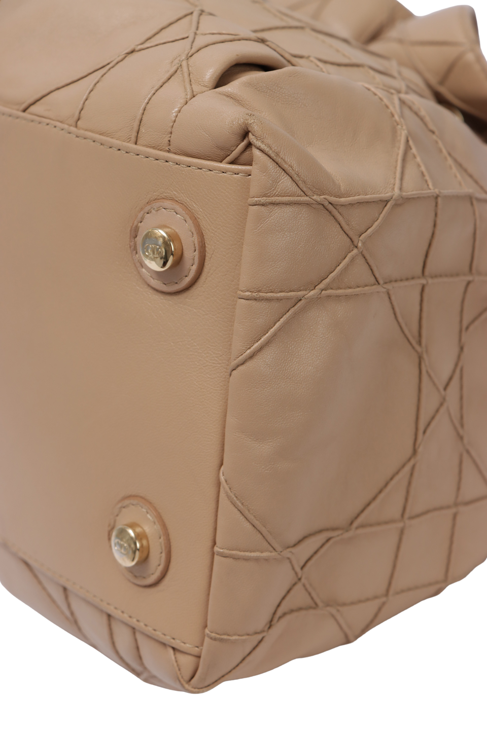 Bom, com aparência de usado. Apresenta leves manchas escurecidas, marcas de uso e desgastes pelo couro, principalmente nos cantos da base, parte inferior frontal, base e lado direito de trás, pequenas marcas de uso, oxidações e descolorações nas ferragens, especialmente nos detalhes superiores, das alças e no charm frontal, pequenas fissuras nas selagens das tiras de couro das alças, leves deformidades pela estrutura das tiras de couro das alças e leves manchas de uso pelo forro.