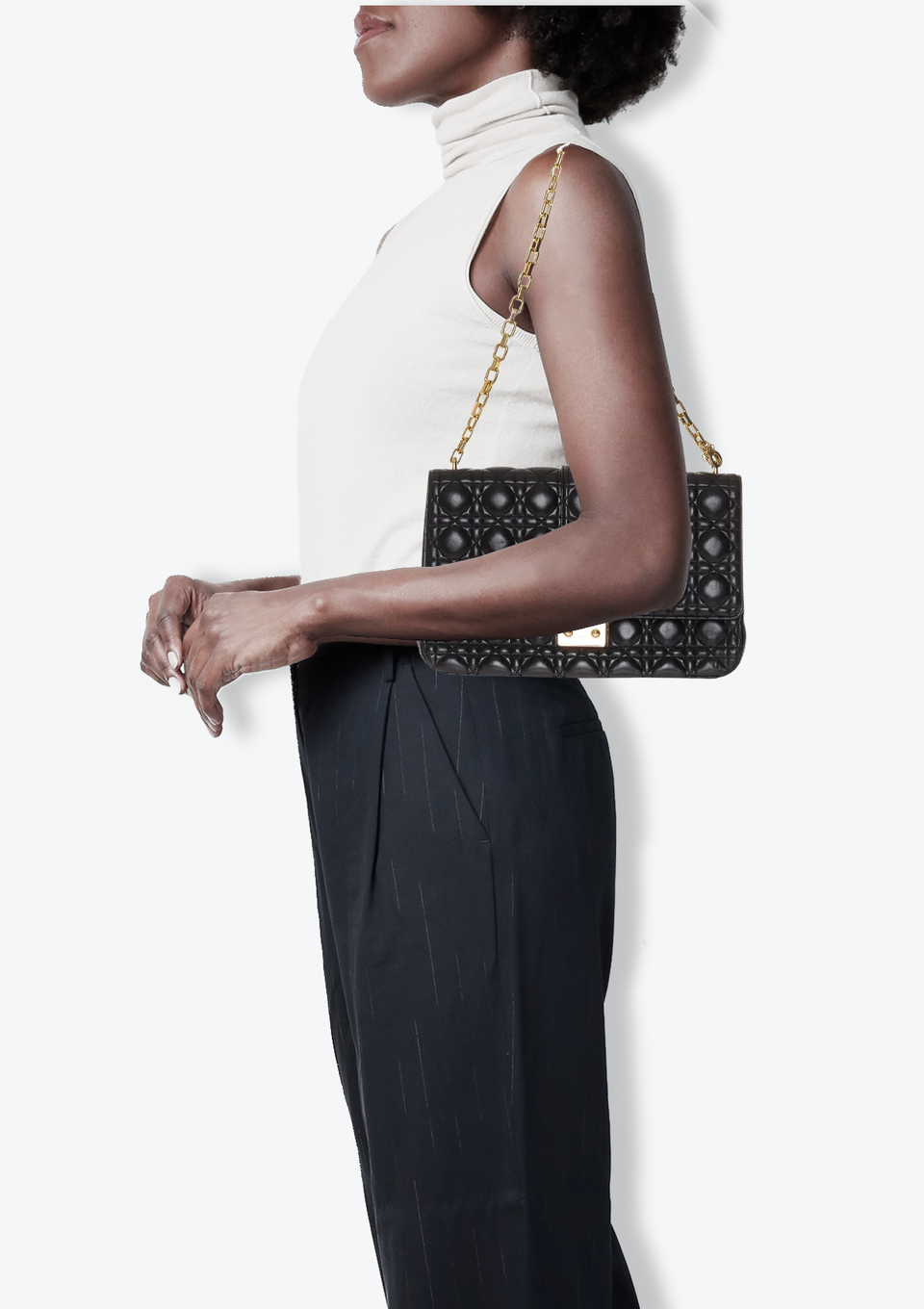 Descrição do Material: Couro lambskin preto com acabamento matelassê e Cannage
