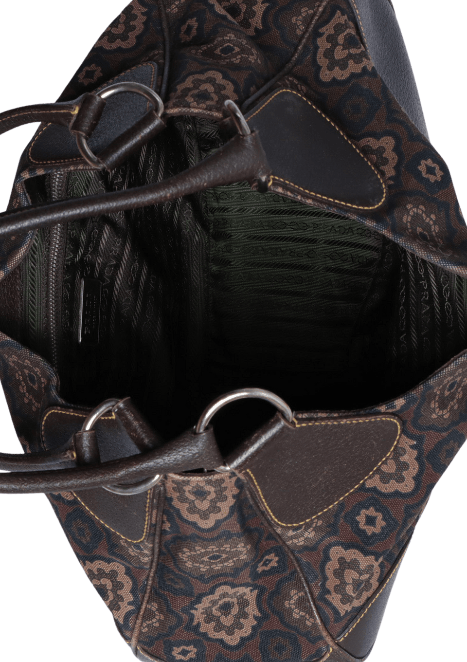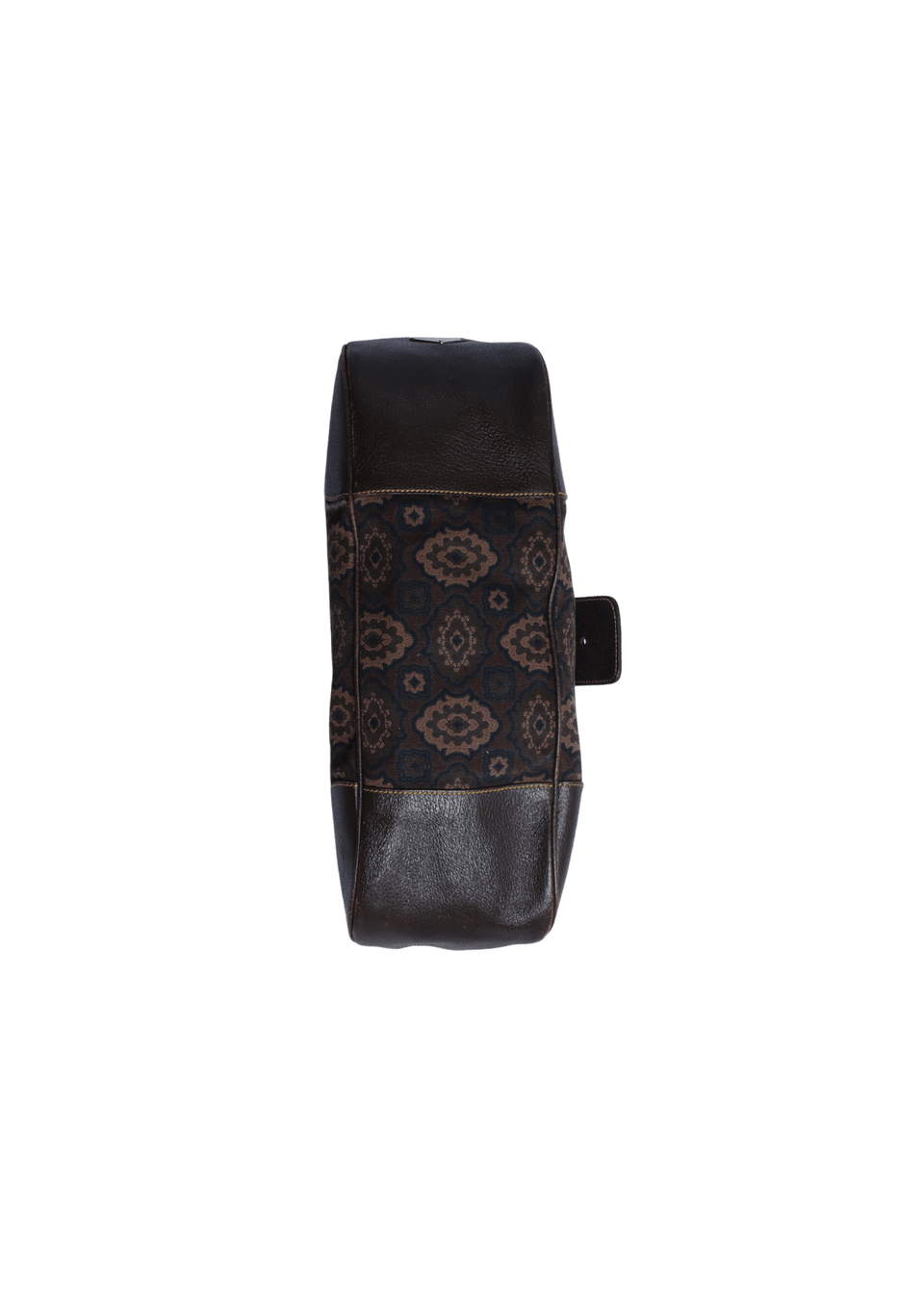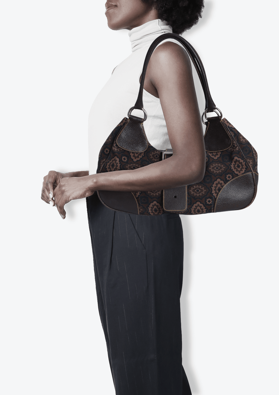 - Tecido marrom com estampa floral e couro calfskin marrom;