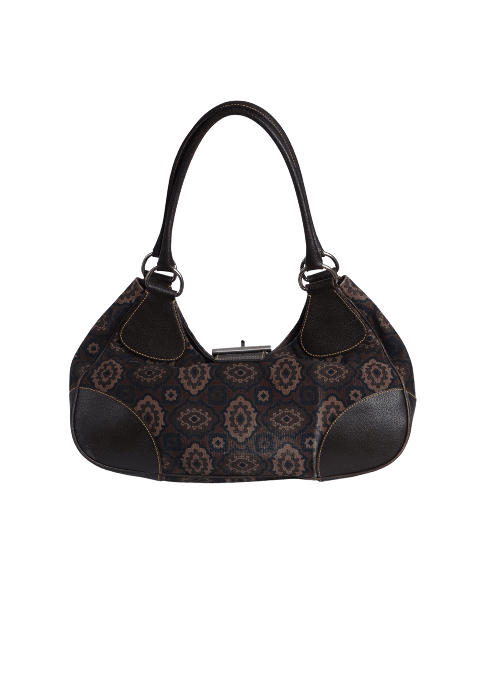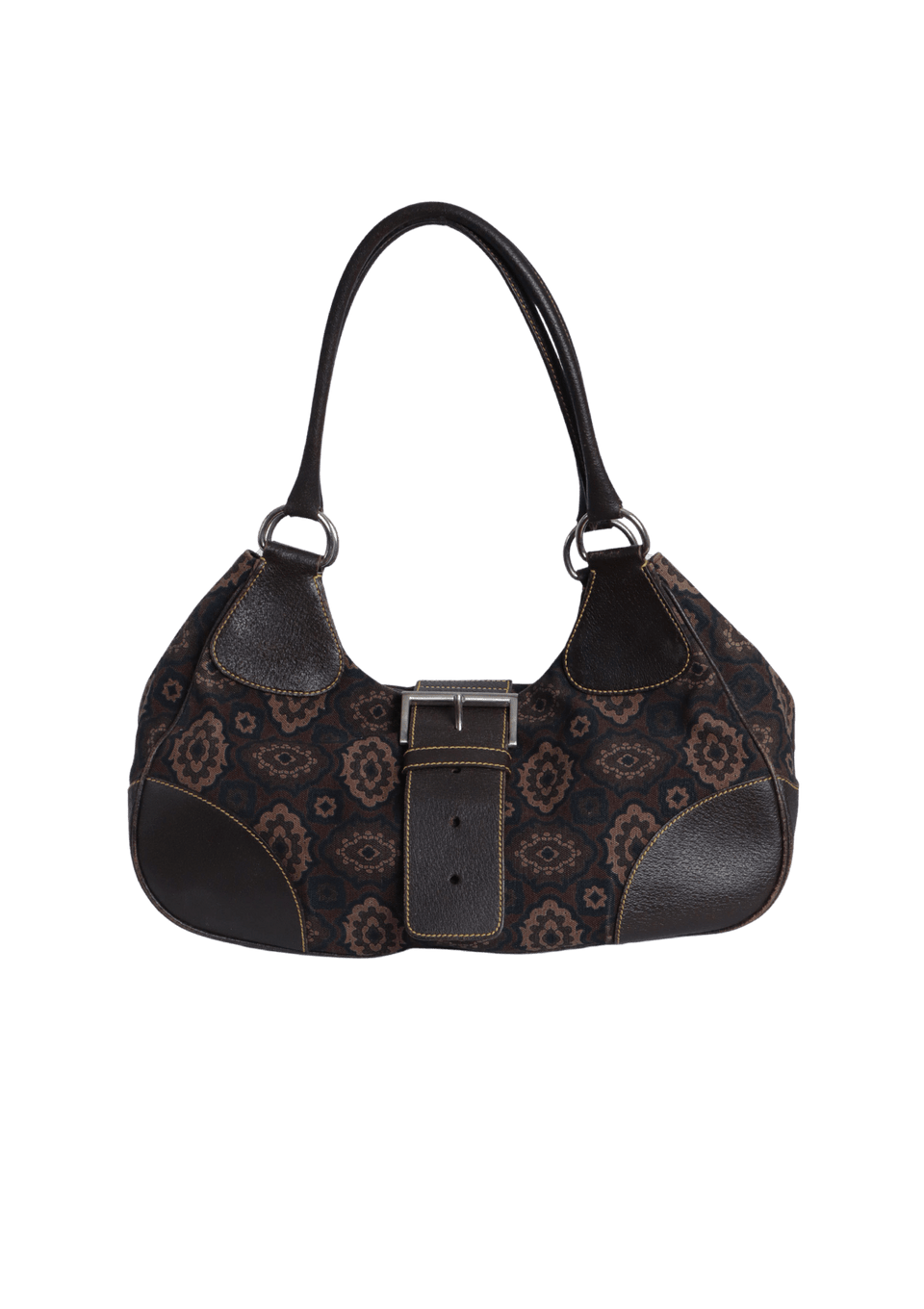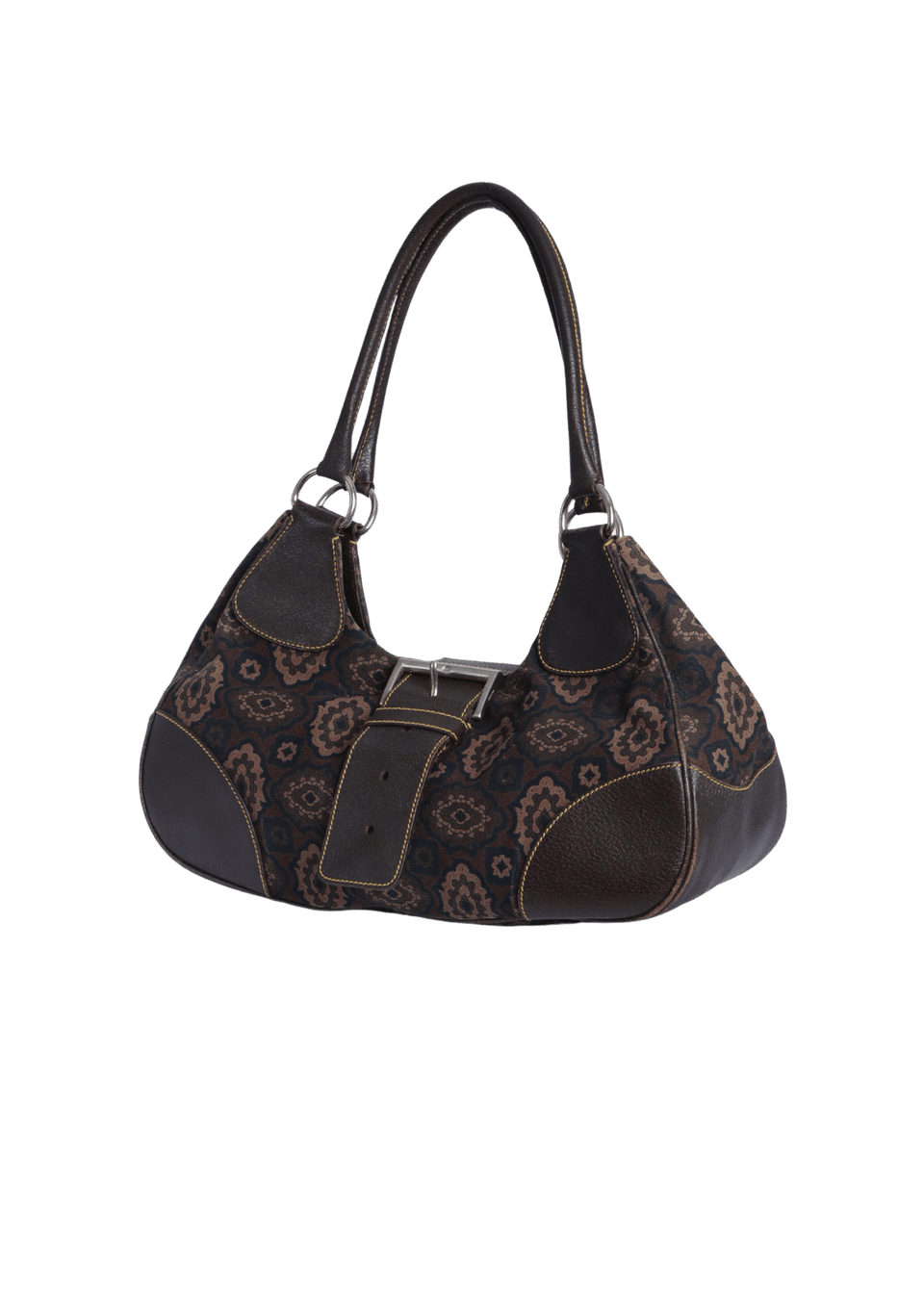 - Tecido marrom com estampa floral e couro calfskin marrom;