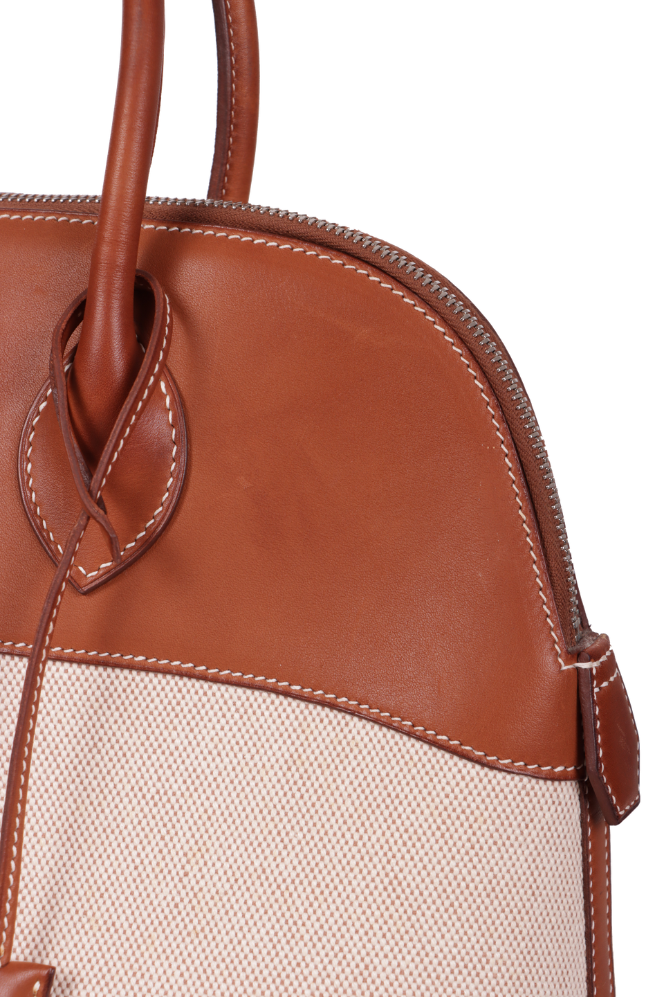 Bom, com aparência de usado. Apresenta leves marcas e manchas de uso pelos detalhes em couro, especialmente no acabamento superior e na base, pequenas manchas amareladas pelo canvas, leves marcas de uso pelas ferragens e couro levemente ressecado.