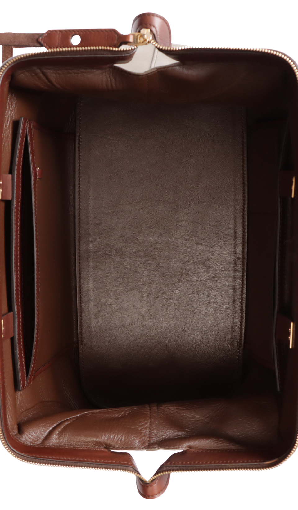 Bom, com aparência de usado. Apresenta leve deformaçāo nas laterais frontais, pequenas marcas de uso pelo couro, especialmente do lado esquerdo da frente e acabamento superior, pequenos desgastes nos cantos da base e leves marcas de uso pelas ferragens.