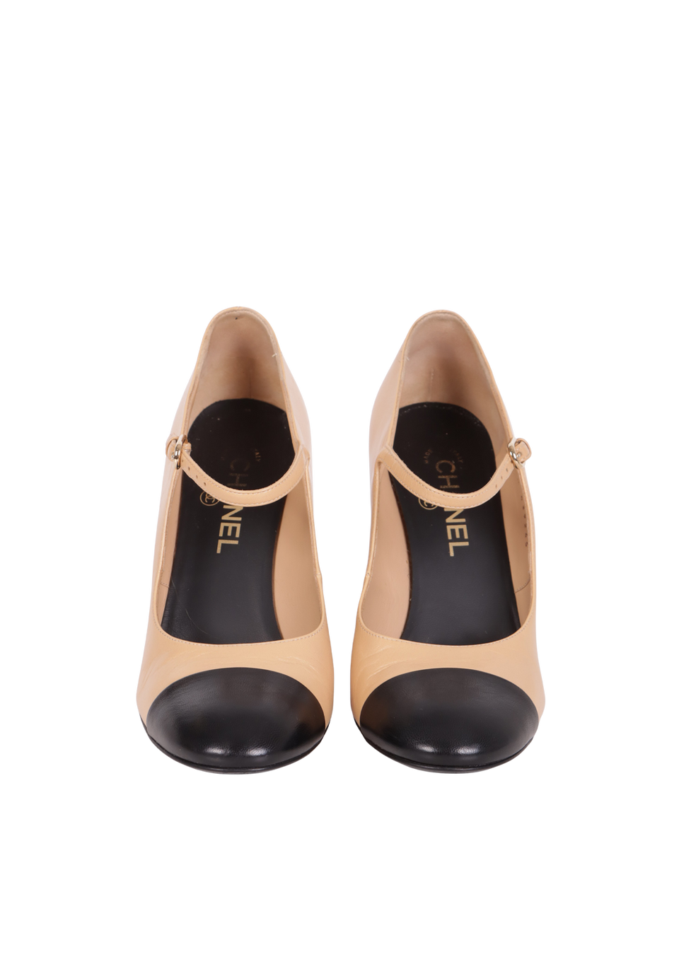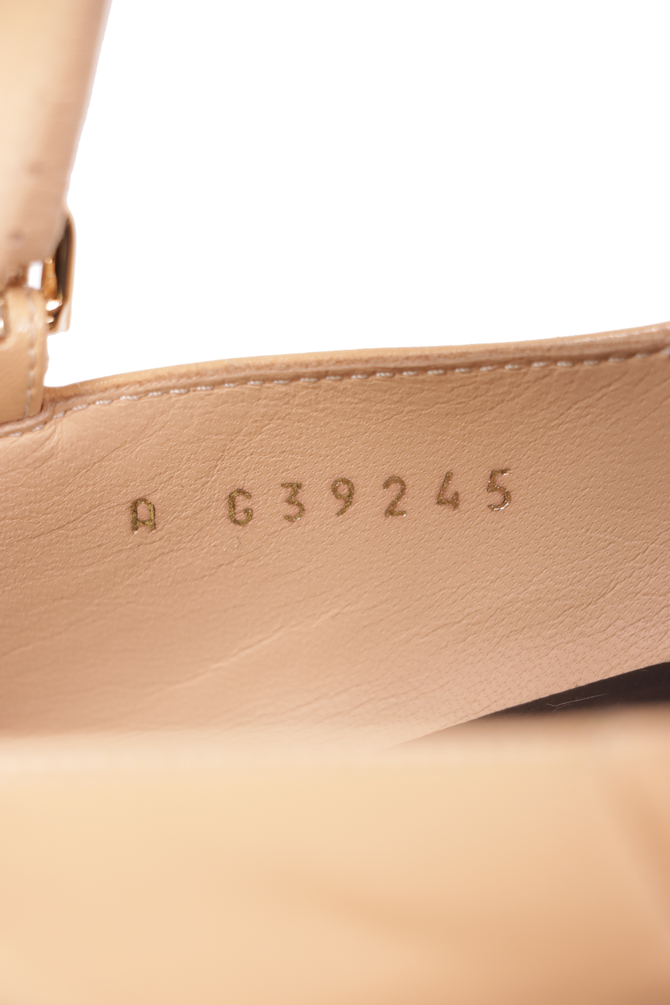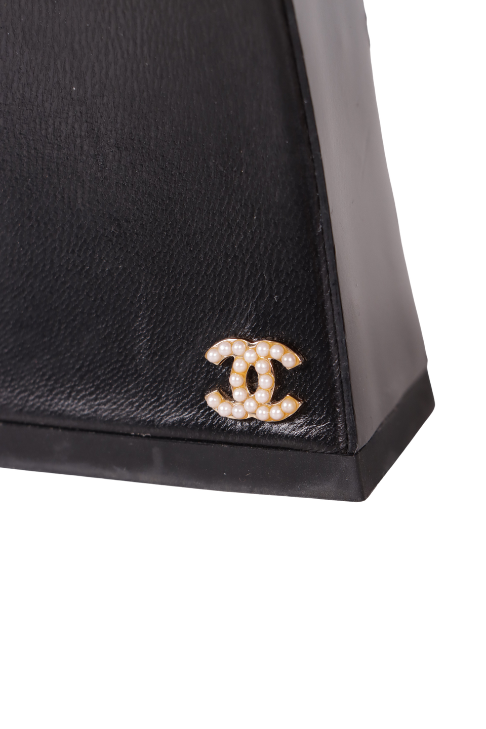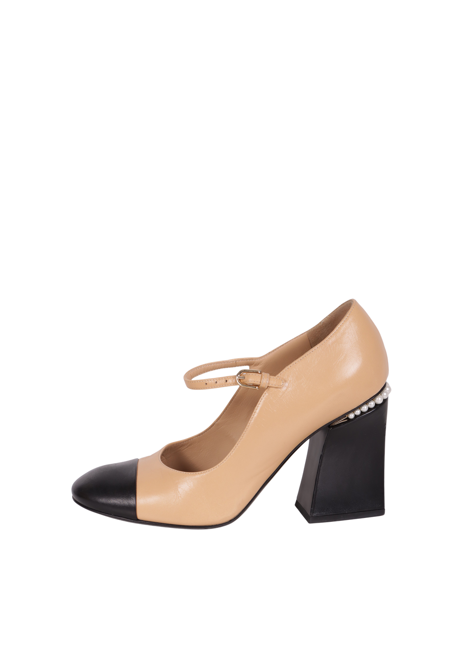 Descrição do Material: Couro lambskin bege e preto com detalhes de contas de plástico peroladas