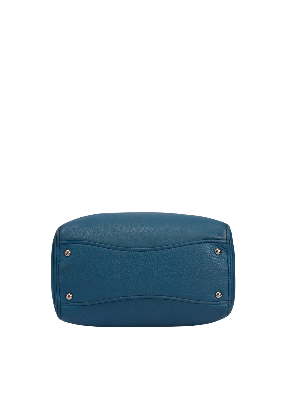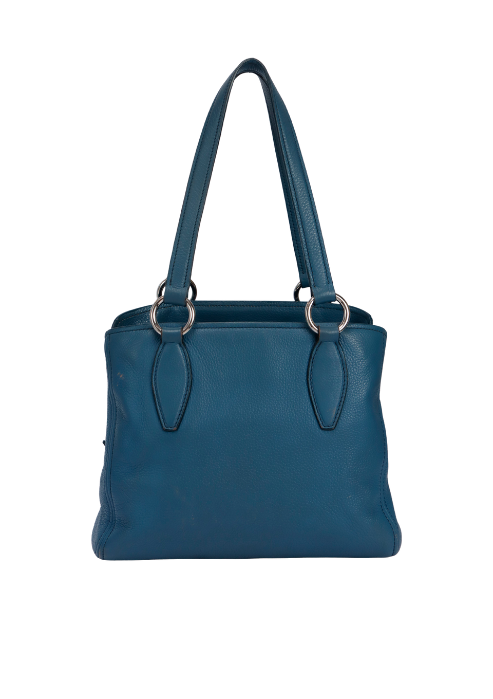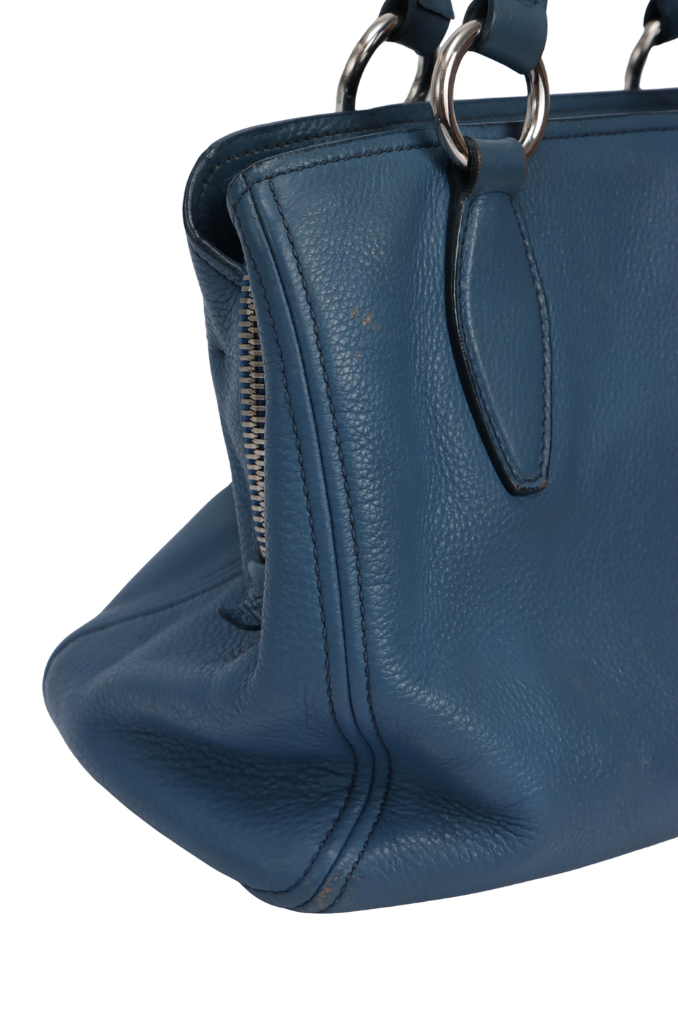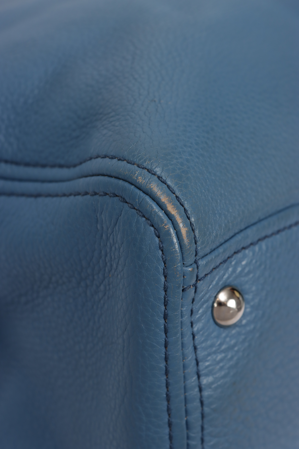 Bom, com aparência de usado. Apresenta leves deformidades pela estrutura, especialmente nos cantos inferiores da frente e de trás, pequenas marcas de uso nas ferragens da logomarca frontal, nos detalhes das alças e nos puxadores dos cursores, leves marcas de uso e desgastes pelo couro, principalmente nos cantos da base e parte superior do lado esquerdo de trás, pequenas fissuras nas selagens das laterais superiores, nos acabamentos superiores da frente e de trás e nas partes inferiores das alças e leves manchas de uso pelo forro.