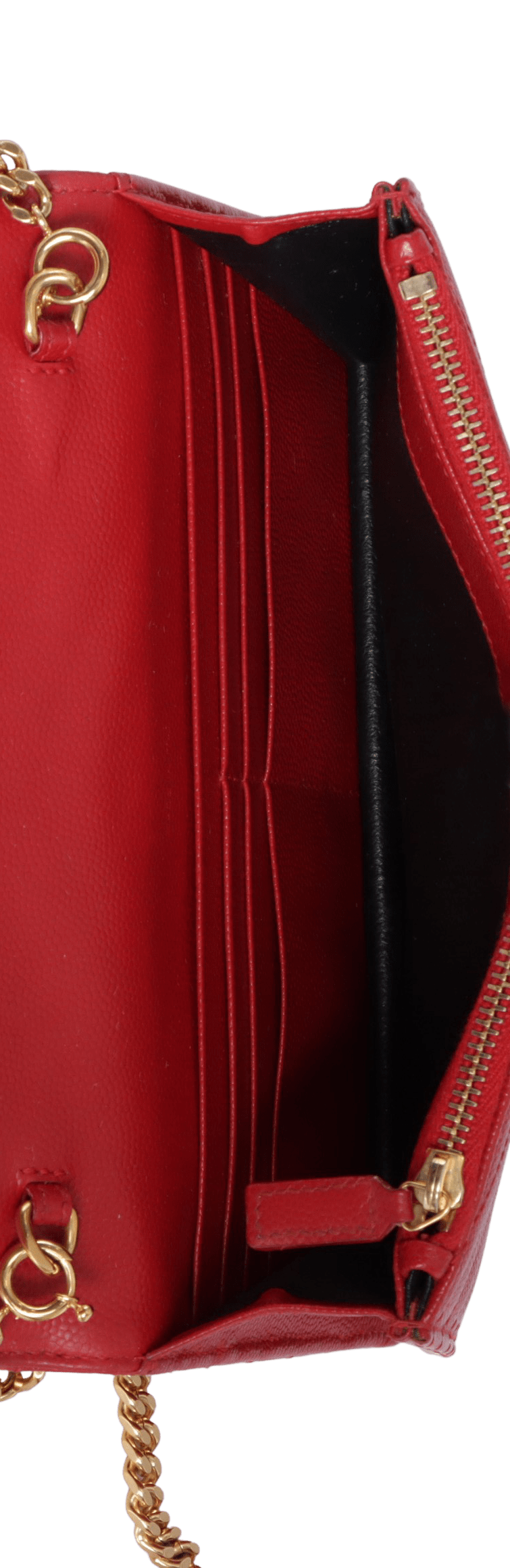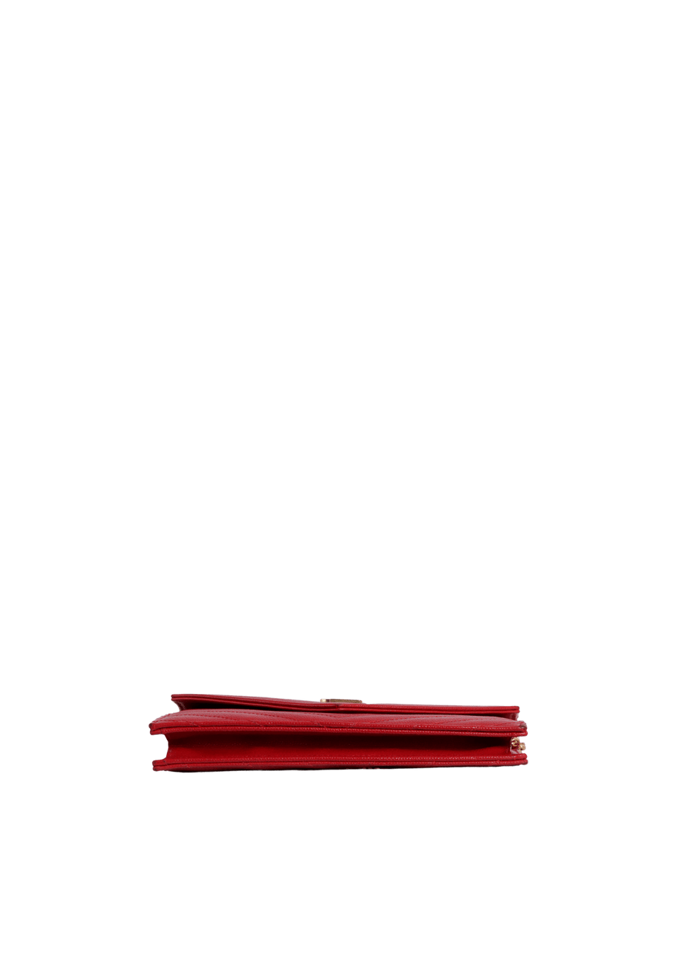 - Couro calfskin vermelho com acabamentos matelassê e Grain de Poudre;
