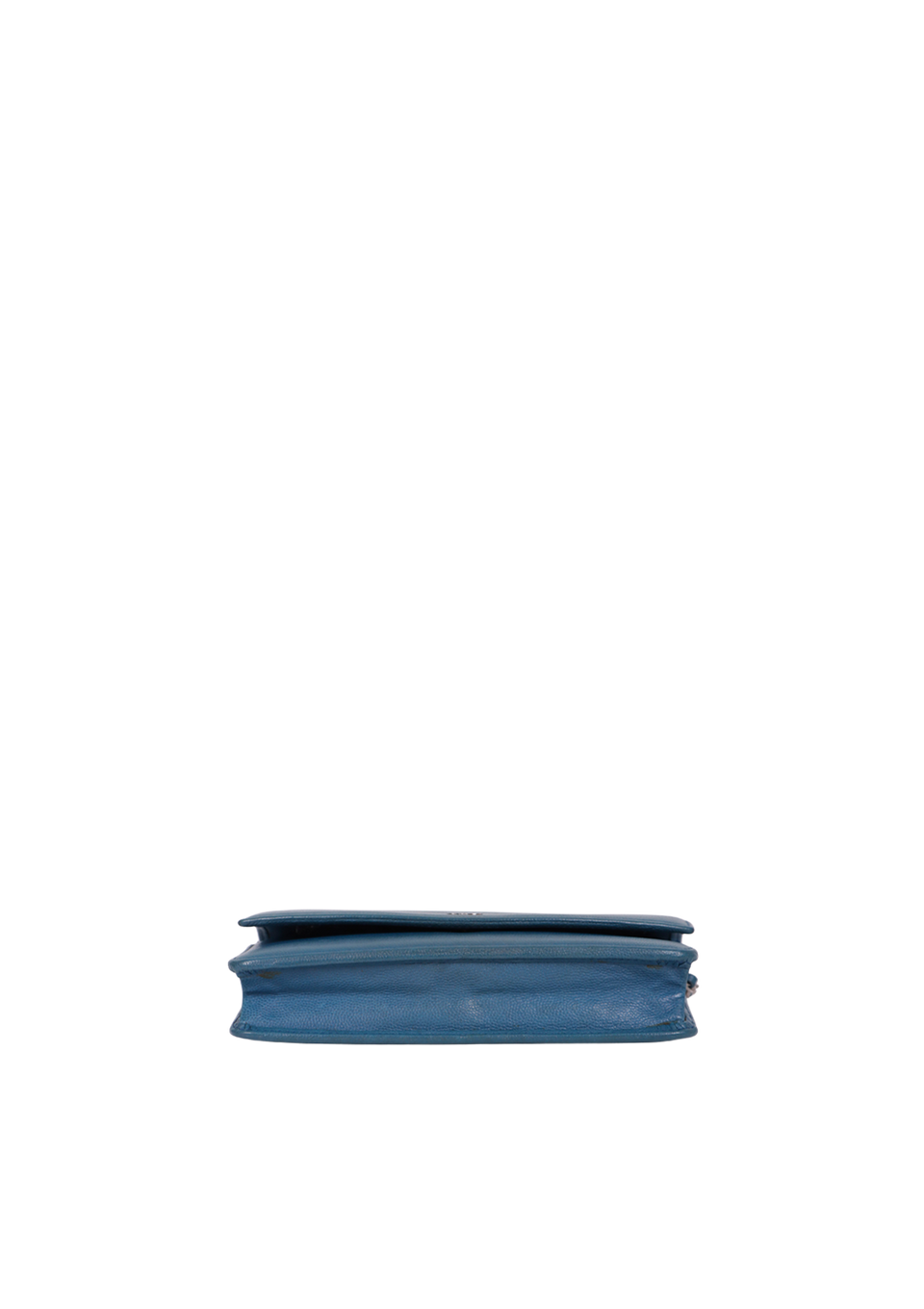 Regular. Apresenta couro severamente ressecado e esbranquiçado, notáveis desgastes marcas e manchas de uso pelo couro, especialmente nas extremidades, parte posterior e parte central interna, considerável deformação na base, notáveis marcas de uso, oxidações e descolorações nas ferragens, severa abertura na parte interna em couro na lateral direita, consideráveis marcas e manchas de uso pelo forro e couro.
