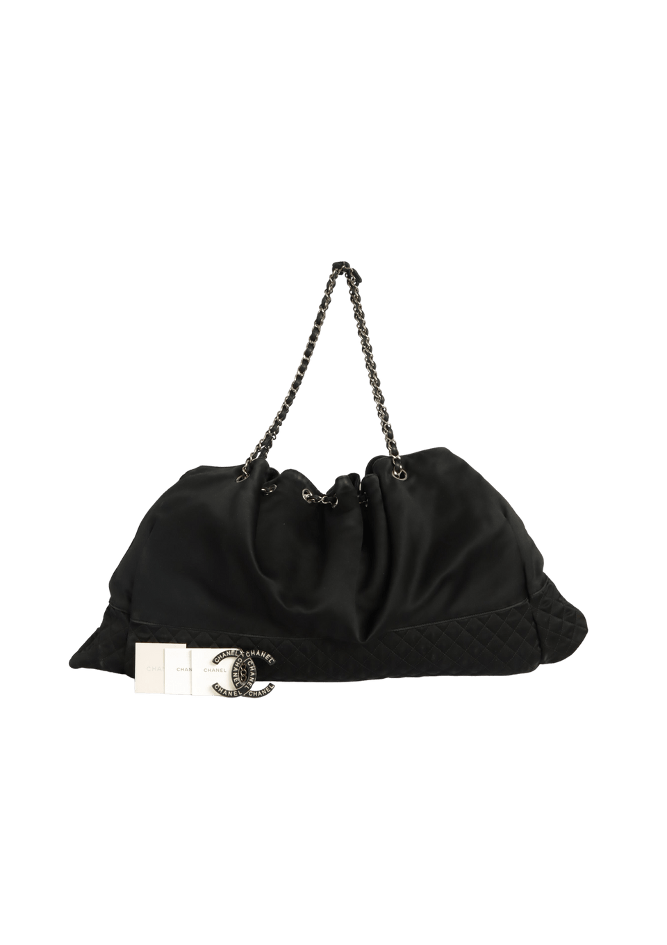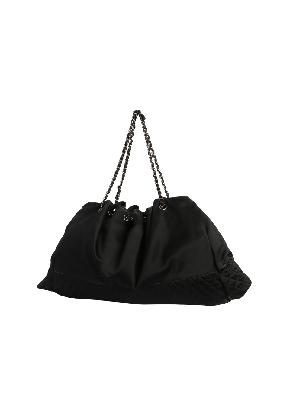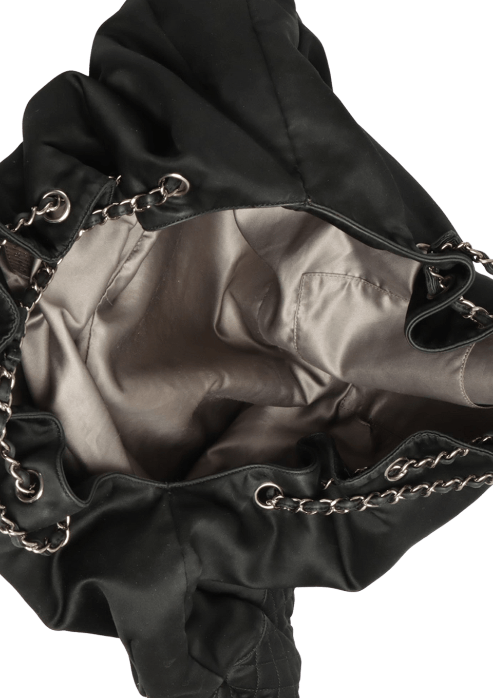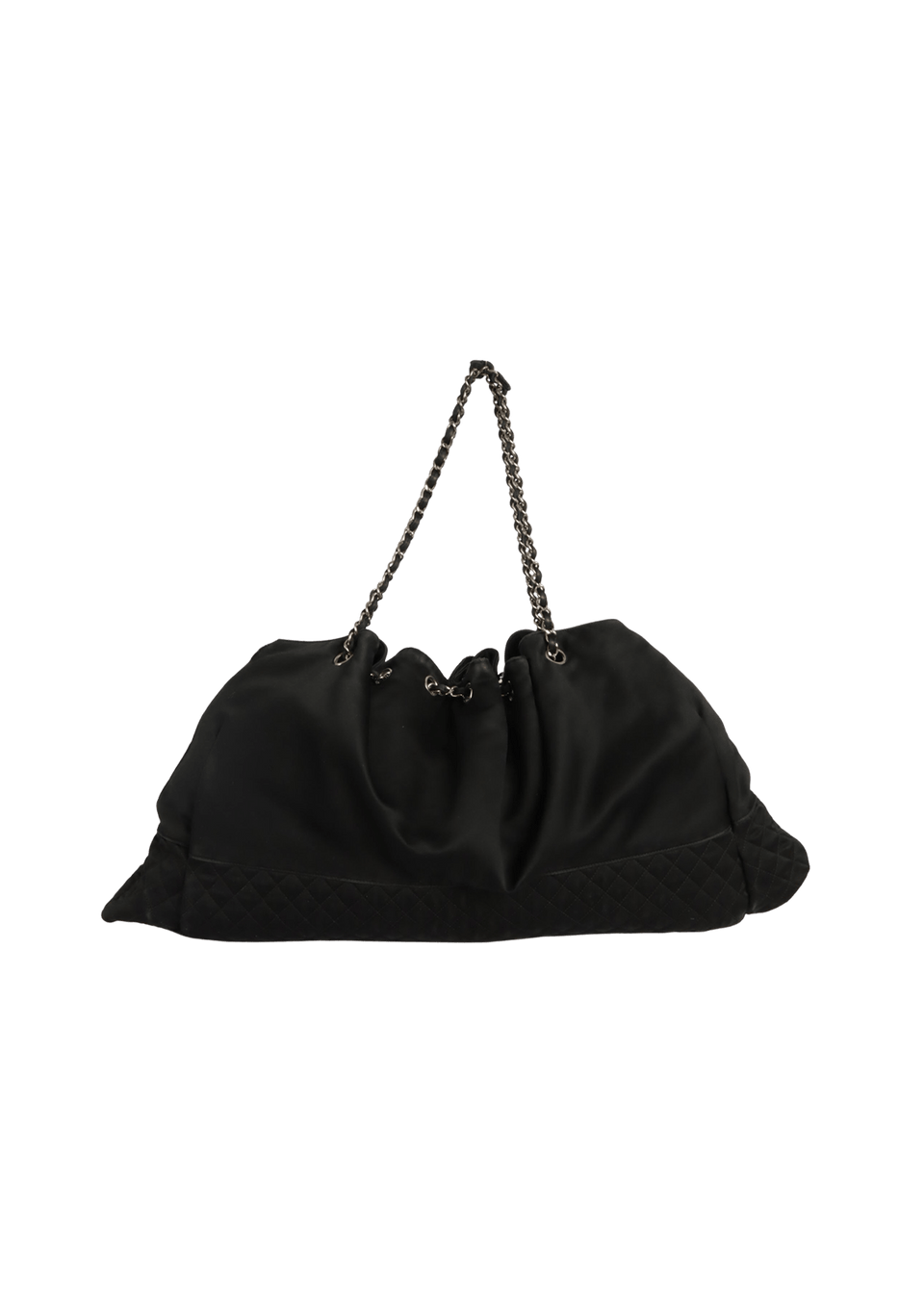Condição: Regular, faltando item. Apresenta severas manchas esbranquiçadas na parte interna e externa próximas da abertura e na parte de matelassê, severos furos no tecido, principalmente na lateral direita, pingente da marca solto, desgastes no material, na extremidade próximo a abertura e na costura de pesponto antes do matelassê, oxidação nas ferragens, especialmente nas alças e nos ilhoses, fios puxados na parte interna e externa, especialmente nos cantos da base.