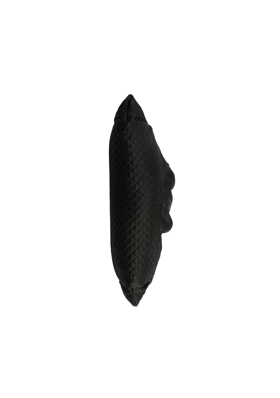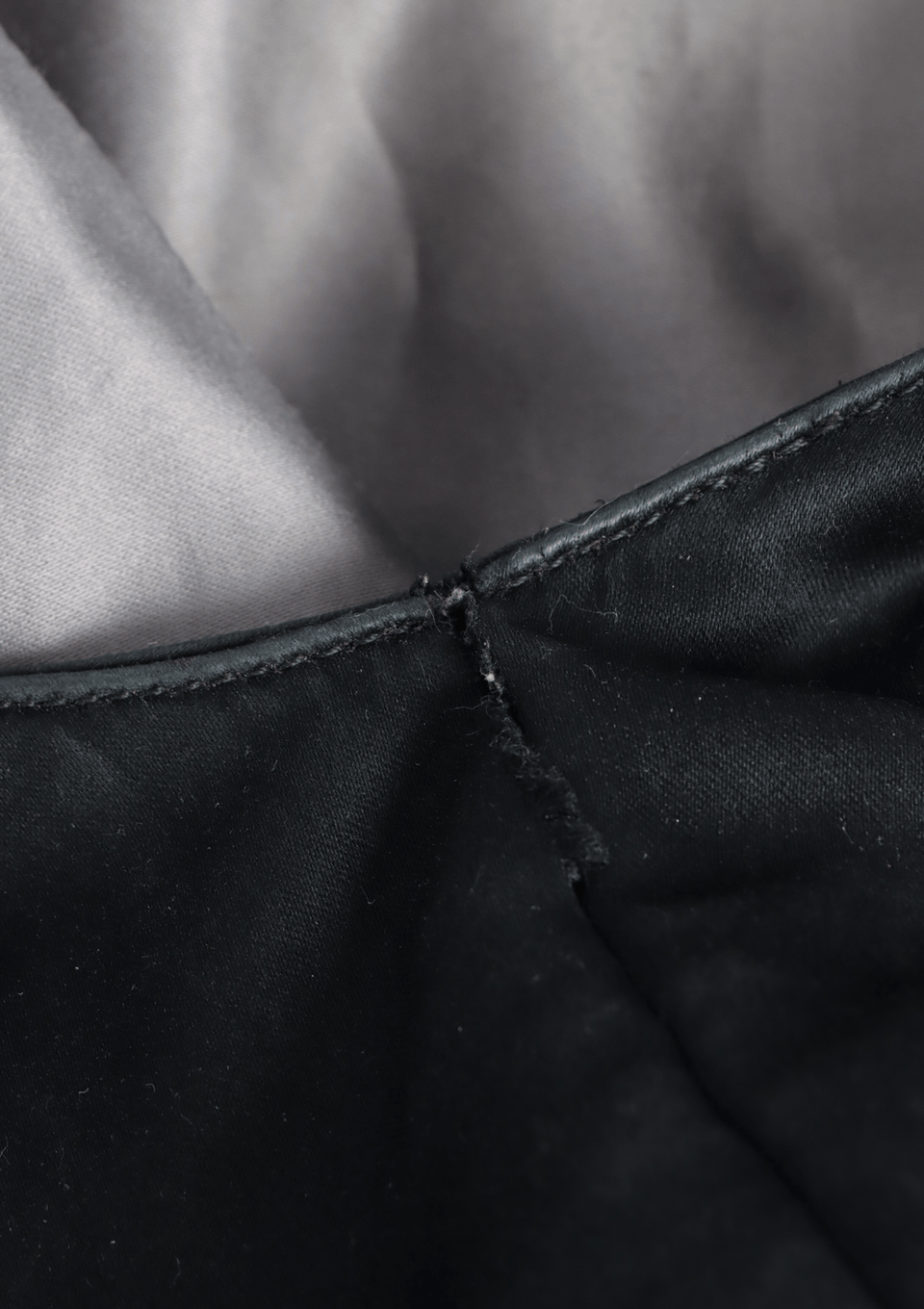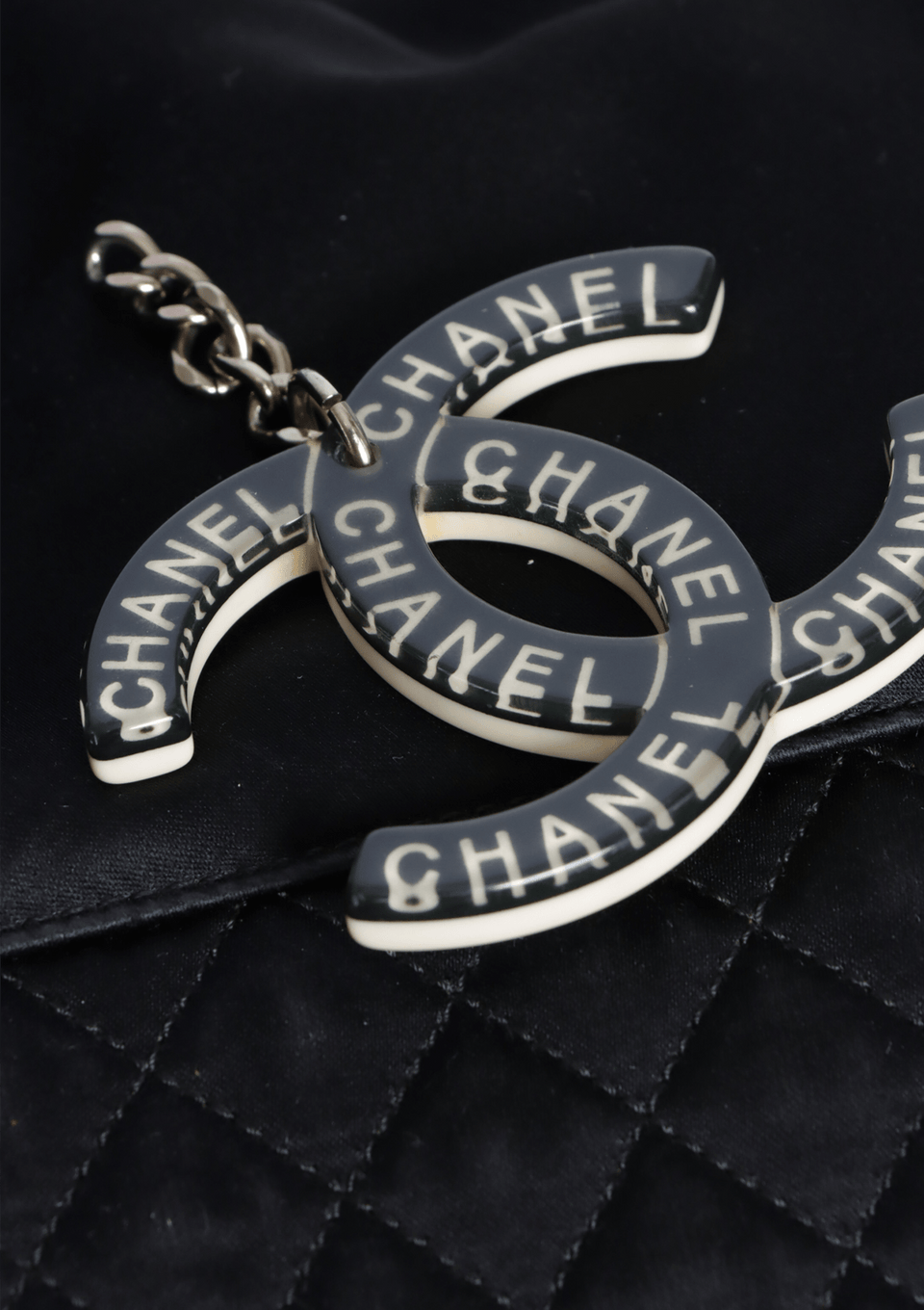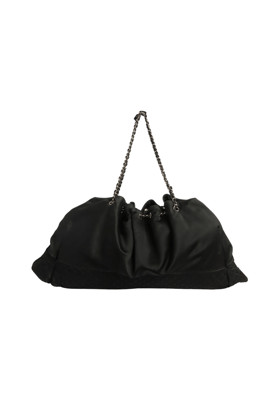 Condição: Regular, faltando item. Apresenta severas manchas esbranquiçadas na parte interna e externa próximas da abertura e na parte de matelassê, severos furos no tecido, principalmente na lateral direita, pingente da marca solto, desgastes no material, na extremidade próximo a abertura e na costura de pesponto antes do matelassê, oxidação nas ferragens, especialmente nas alças e nos ilhoses, fios puxados na parte interna e externa, especialmente nos cantos da base.