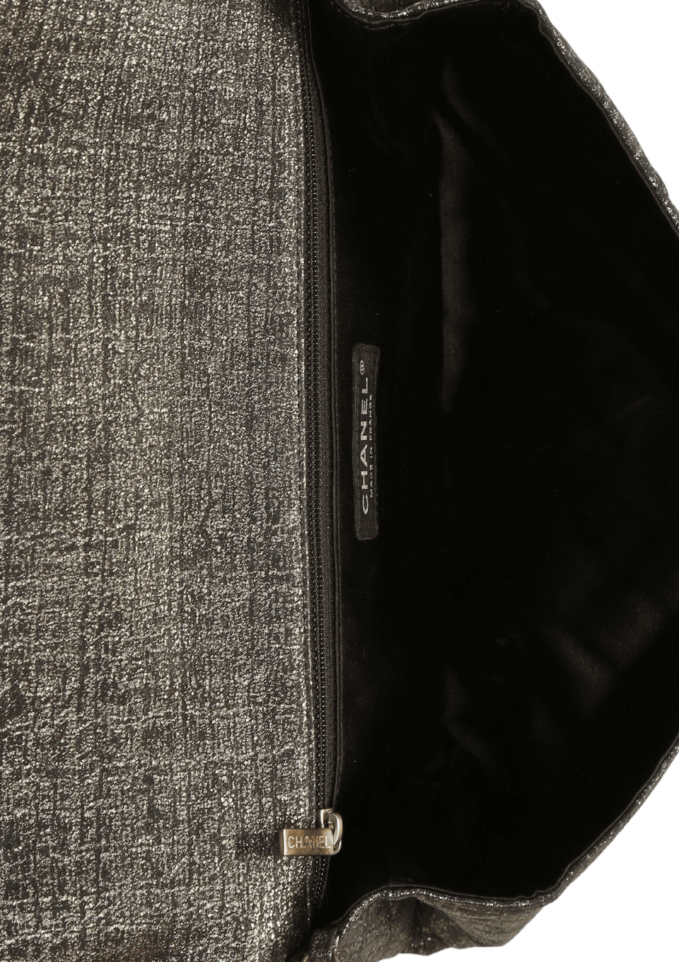 - Jacquard matelassê preto com acabamento prateado;
