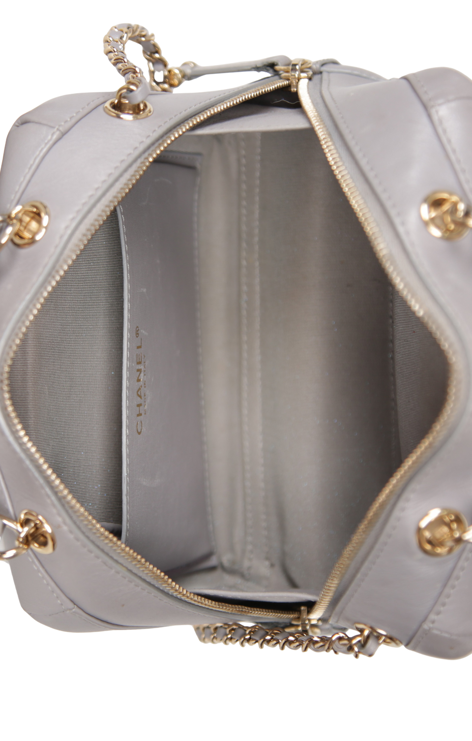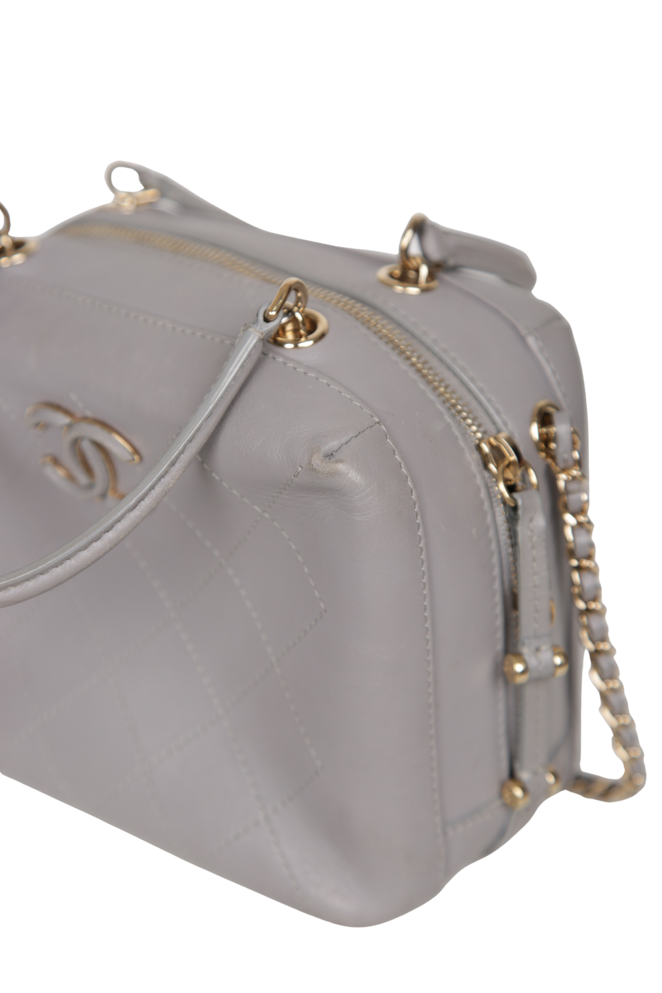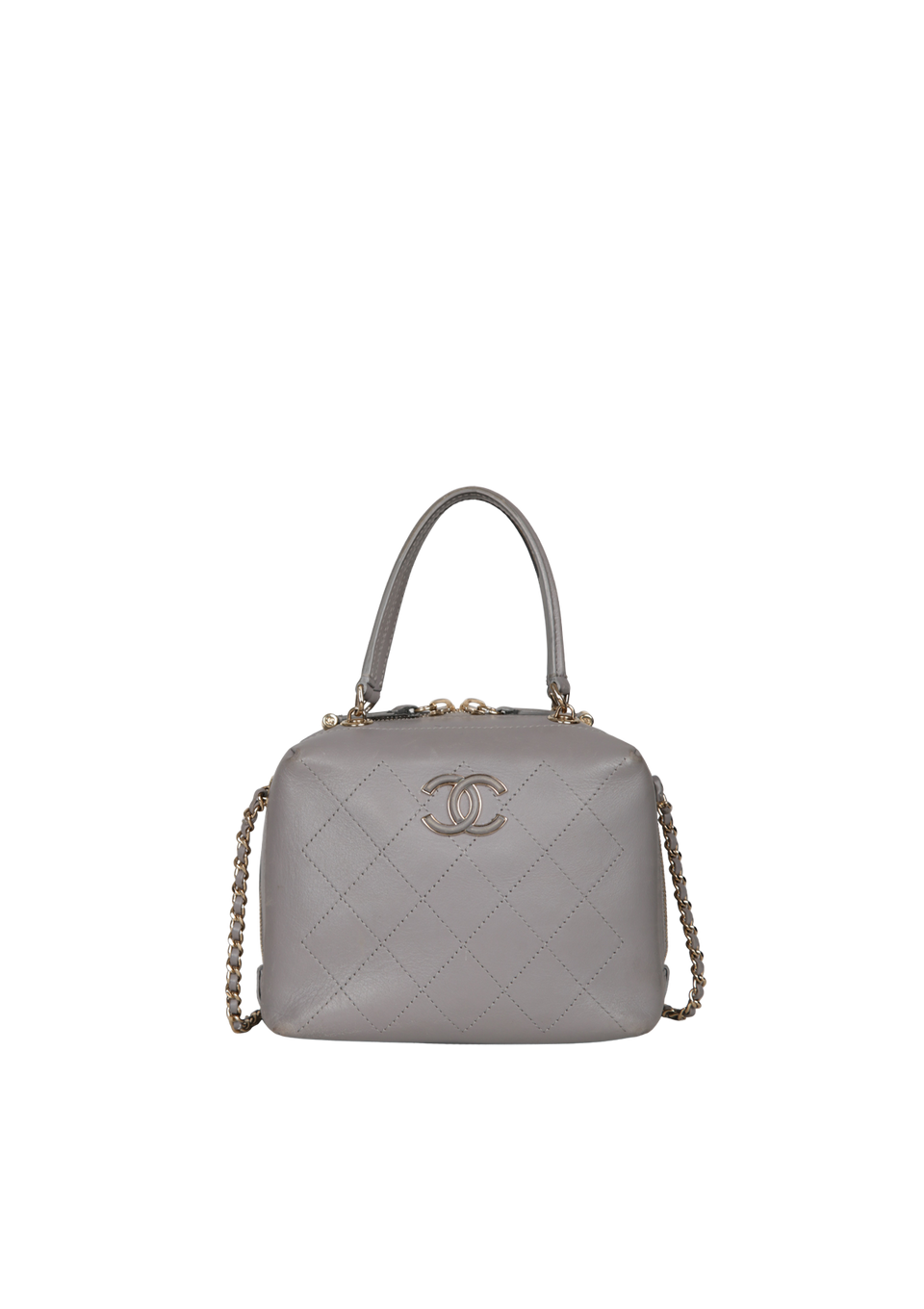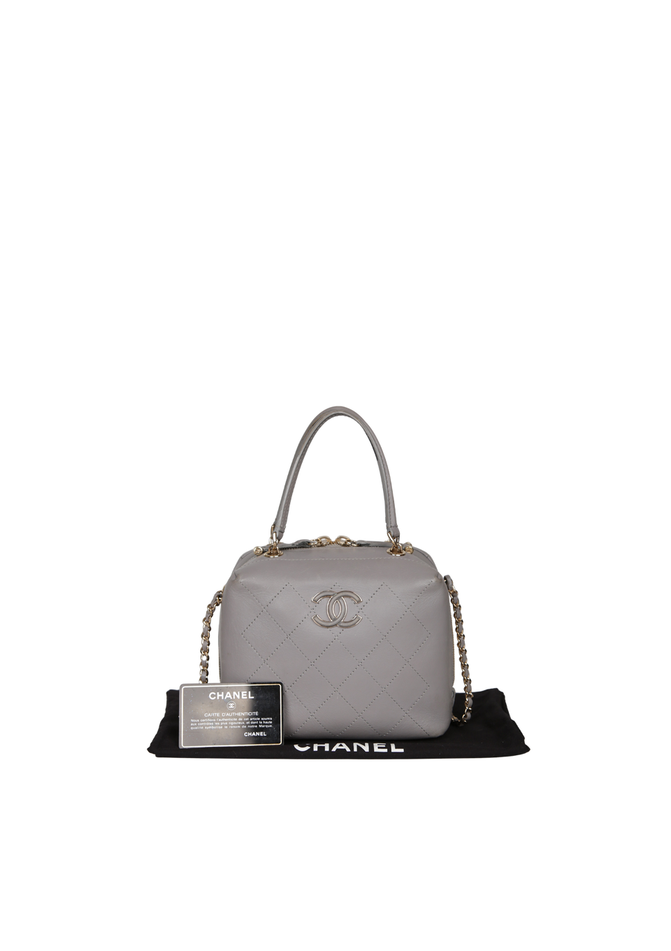 Descrição do Material: Couro calfskin cinza com acabamento matelassê
