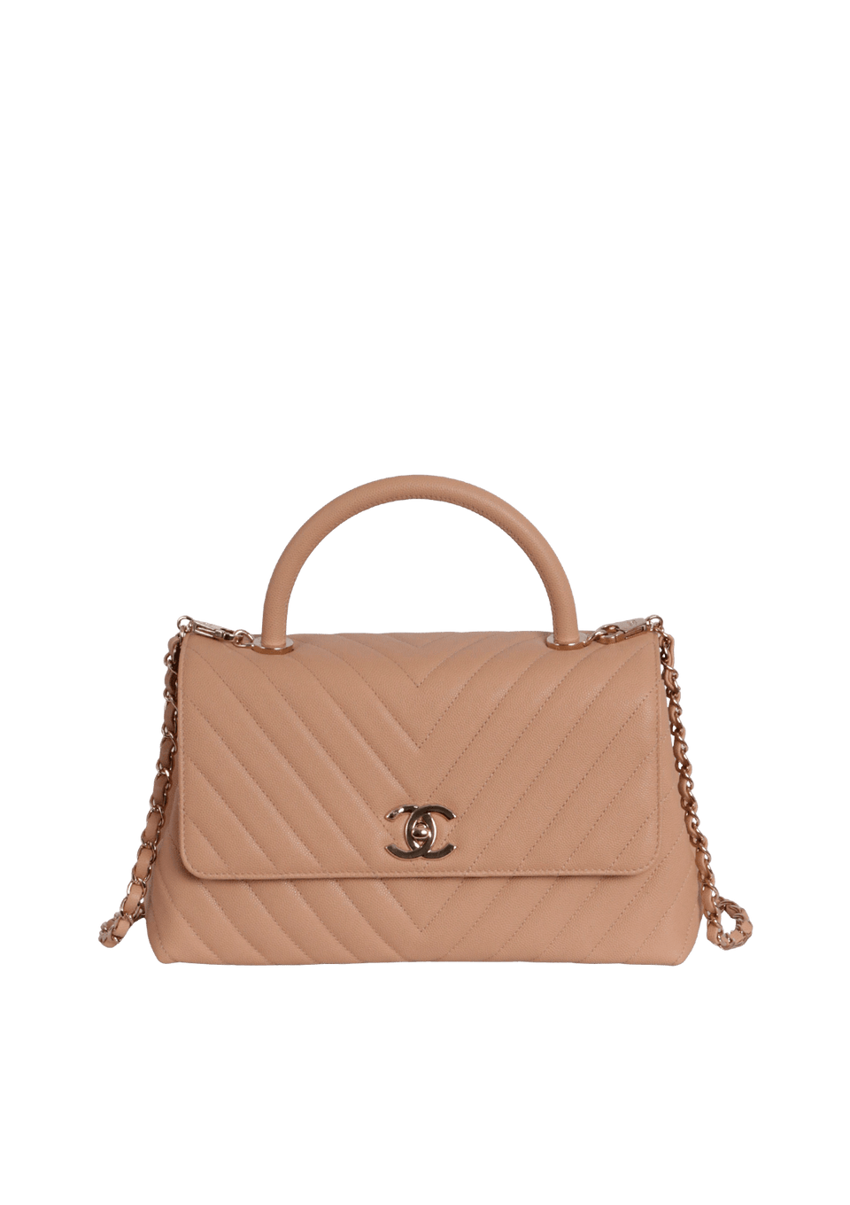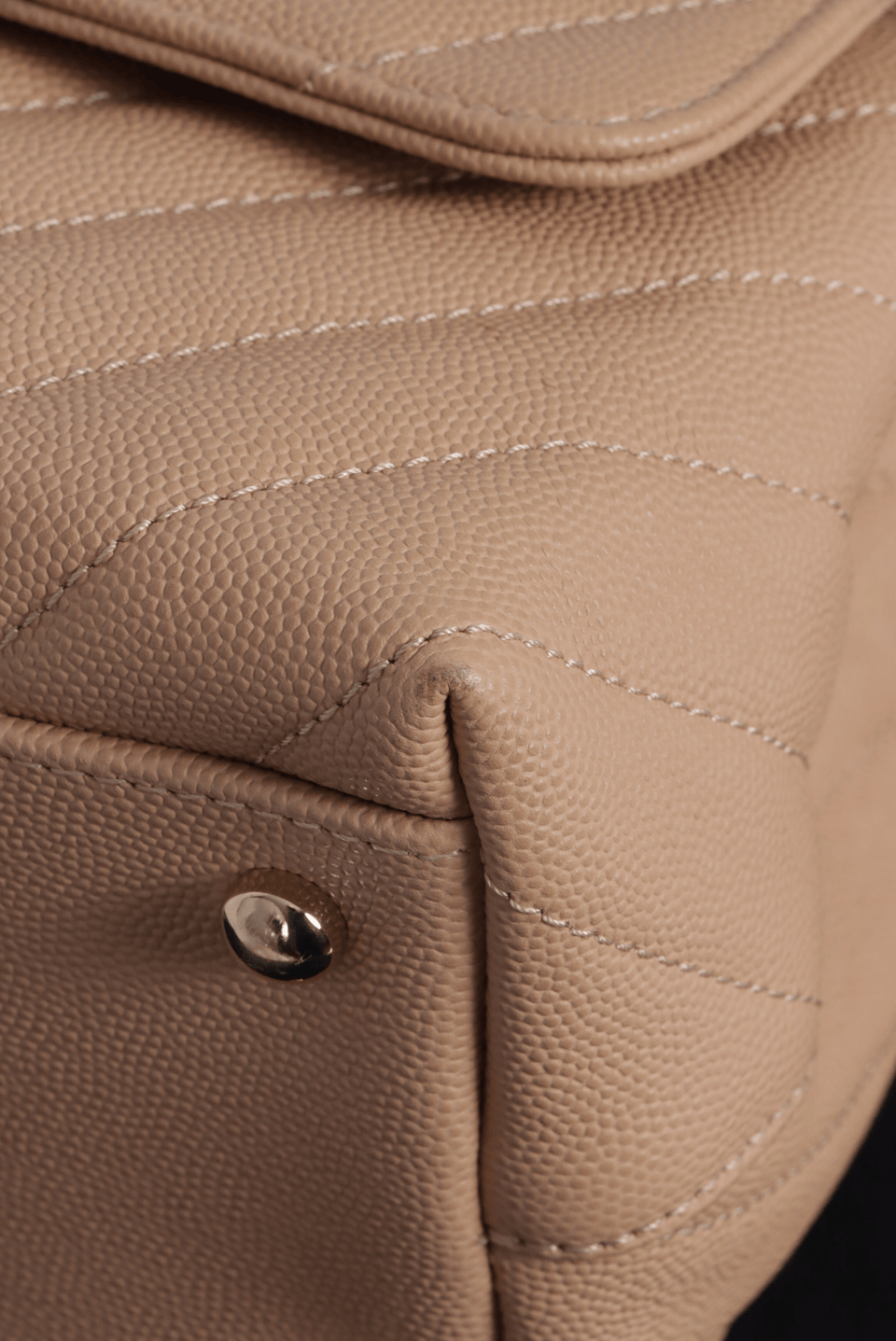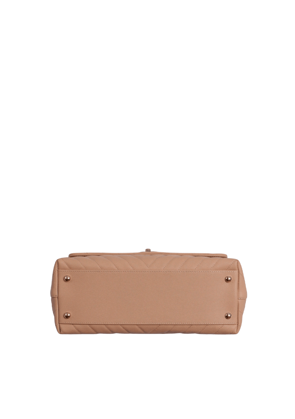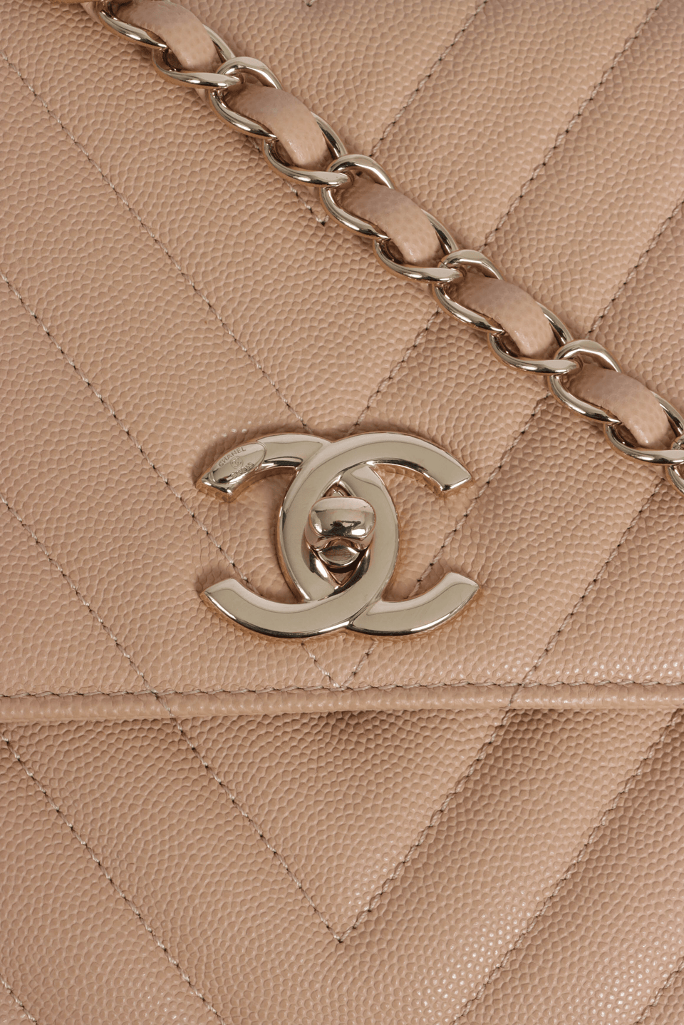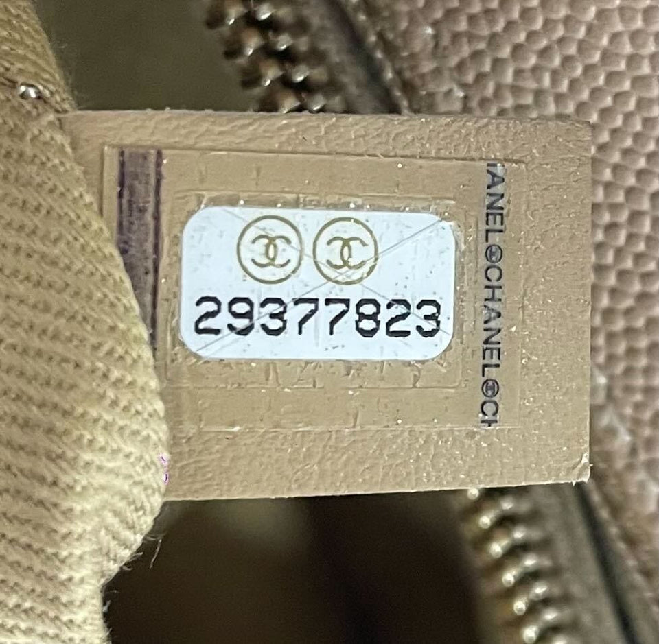 - Couro calfskin bege com acabamentos matelassê e Caviar;