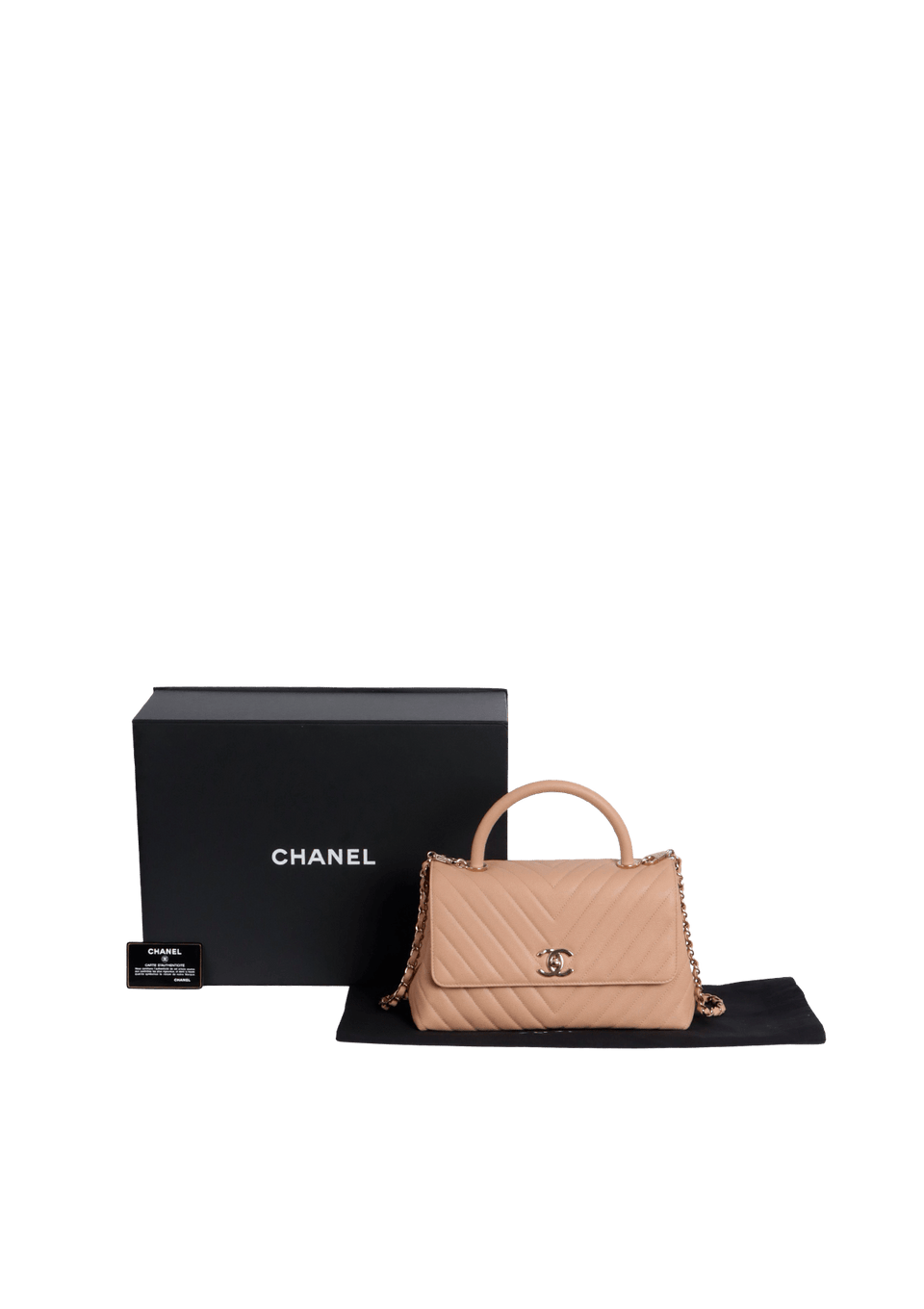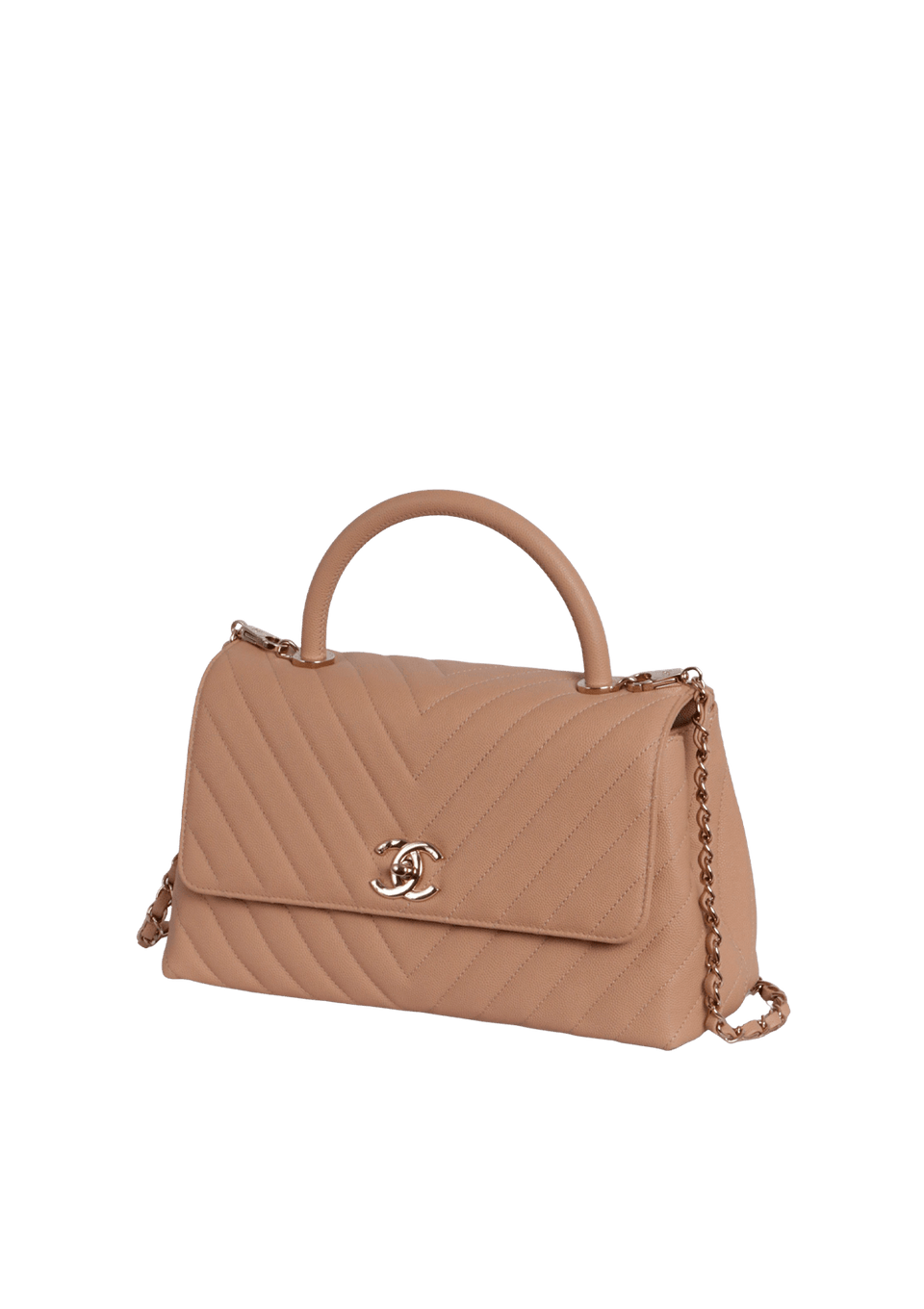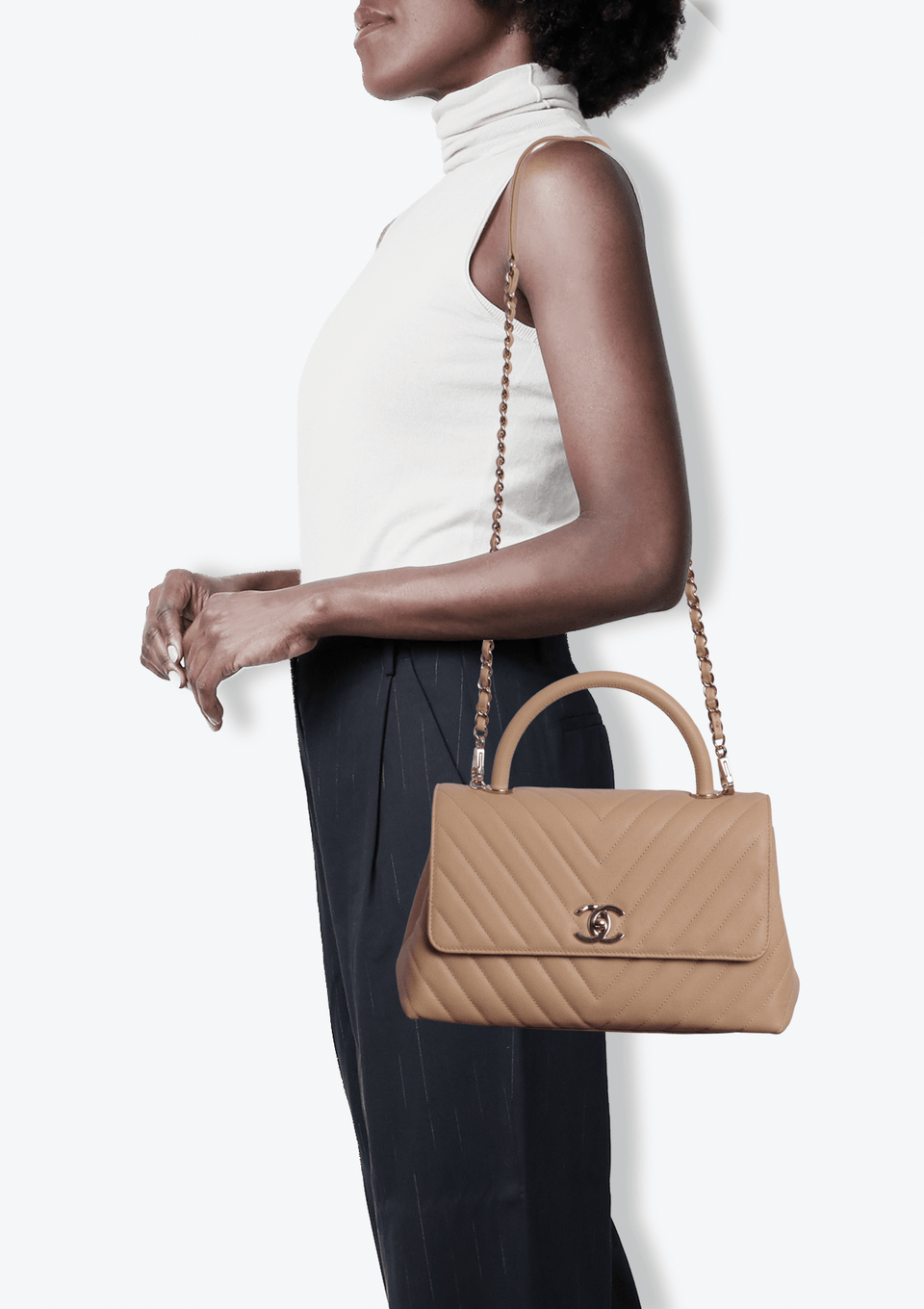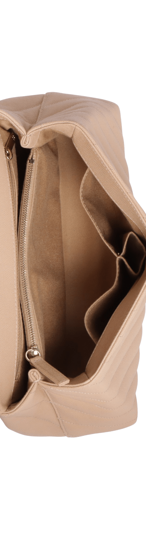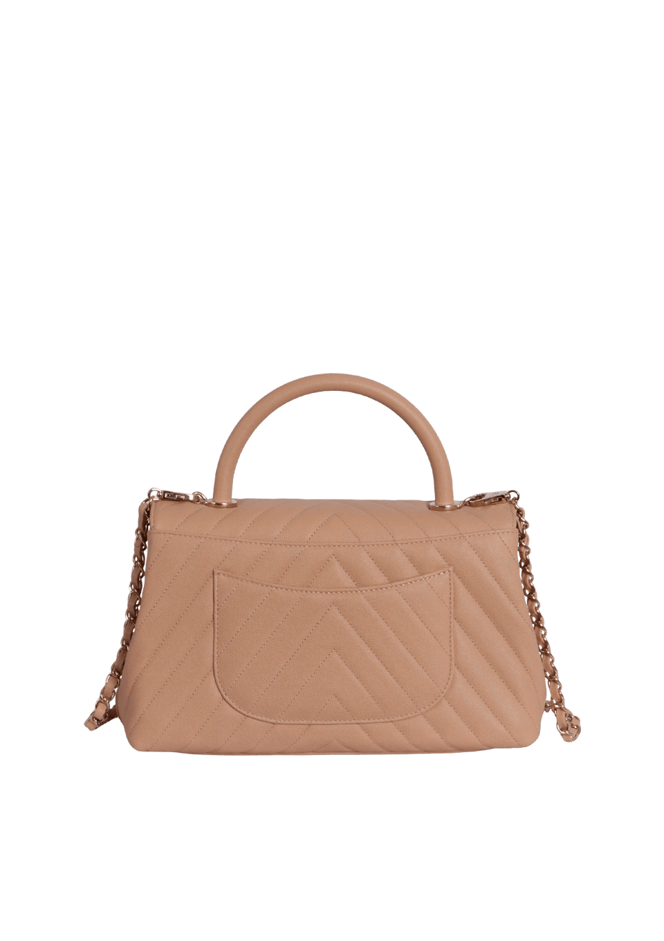 - Couro calfskin bege com acabamentos matelassê e Caviar;