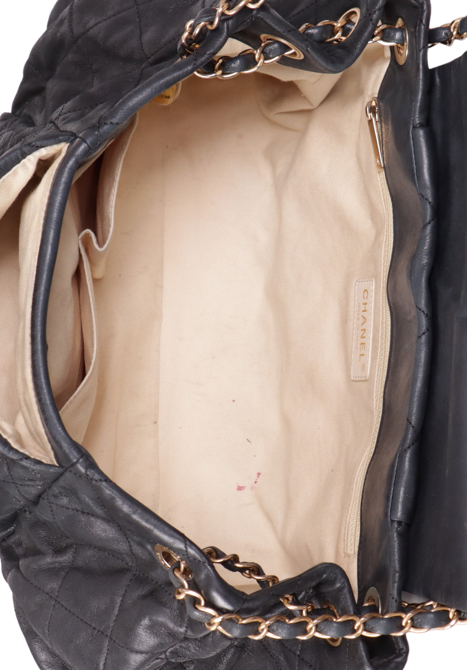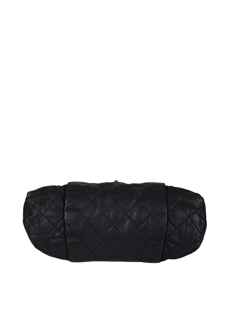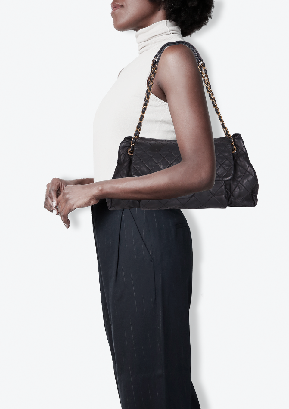 Desriçarão do Material: Couro lambskin preto com acabamentos iridescent e matelassê