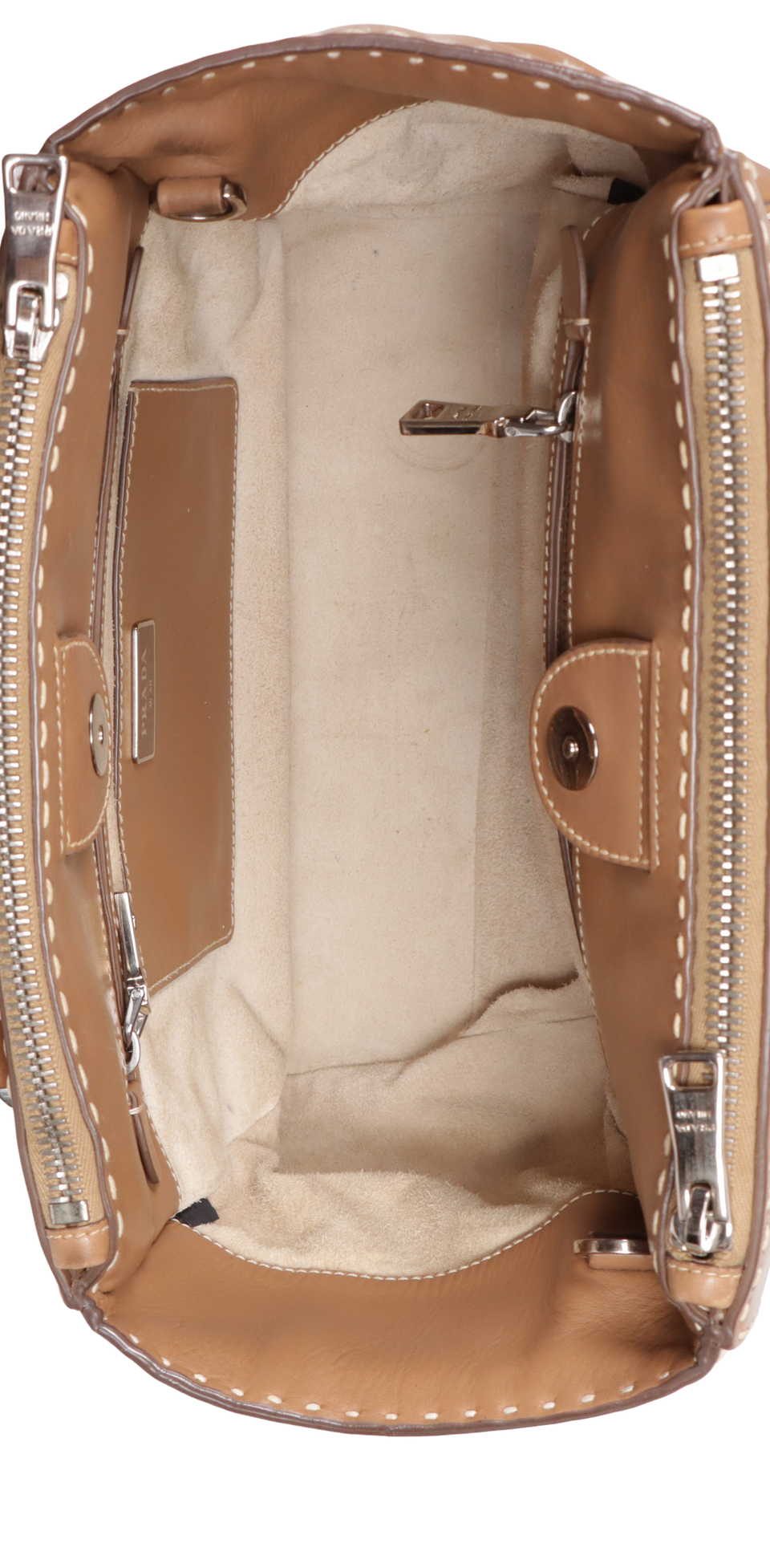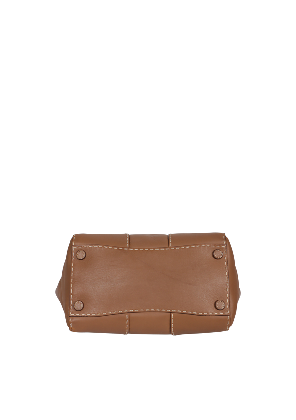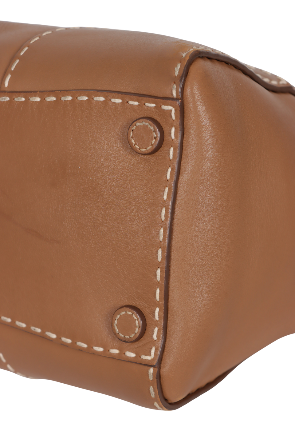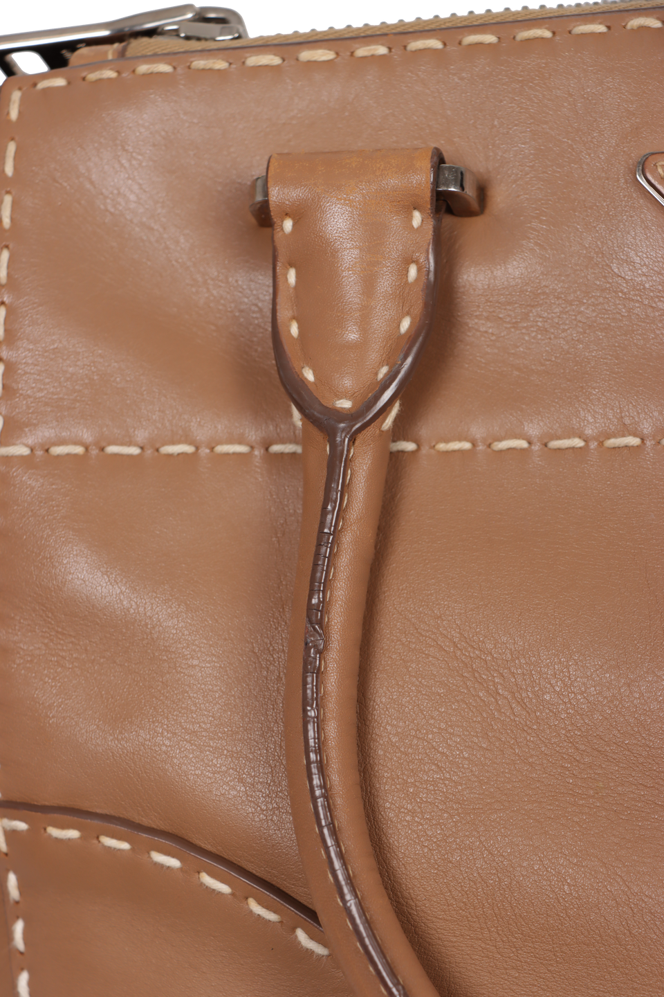 Regular. Apresenta severas deformidades pela estrutura, especialmente na parte central frontal e nas partes inferiores das laterais, consideráveis marcas de uso e oxidações nas ferragens dos puxadores dos cursores, nos detalhes das alças, na logo frontal e no botão magnético, notáveis desgastes, manchas e marcas de uso pelo couro, principalmente nos cantos da base, nas extremidades superiores, nas alças de mão, na parte superior e central de trás, severos desgastes e fissuras nas selagens das alças e nas extremidades superiores e consideráveis manchas, marcas de uso e desgastes pelo forro.