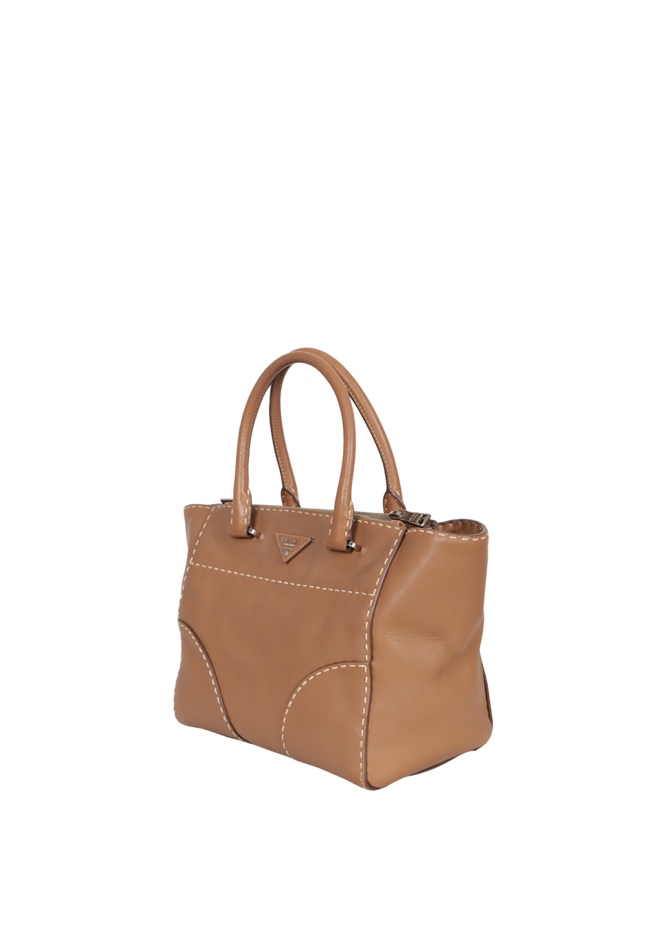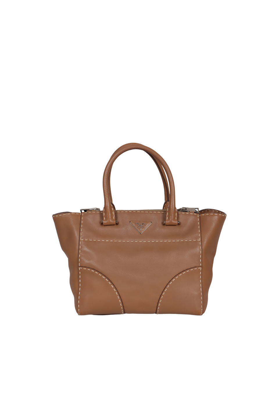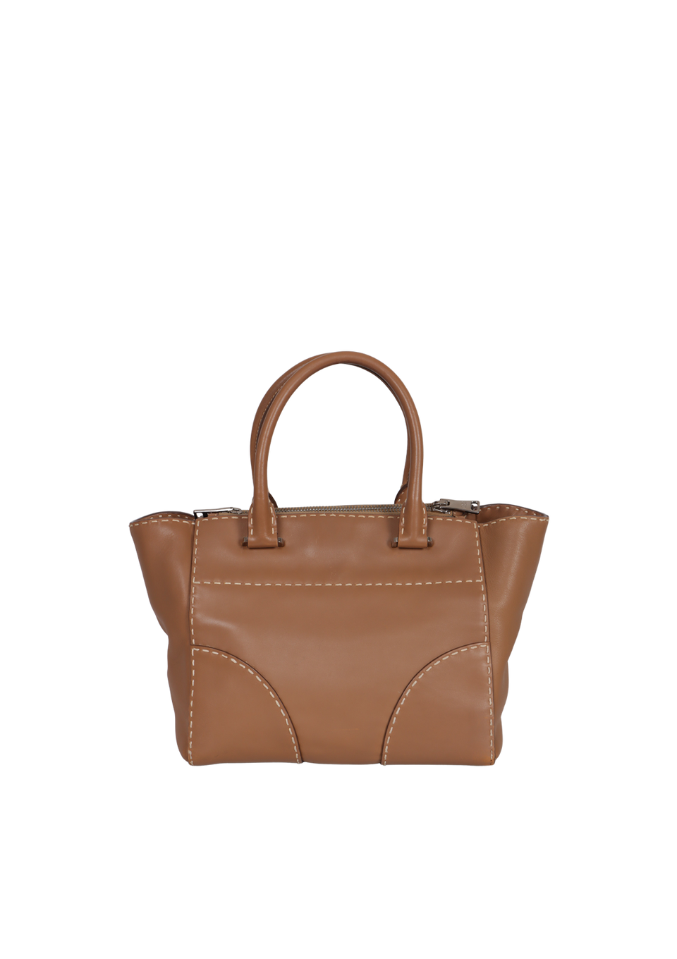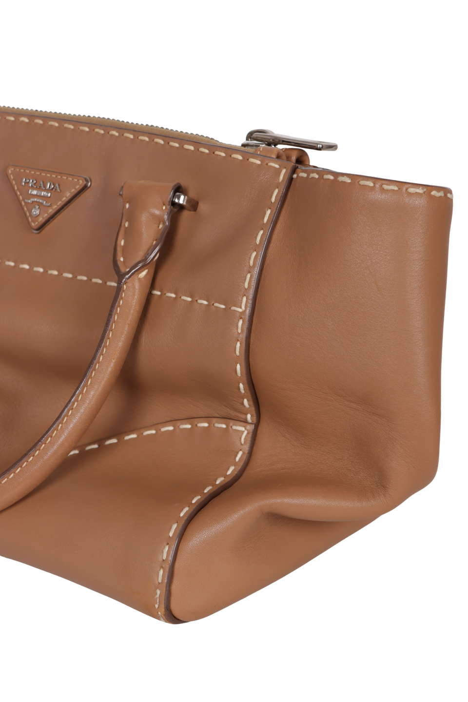 Regular. Apresenta severas deformidades pela estrutura, especialmente na parte central frontal e nas partes inferiores das laterais, consideráveis marcas de uso e oxidações nas ferragens dos puxadores dos cursores, nos detalhes das alças, na logo frontal e no botão magnético, notáveis desgastes, manchas e marcas de uso pelo couro, principalmente nos cantos da base, nas extremidades superiores, nas alças de mão, na parte superior e central de trás, severos desgastes e fissuras nas selagens das alças e nas extremidades superiores e consideráveis manchas, marcas de uso e desgastes pelo forro.