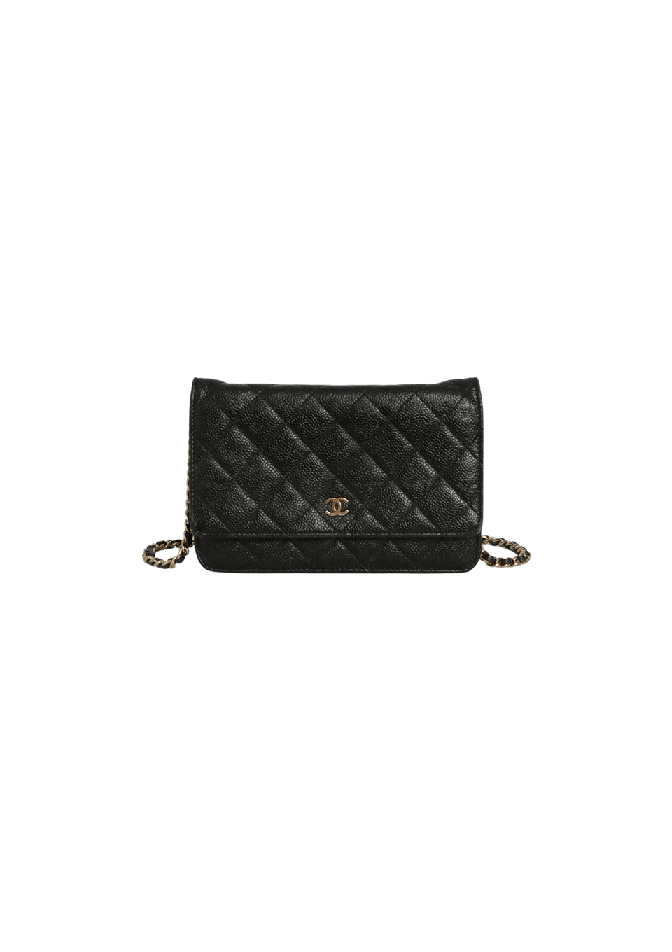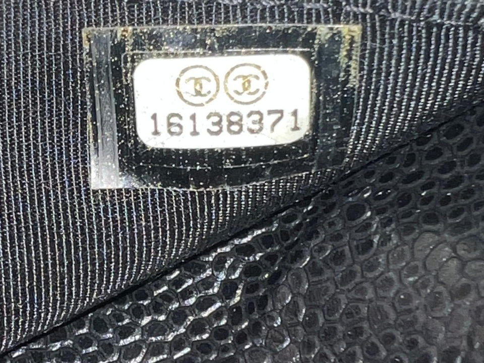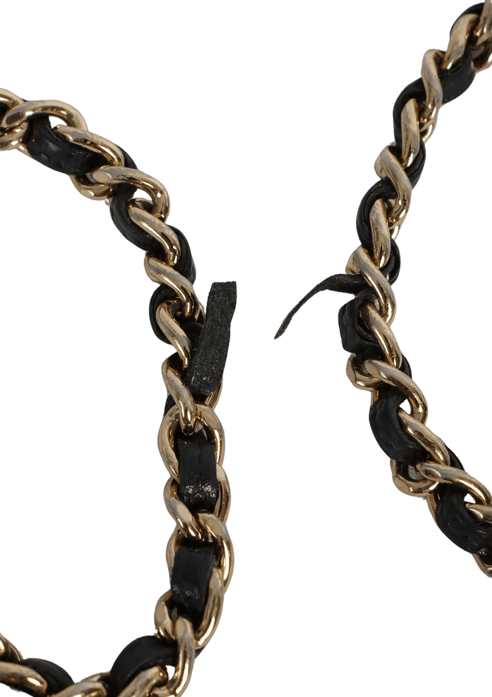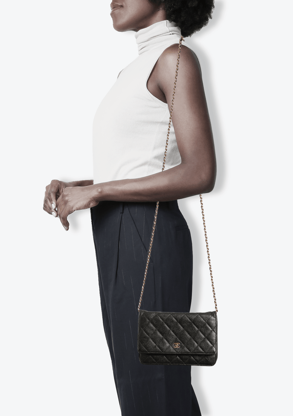 - Couro calfskin preto com acabamentos matelassê e Caviar;