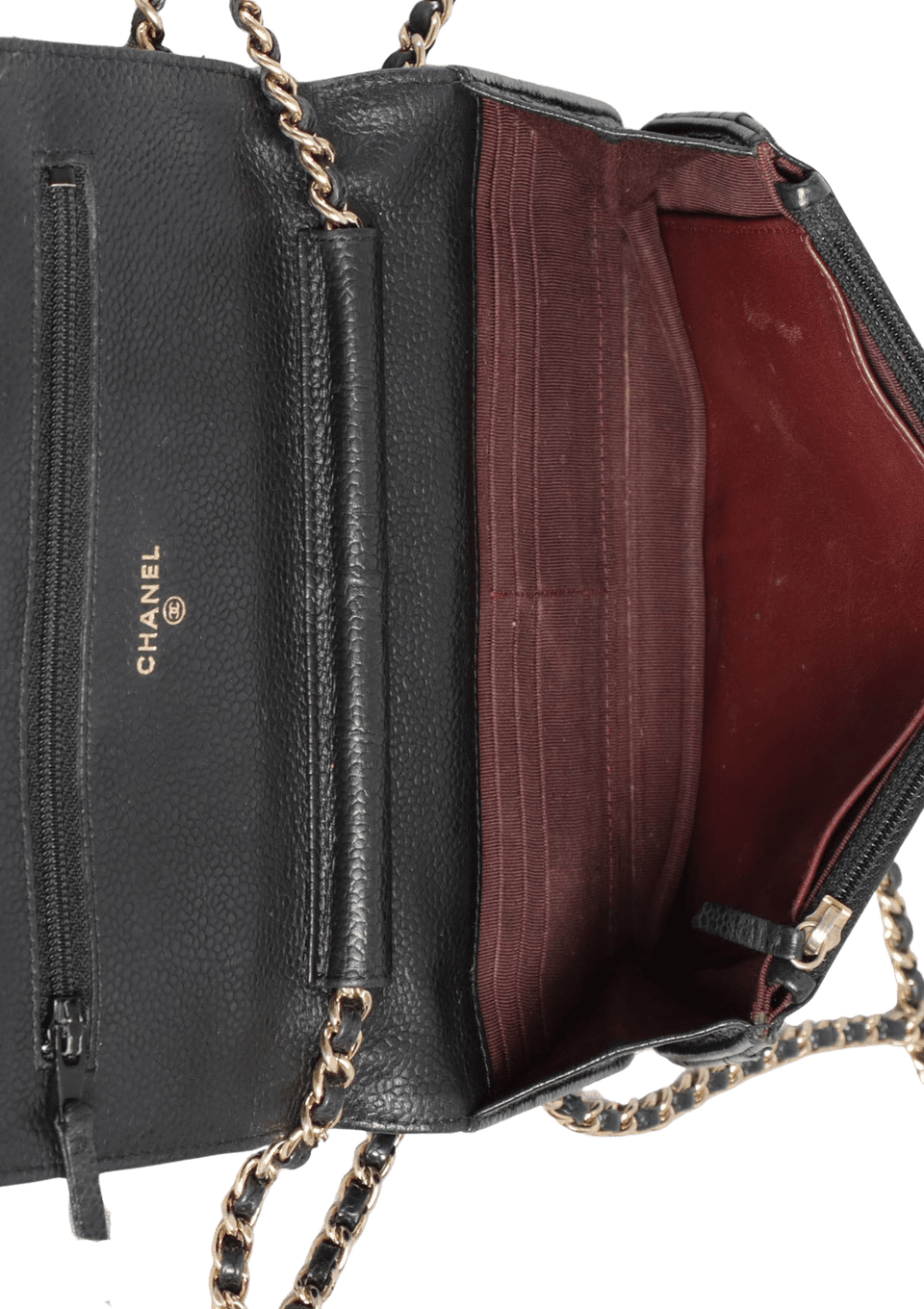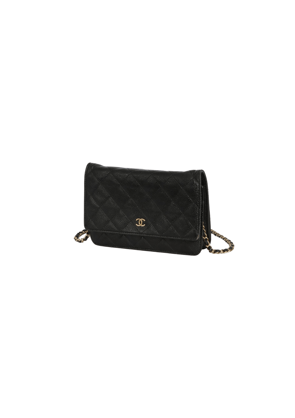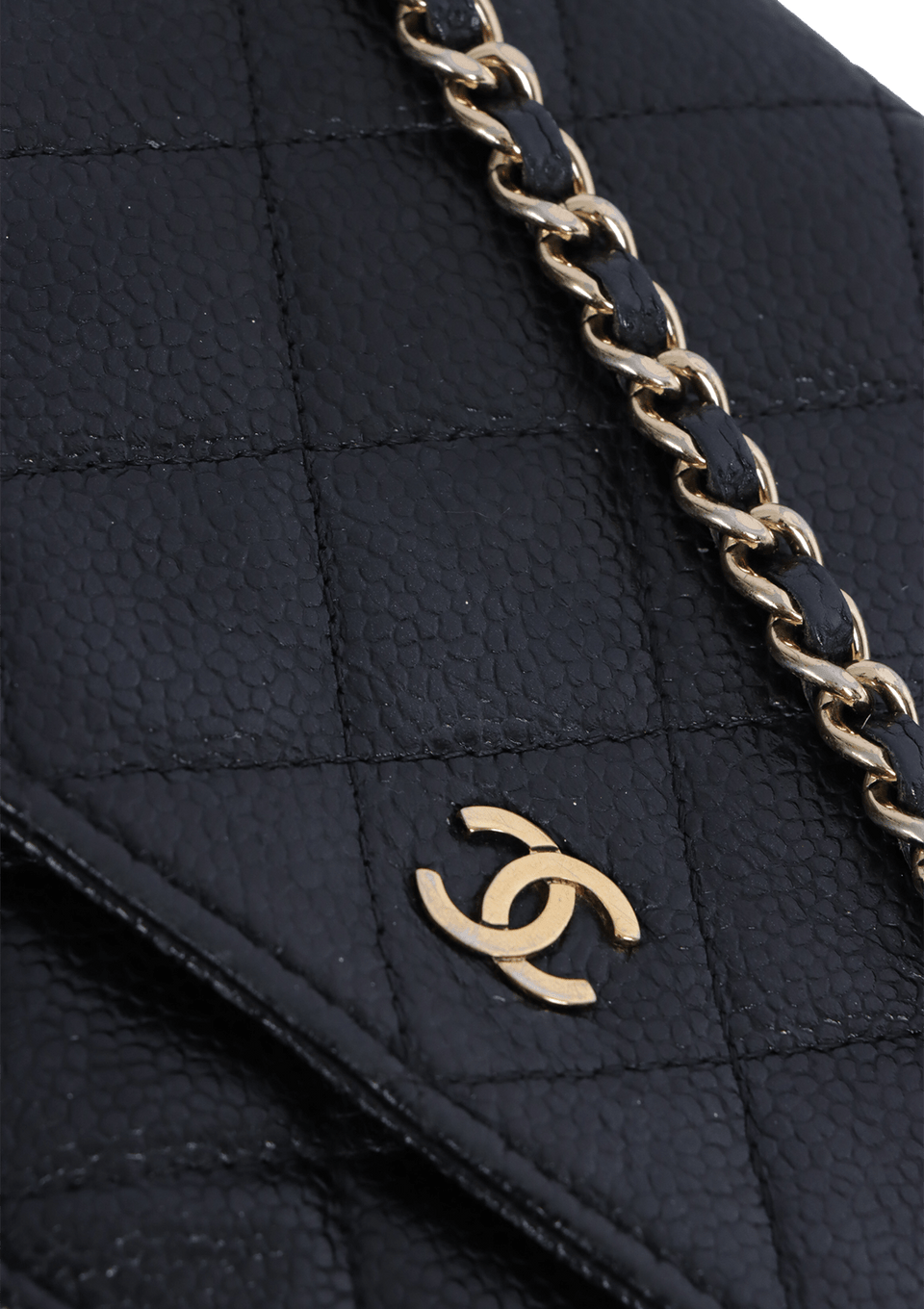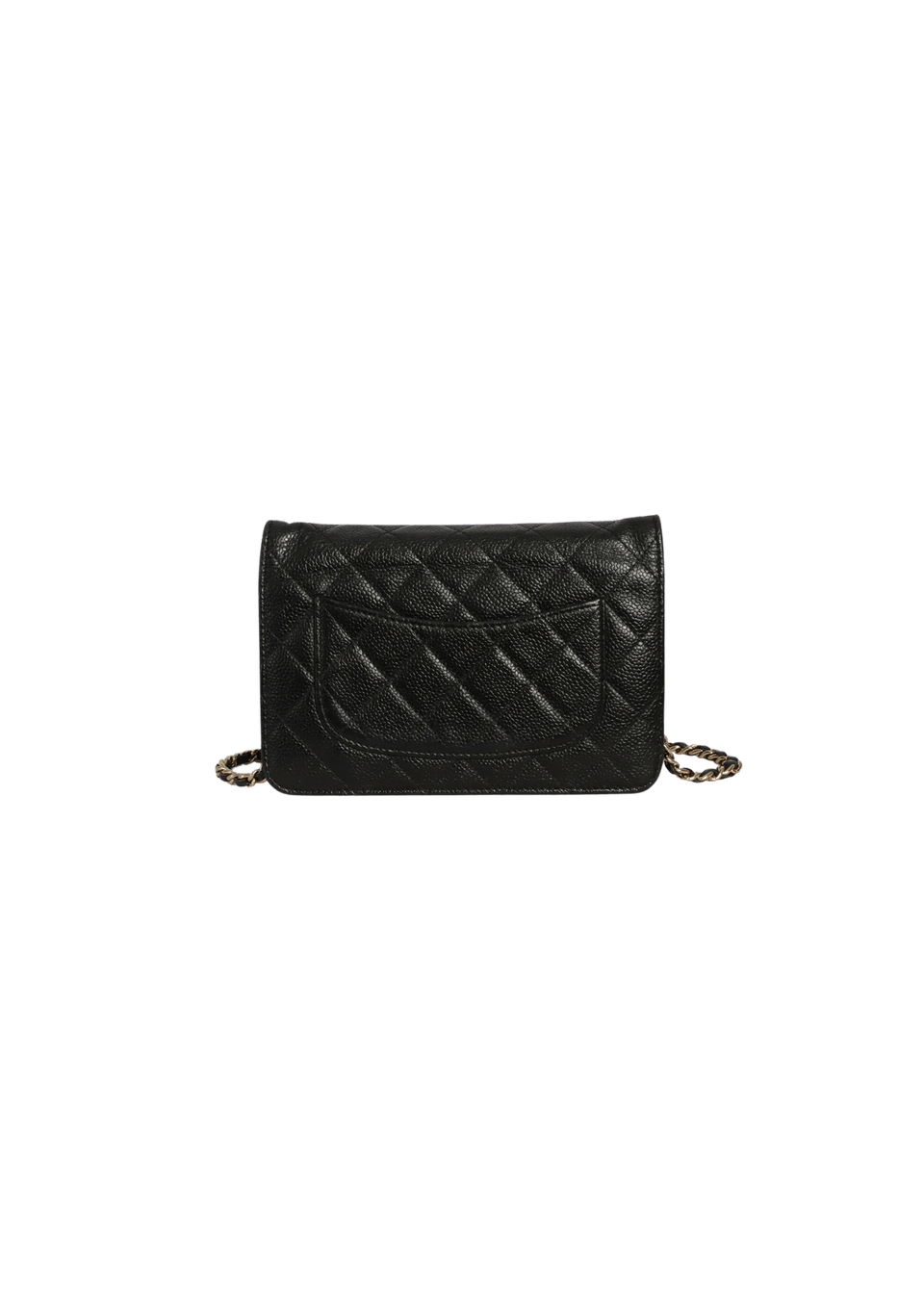 - Couro calfskin preto com acabamentos matelassê e Caviar;
