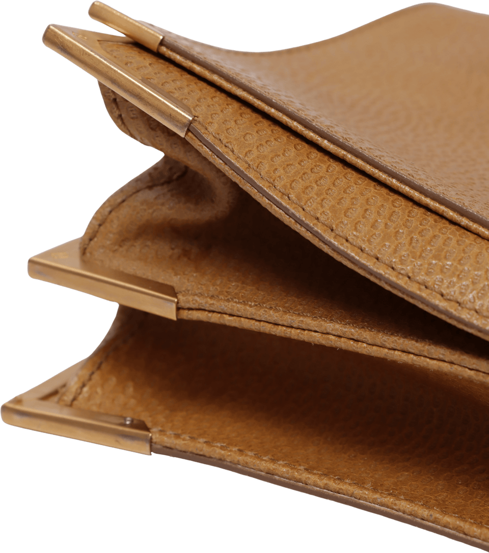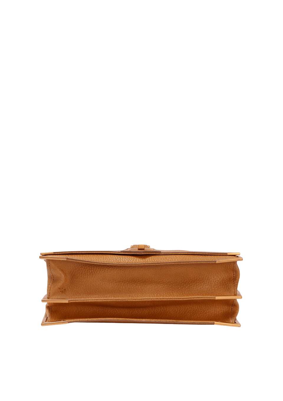 Bom, com aparência de usado. Apresenta iniciais gravadas em hot stamping, pequena deformação na estrutura, especialmente na parte frontal inferior, leves desgastes e manchas escurecidas e avermelhadas pelo couro, principalmente na aba e na base, couro ressecado, pequenos desgastes e fissuras nas selagens, especialmente nos acabamentos inferiores da alça, leves marcas de uso e descolorações nas ferragens, principalmente no fecho e nos cantos da base e pequenos desgastes, marcas de uso e manchas nas partes internas, especialmente no compartimento frontal.