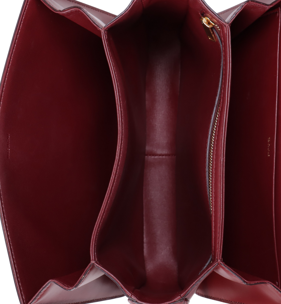 Bom, com aparência de usado. Apresenta leves marcas de uso, desgastes e manchas esbranquiçadas pelo couro, especialmente na parte central frontal, no canto inferior direito frontal, na parte superior central e na parte inferior de trás, pequenas descolorações, oxidações e marcas de uso nas ferragens do fecho e nos detalhes da alça, leves fissuras e aberturas nas selagens da alça, nos acabamentos laterais superiores e nas laterais da aba e pequenas manchas e marcas de uso pelo couro interno.