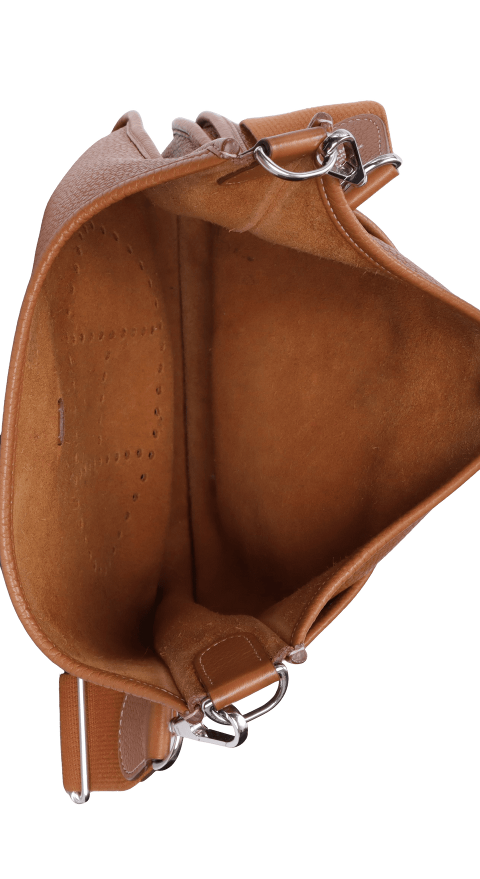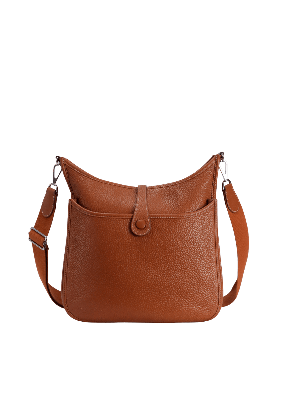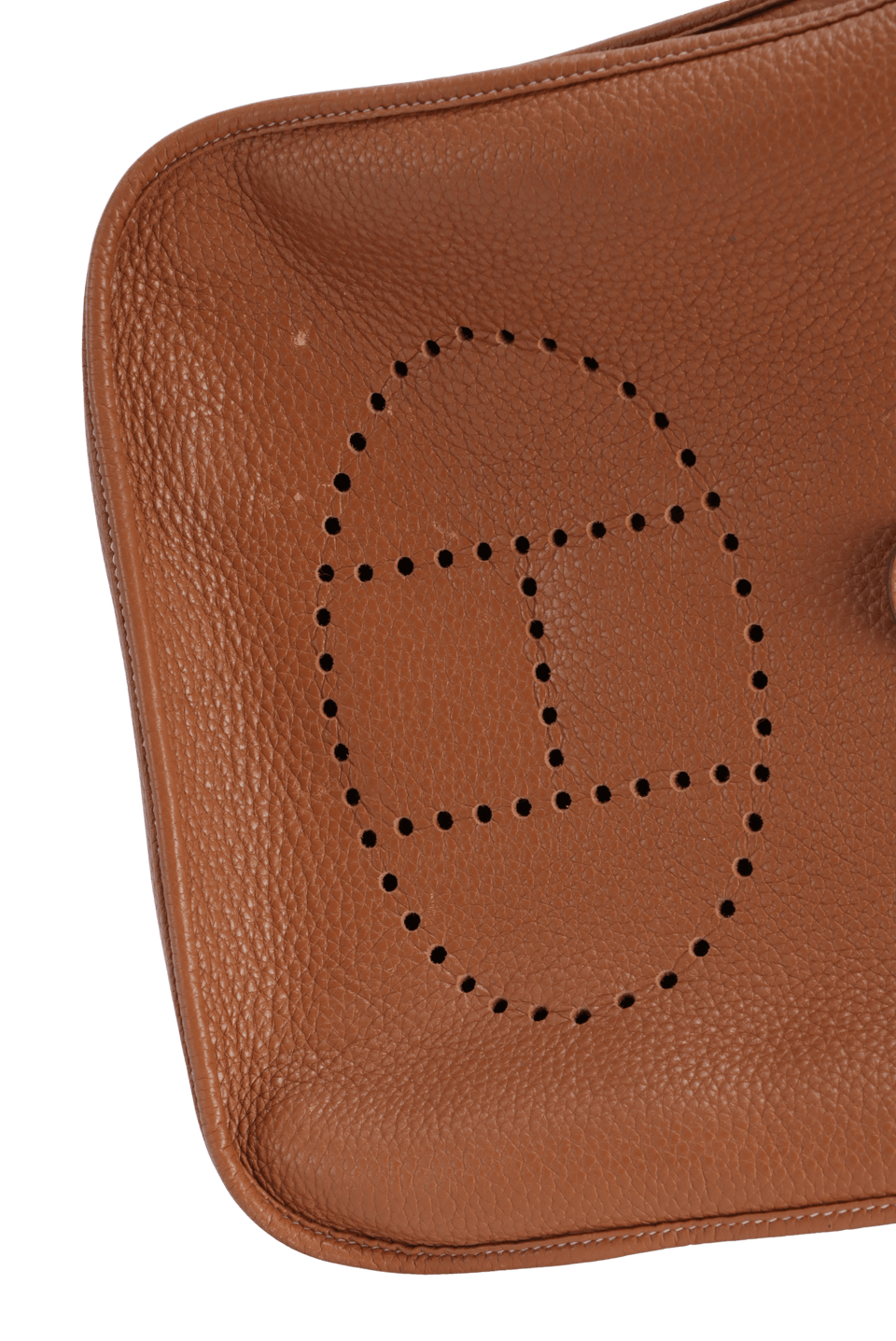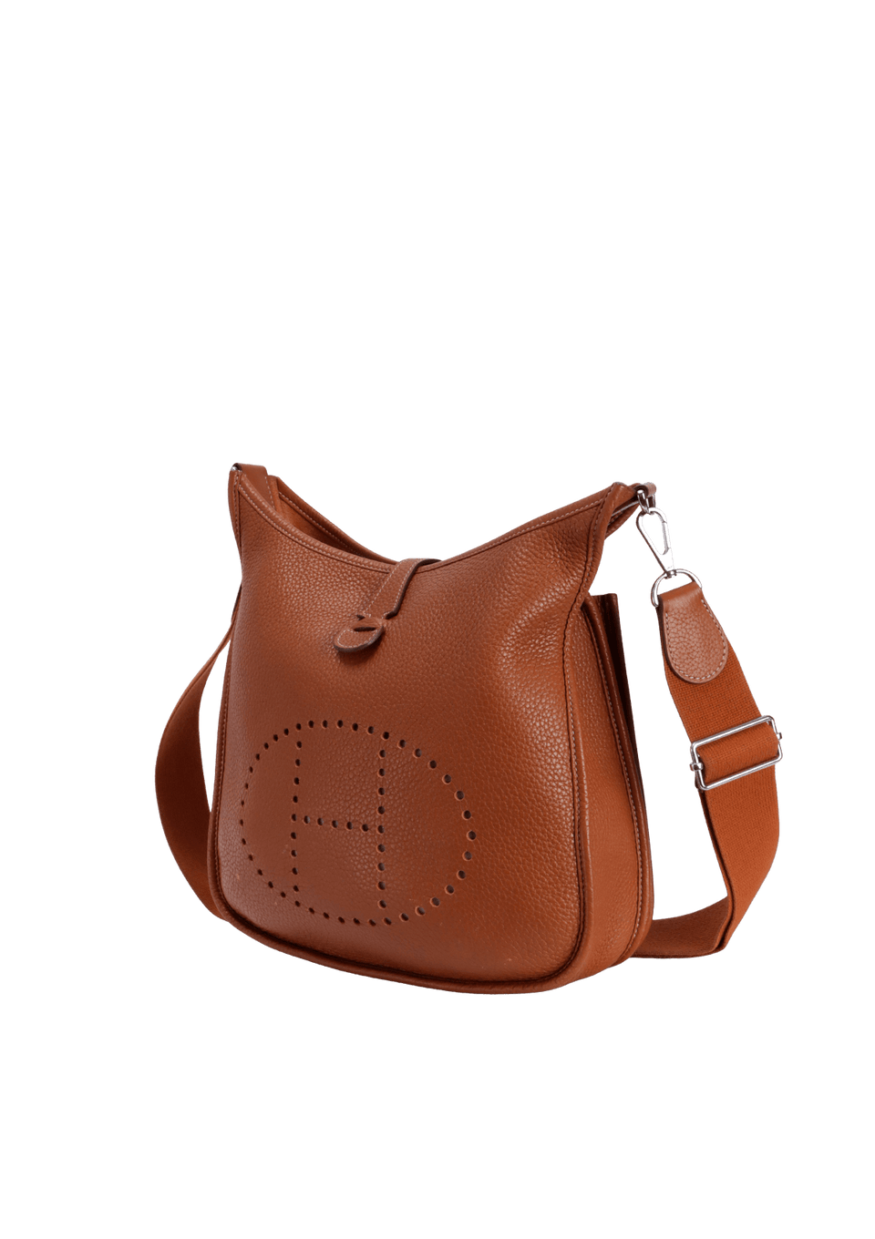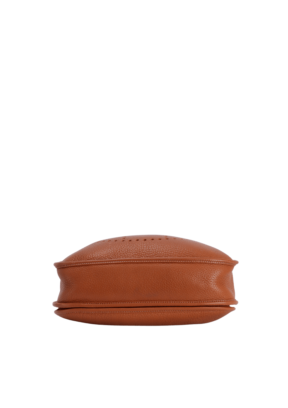 Bom, com aparência de usado. Apresenta leves desgastes e marcas de uso pelo couro, especialmente na parte frontal inferior, estrutura levemente deformada, principalmente na parte frontal inferior, couro levemente ressecado e opaco, leves desgastes, manchas escurecidas e esbranquiçadas pela alça, pequenos desgastes e fissuras nas selagens, especialmente nos acabamentos laterais superiores, leves marcas de uso e descolorações nas ferragens e nos metais, principalmente no botão de fechamento e pequenos desgastes, marcas de uso, manchas o odor de mofo na parte interna.