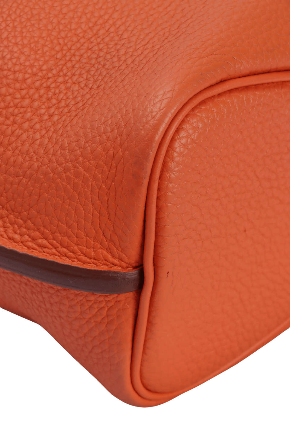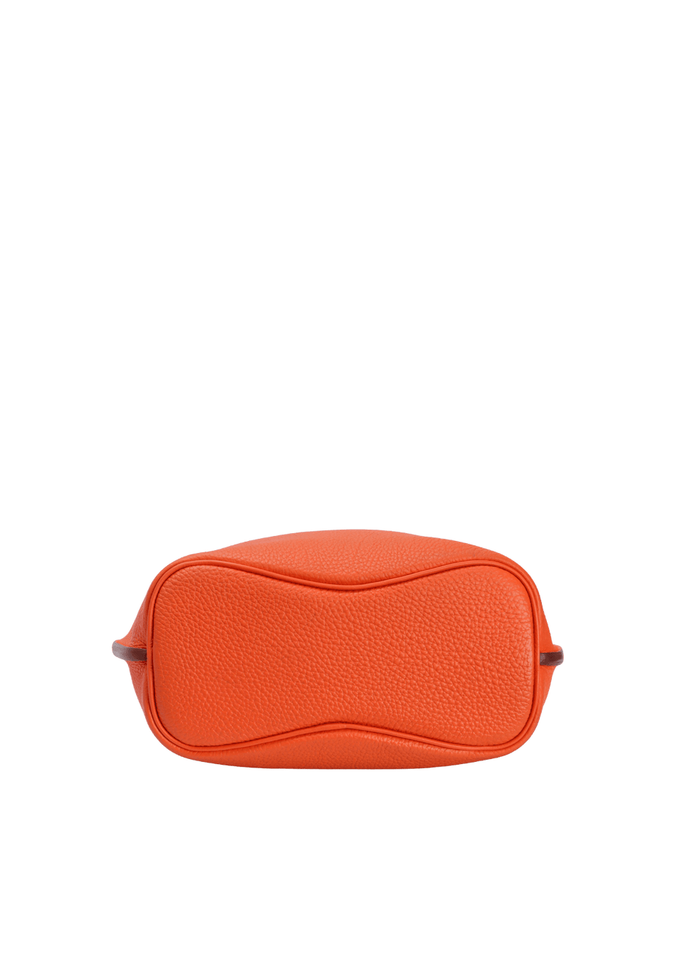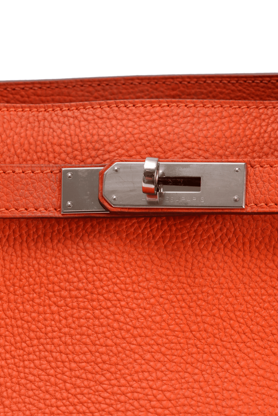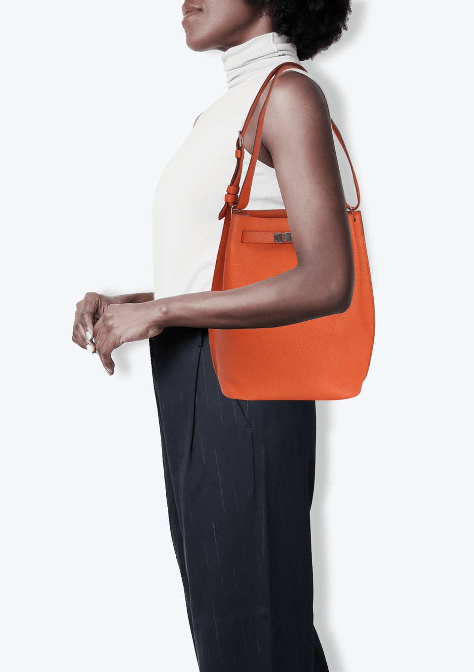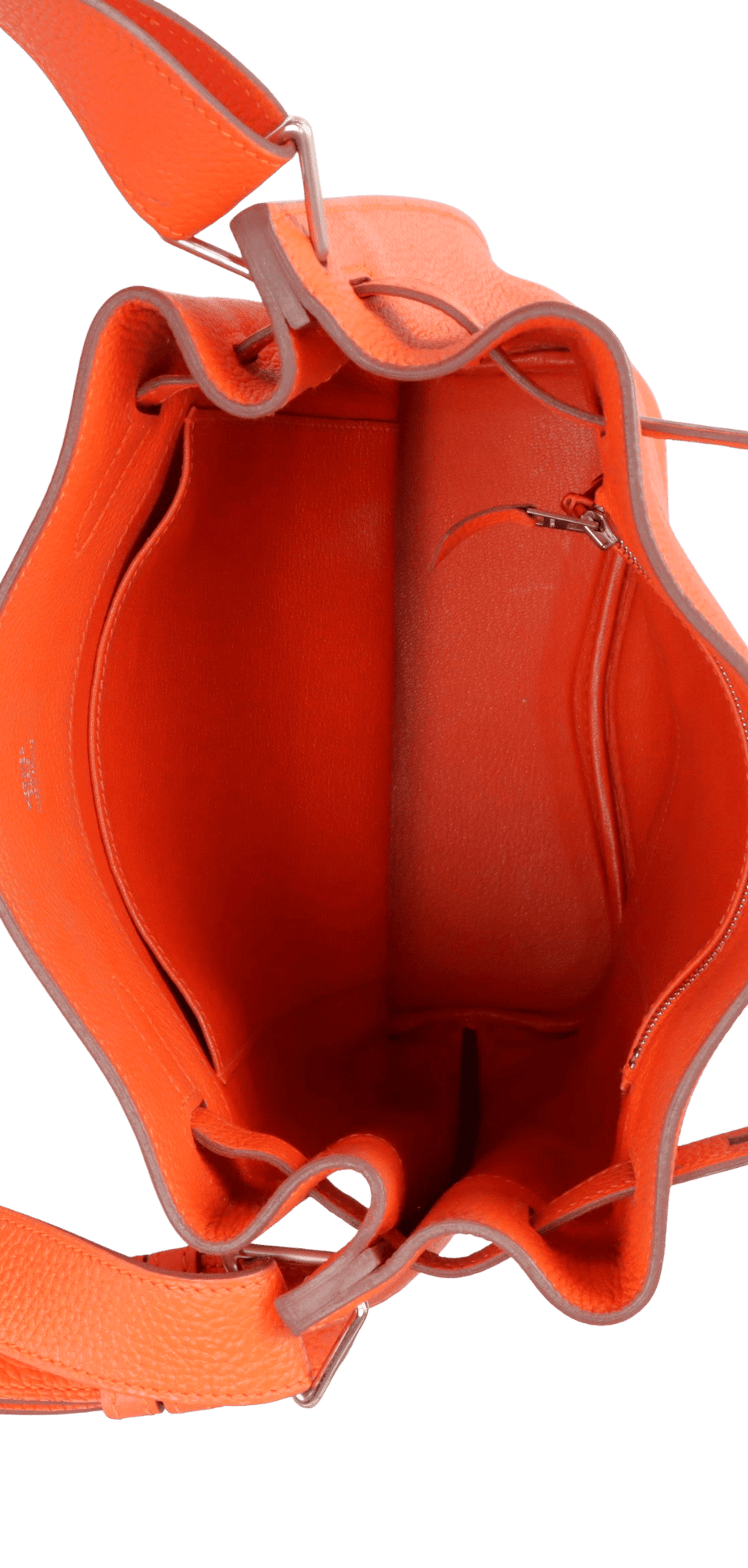 Condição: Bom, com aparência de usado. Apresenta leves desgastes, marcas de uso, manchas escurecidas pelo couro, especialmente na parte frontal inferior e na parte superior do lado esquerdo, pequena deformação na estrutura, principalmente na parte posterior inferior, leves marcas de uso e oxidações nas ferragens, especialmente no fecho e no cursor interno, pequenos desgastes, manchas e fissuras nos acabamentos, principalmente nos acabamentos da fivela e na parte inferior da alça e leves desgastes, marcas de uso e manchas esbranquiçadas na parte interna.