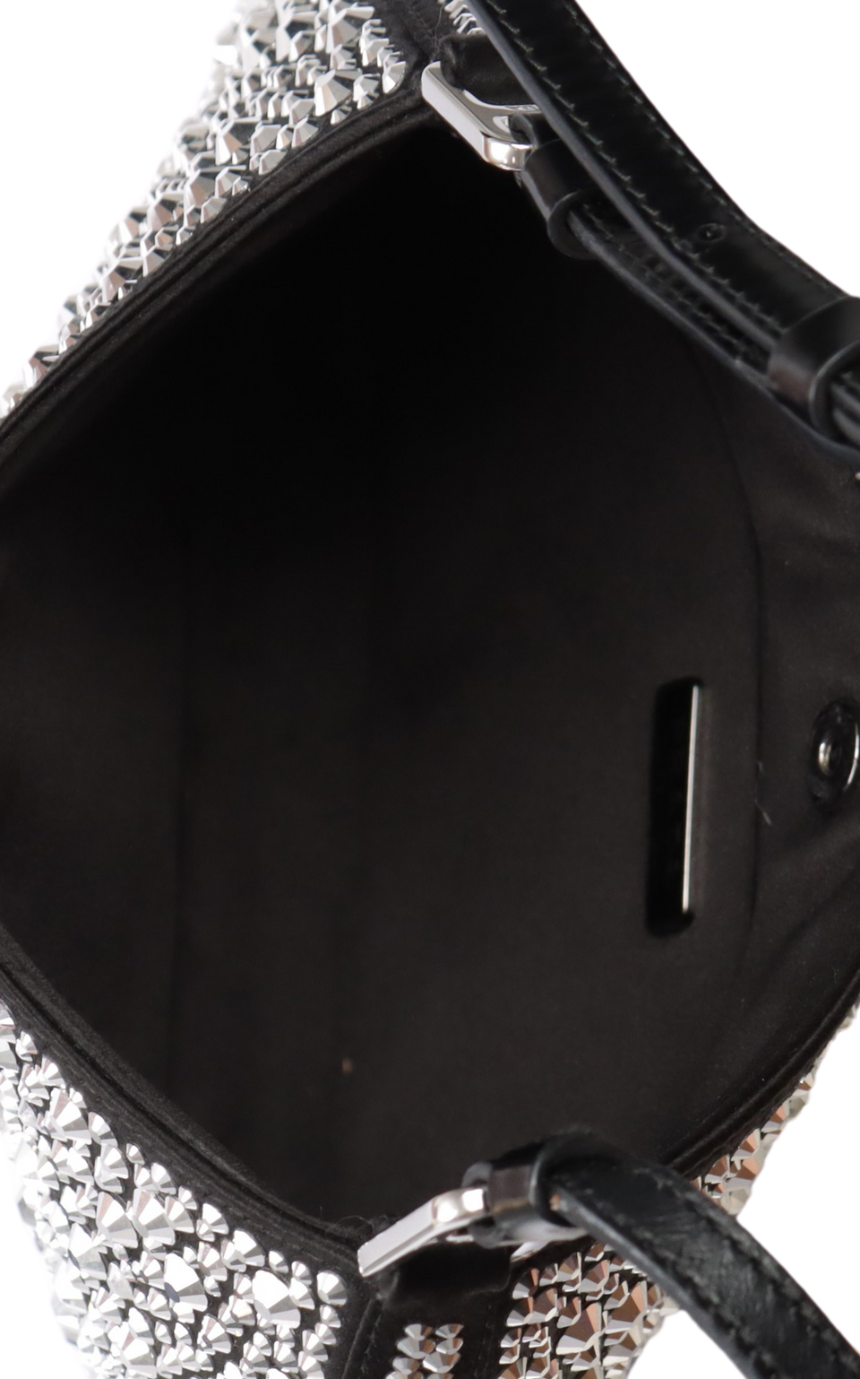 Descrição do Material: Couro calfskin preto revestido por cetim preto com aplicaçāo de cristais transparentes