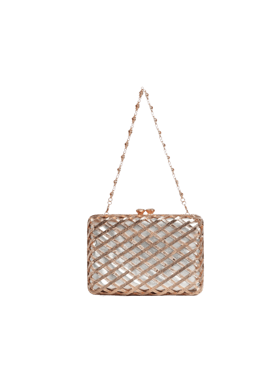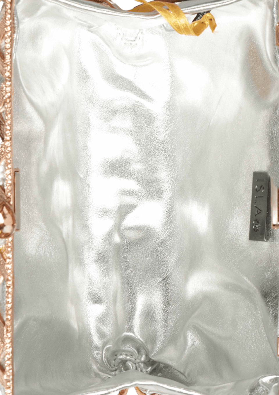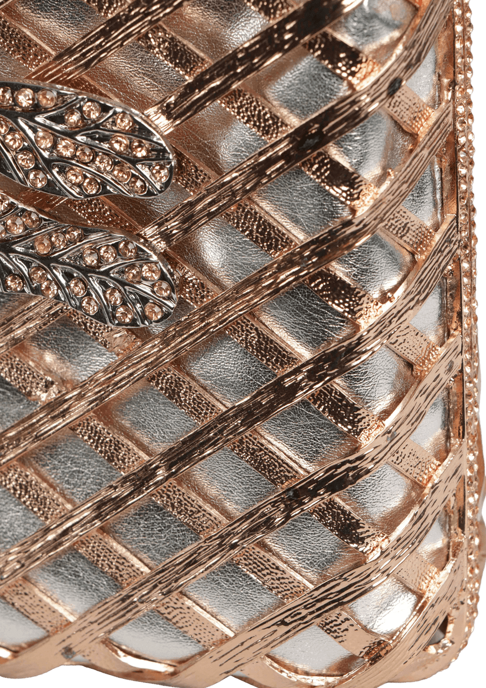- Couro prateado com detalhes em metal rosé e prateado;