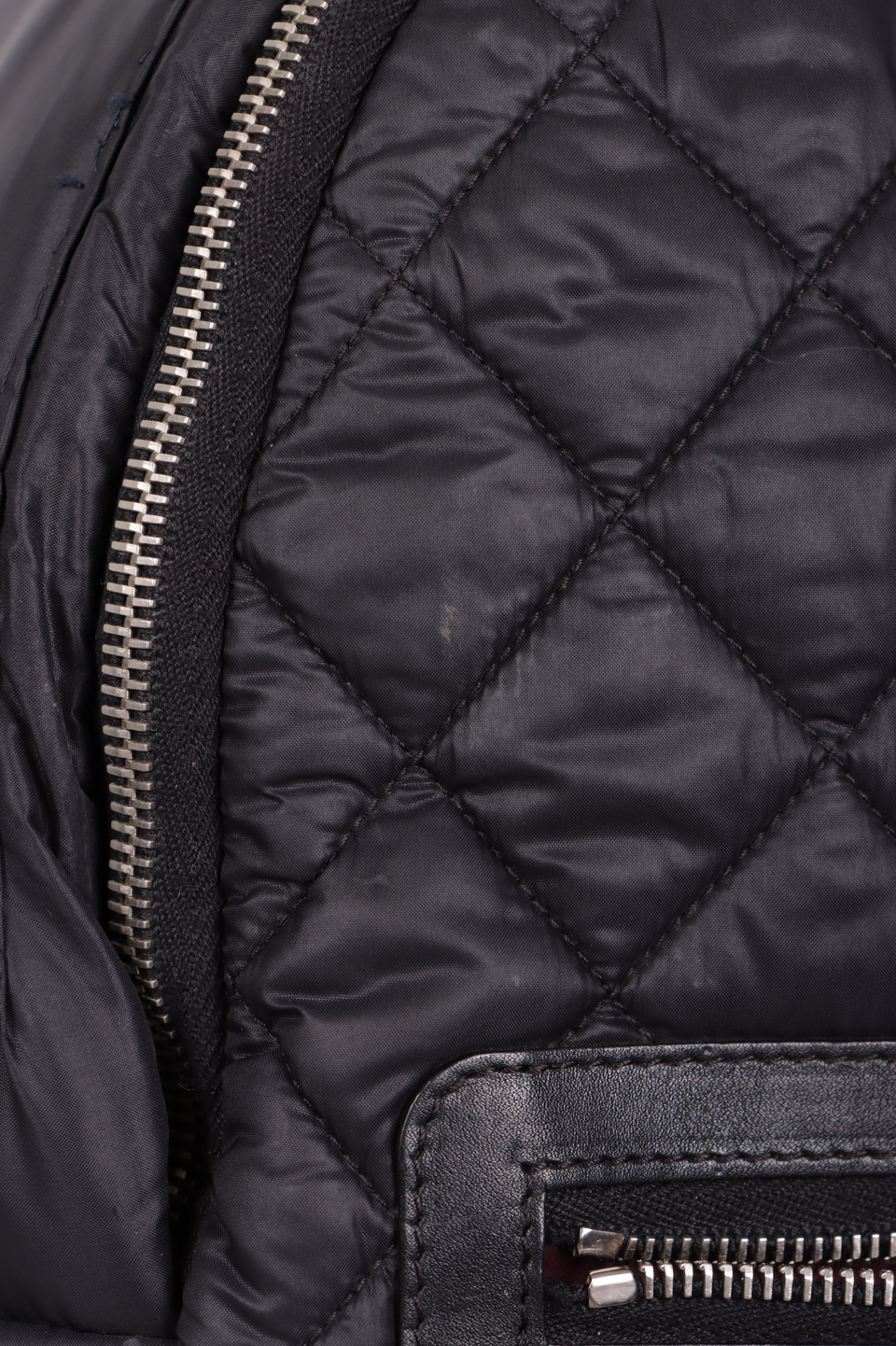 Bom, com aparência de usado. Apresenta leves manchas esbranquiçadas pelo nylon, especialmente do lado esquerdo frontal, parte superior do lado direito de trás e na alça de ombro do lado direito, pequenas marcas de uso e descolorações nas ferragens dos puxadores dos cursores e nos detalhes das alças de ombro, leves marcas de uso nos detalhes em couro da parte frontal e nos detalhes laterais da alça de mão e levíssimas manchas de uso pelo forro.