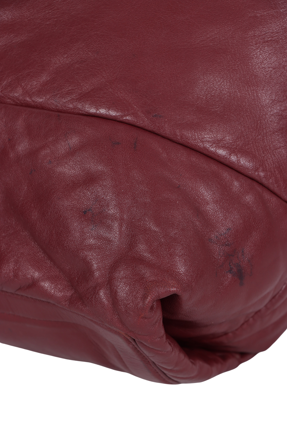 Regular. Apresenta severas manchas de uso e desgastes pelo couro, especialmente na parte inferior do lado direito frontal, cantos da base, extremidades superiores, na parte inferior de trás e alças, consideráveis fissuras e aberturas nas selagens da tira de couro do fecho, notáveis marcas de uso, descolorações e oxidações nas ferragens do fecho e do puxador do cursor, severas marcas de uso e desgastes pelo couro interno e considerável odor de uso.