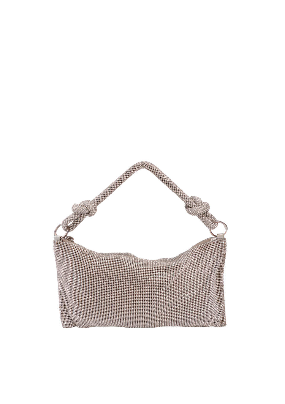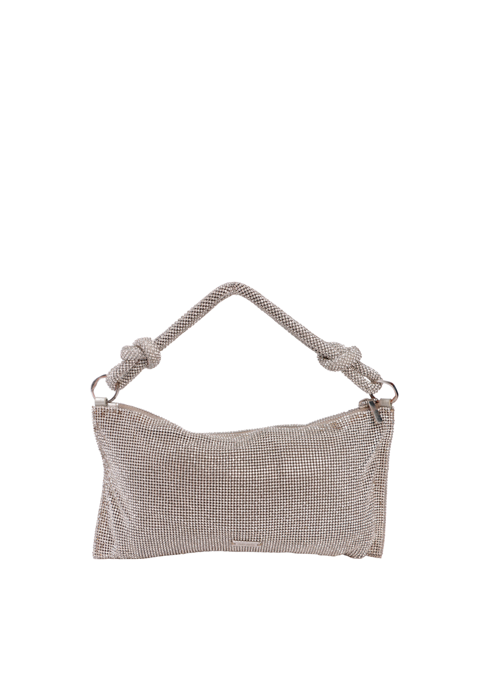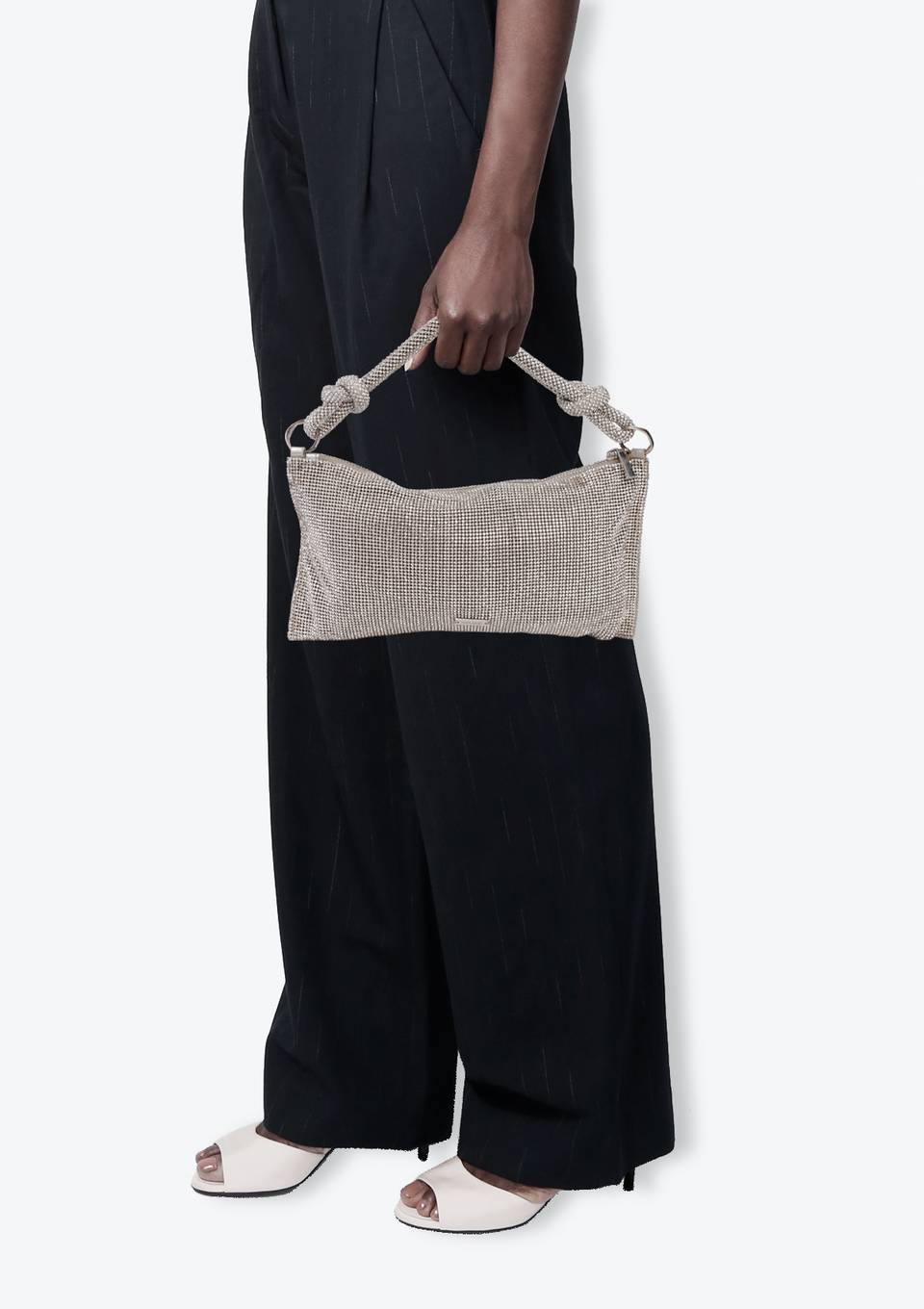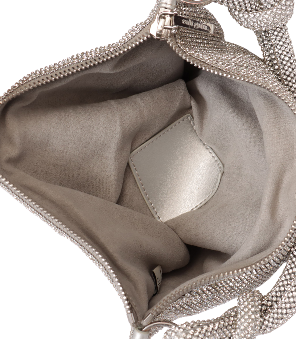Bom, com aparência de usado. Apresenta ausência de cristais pela bolsa, especialmente na lateral esquerda frontal, leves marcas de uso e descolorações nas ferragens laterais, no detalhe frontal e no puxador do cursor, levíssimas marcas de uso nos detalhes em couro nas laterais superiores e levíssimas manchas de uso na parte superior do forro.