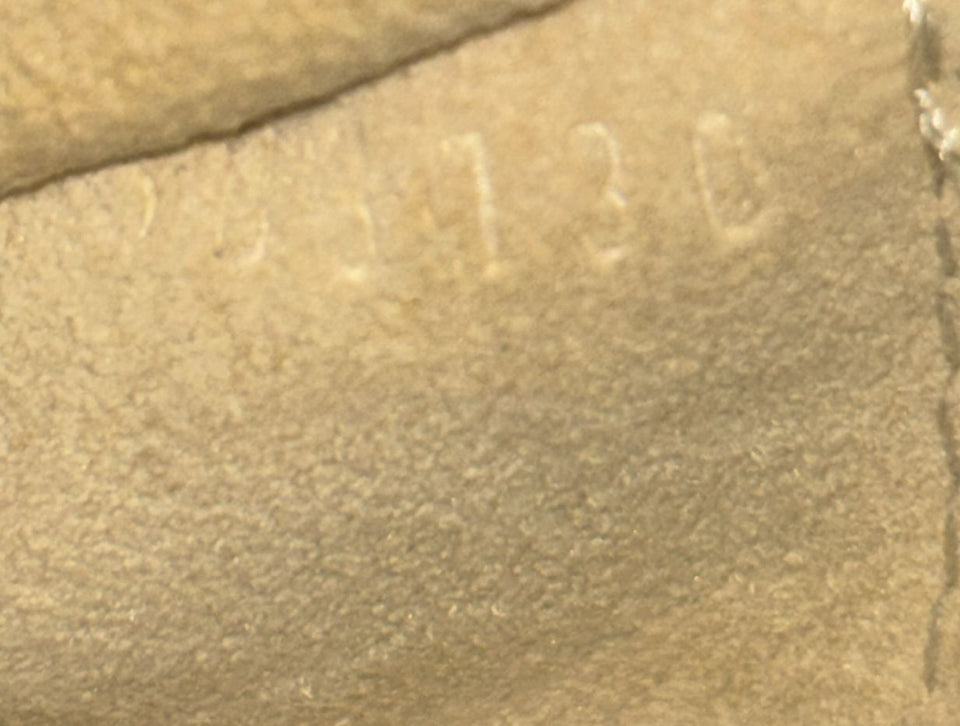 Regular. Apresenta severas descolorações, marcas de uso e oxidações nas ferragens da logomarca frontal e nos detalhes da alça, notáveis desgastes, manchas escurecidas e marcas de uso nos detalhes em couro, principalmente na parte central superior, extremidades superiores, cantos da base e alça, considerável deformidade na parte central da estrutura da alça e severas manchas de uso pelo forro.