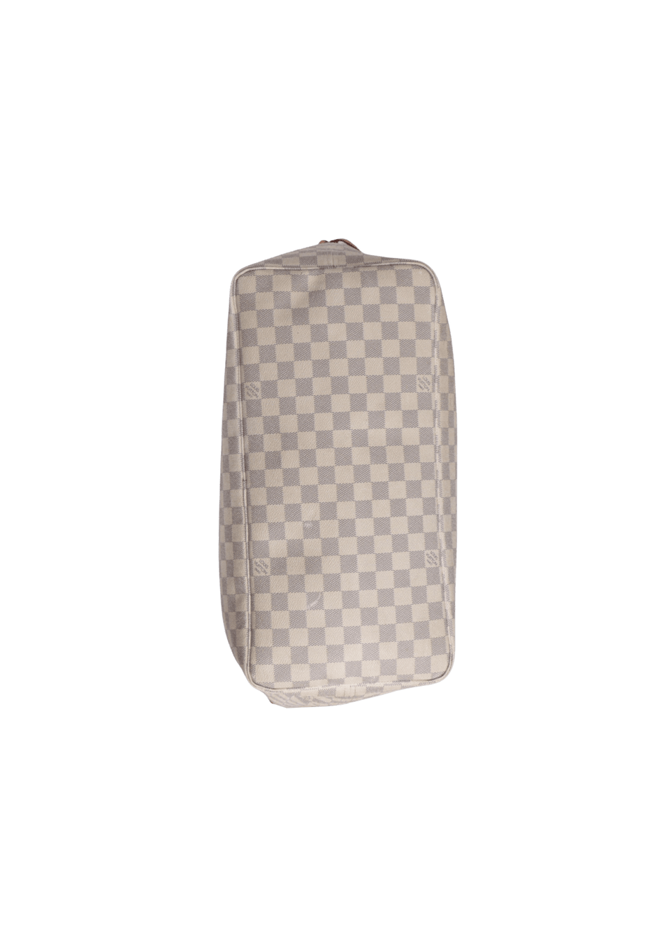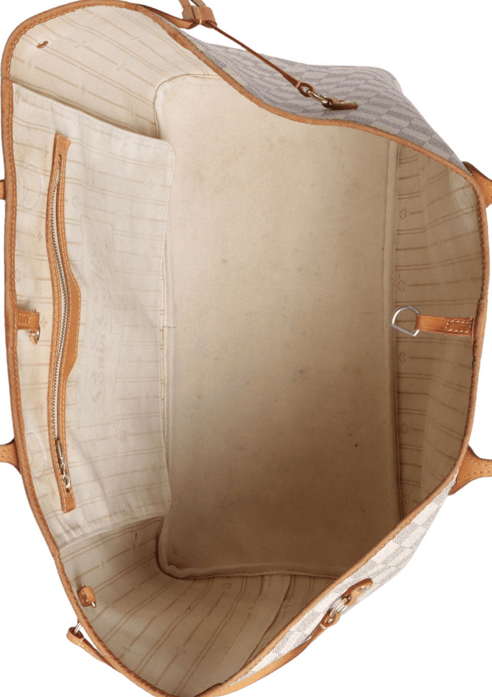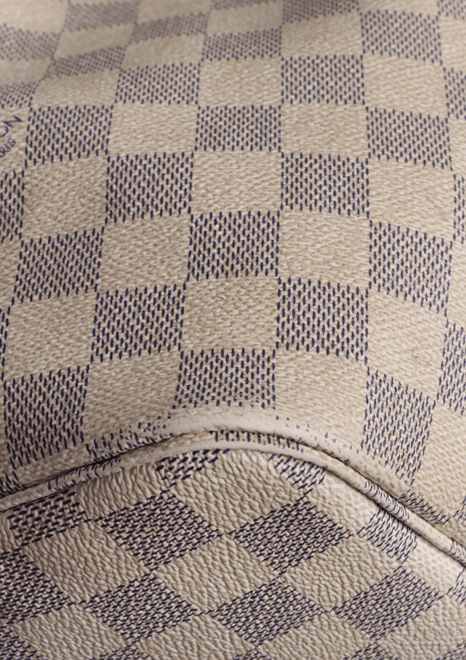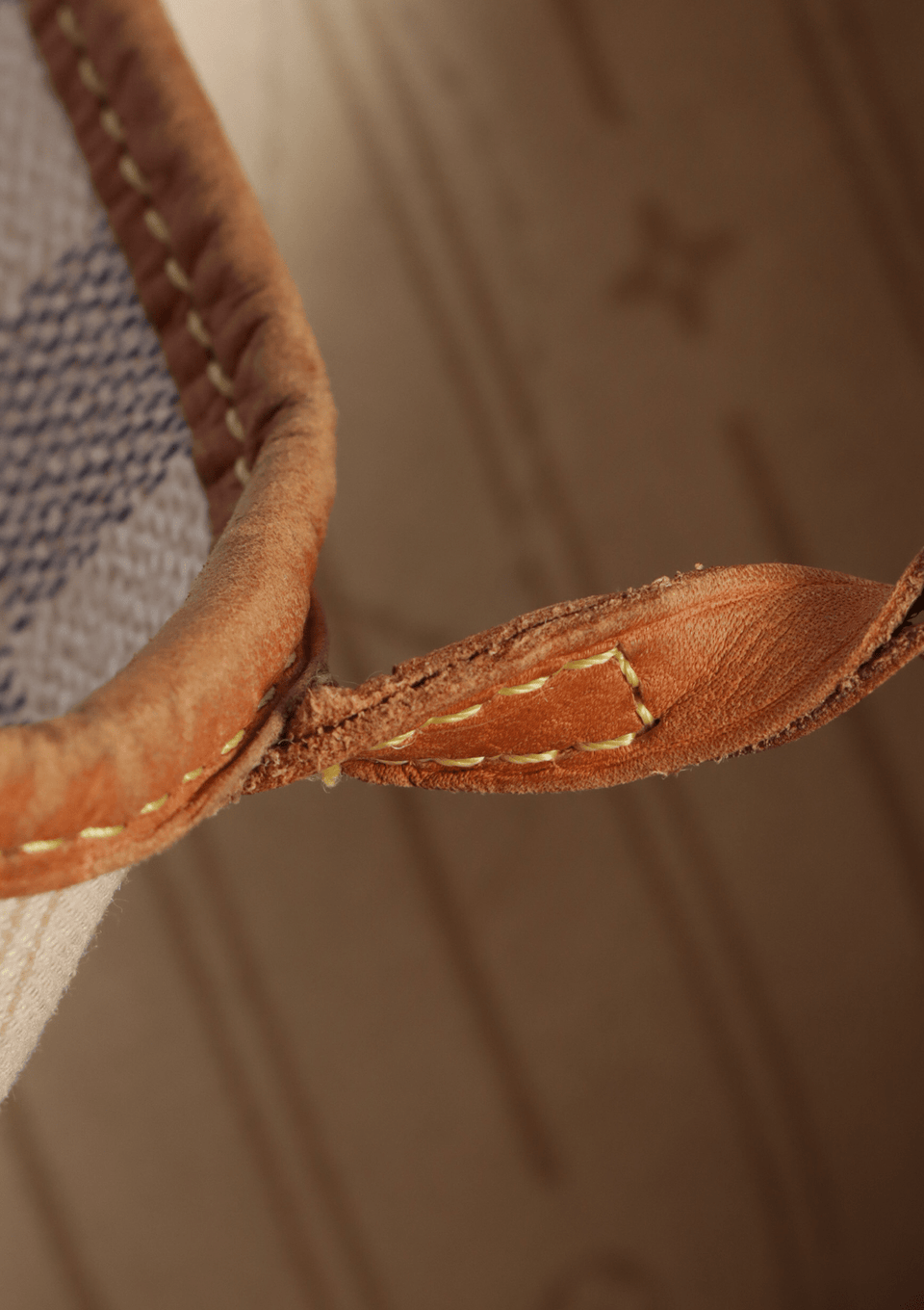 Condição: Bom, com aparência de usado. Apresenta leves desgastes pelo canvas, especialmente nos cantos da base, canvas levemente amarelado pelo uso, leves manchas escurecidas pelo couro no acabamento superior e alças, pequena fissura na tira de fechamento, leves descolorações nas ferragens e manchas de uso por toda a parte interna.